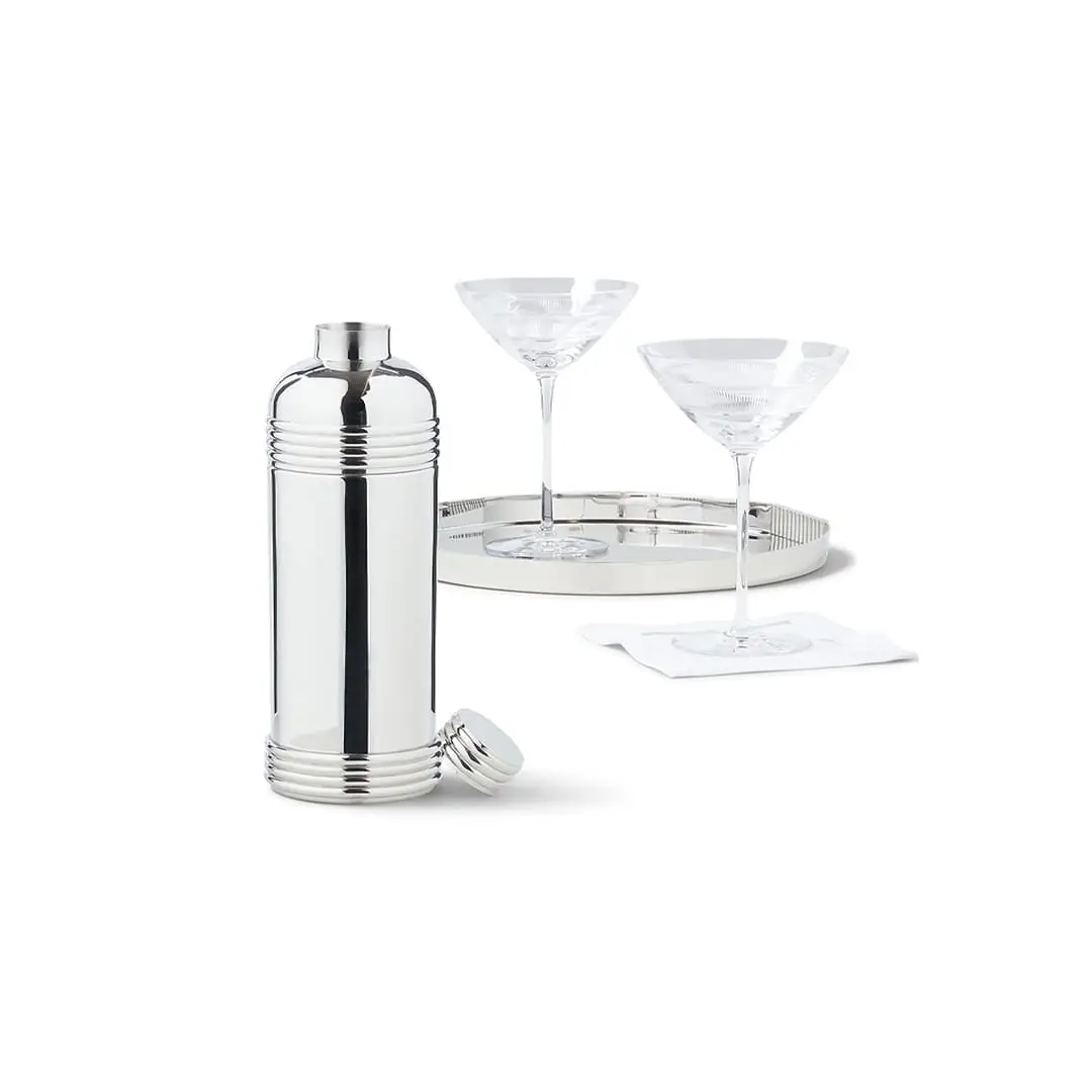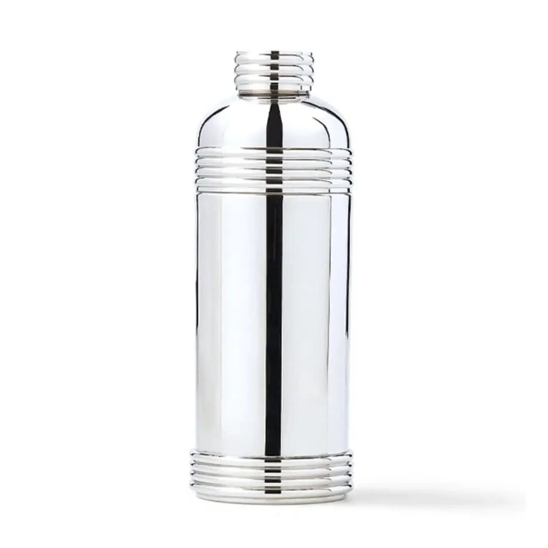 Elegant beige cocktail shaker with golden capGold and silver perfume bottle on cream background