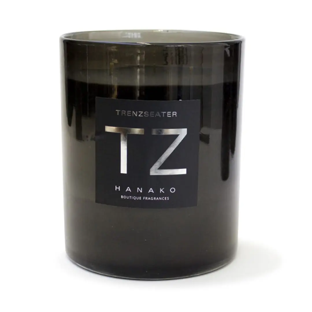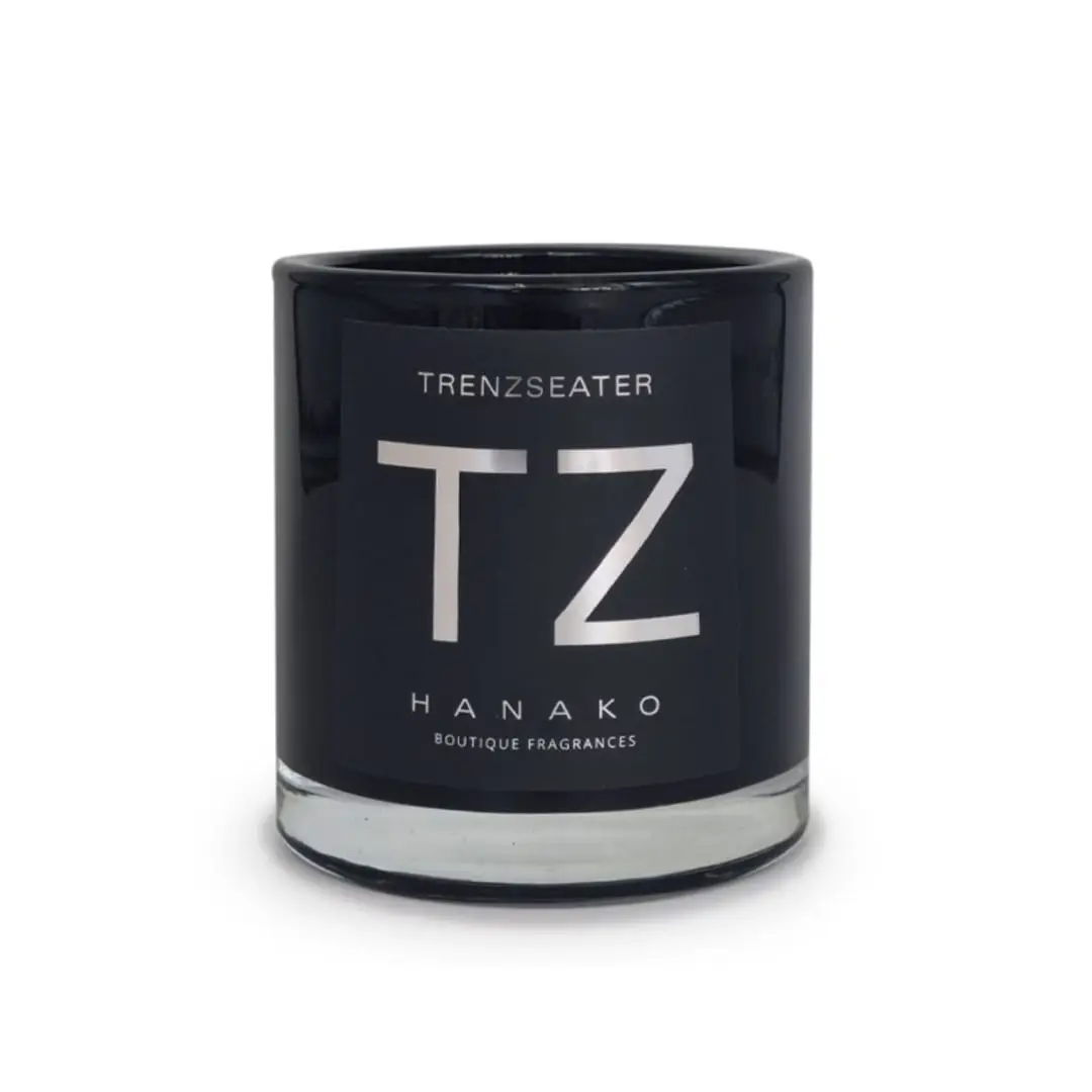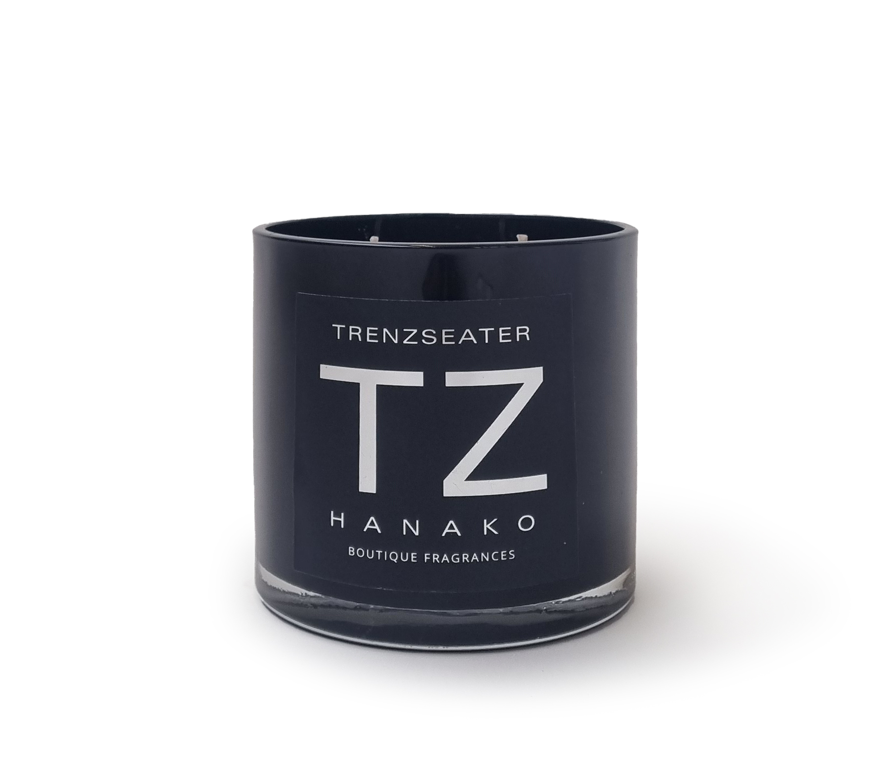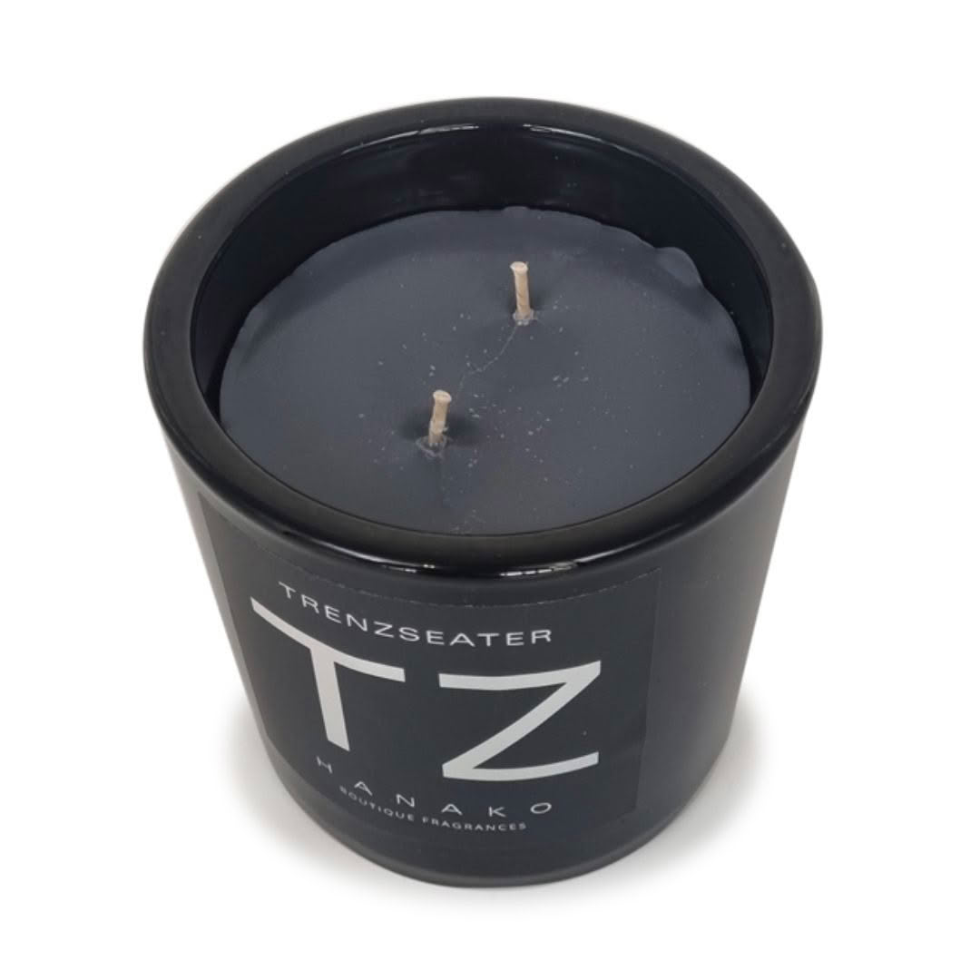 Black Hanako boutique fragrances candle by TrenzseaterClose-up of black scented candle with 'TZ' logo