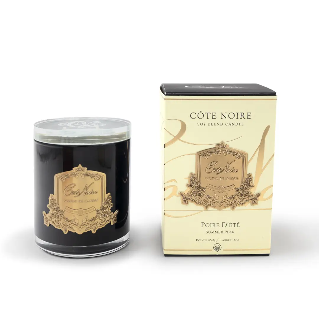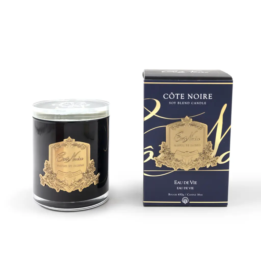 Apsley scented soy candle with black and white designWoman holding large spotted lit candle