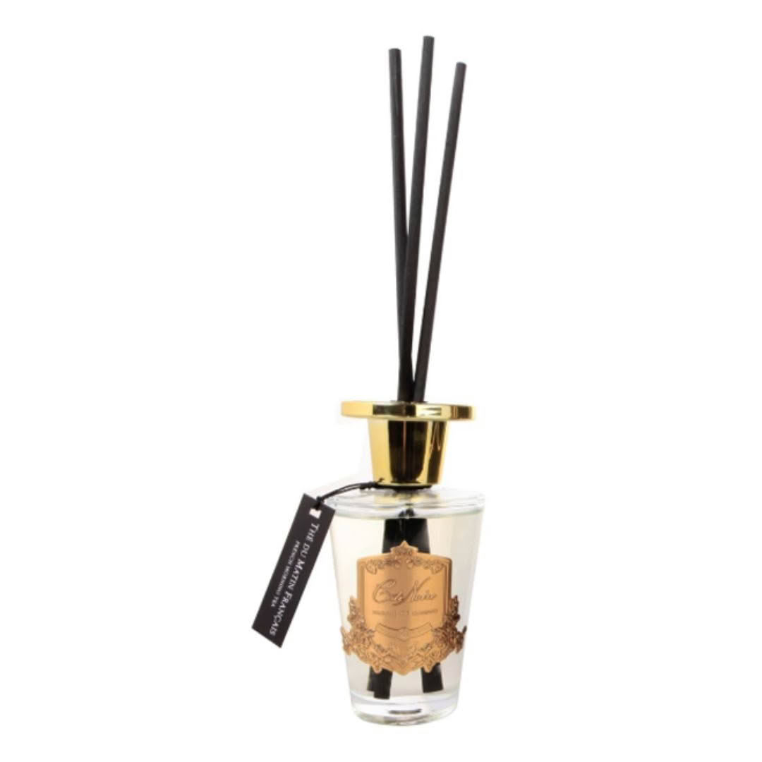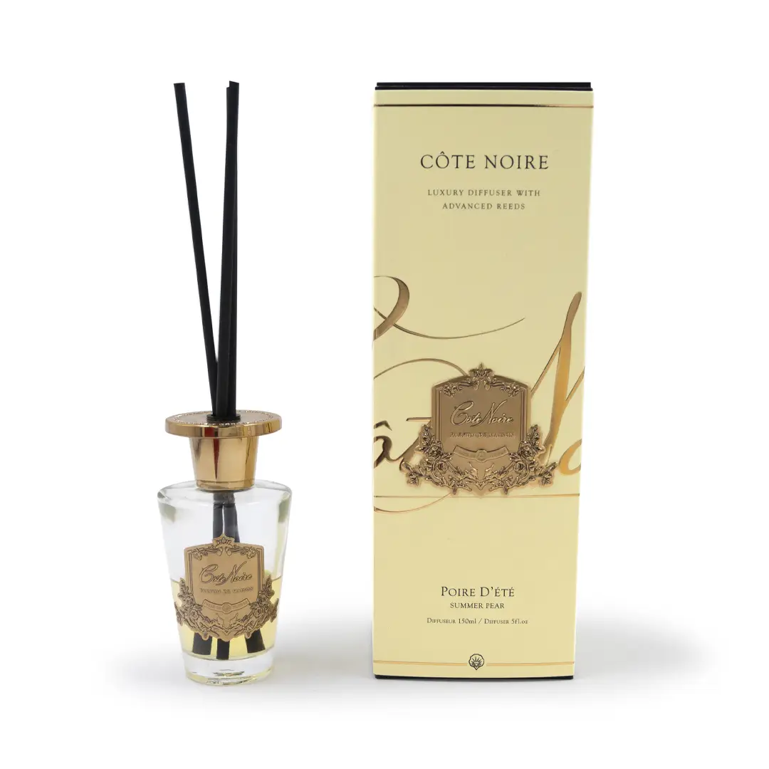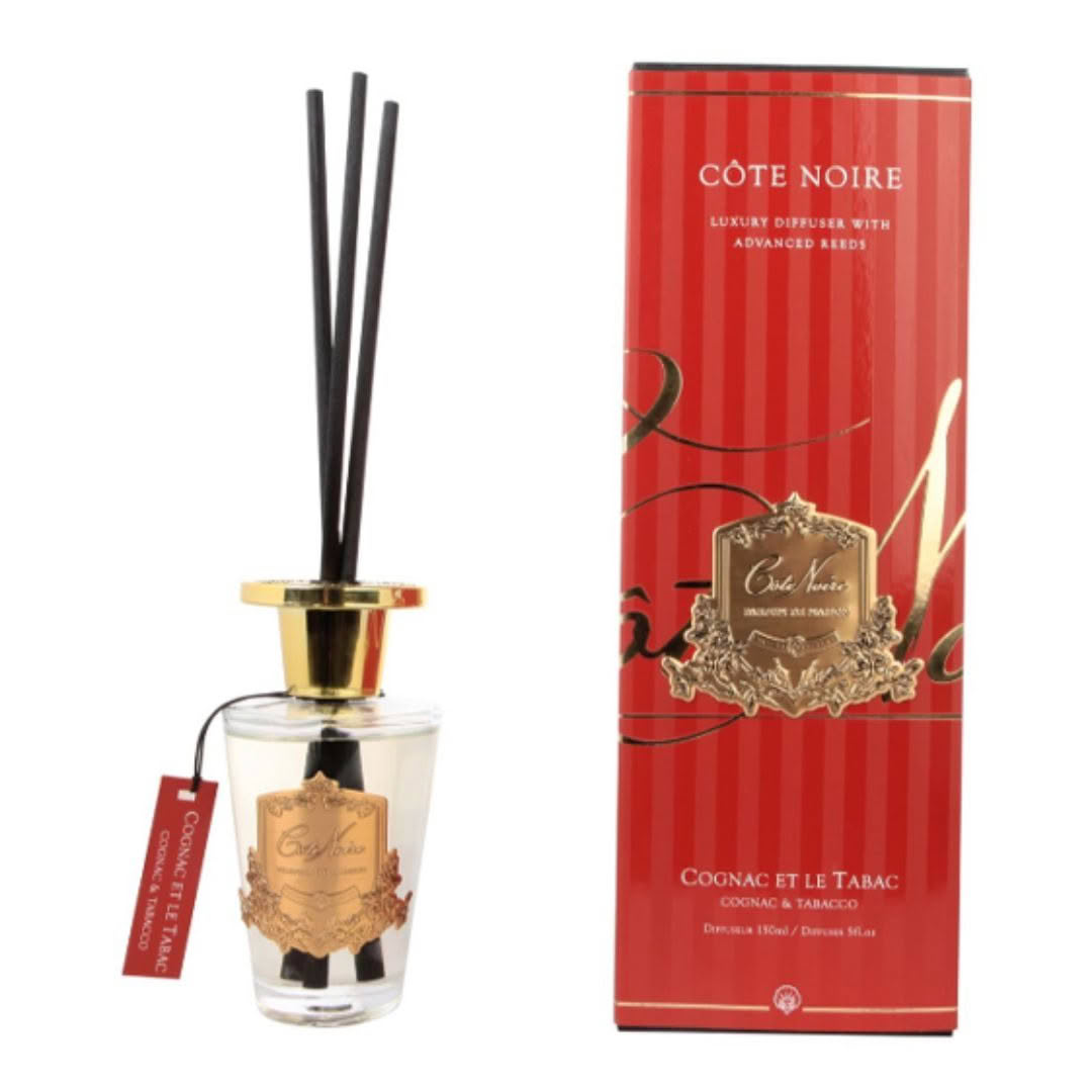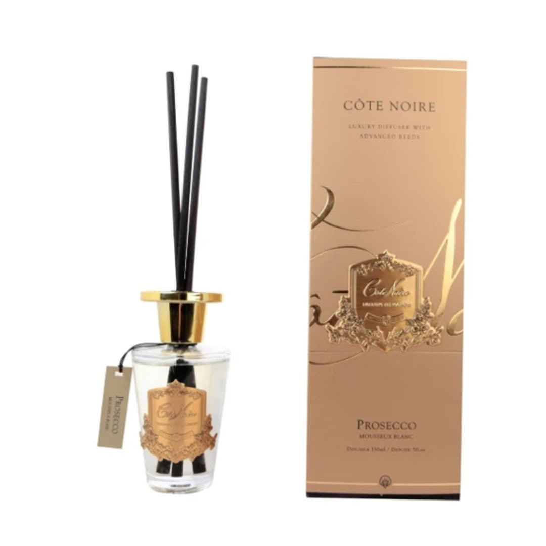 Apsley diffuser set with bottle, reeds, and labelled boxLit candle and diffuser on tray, elegant home decor