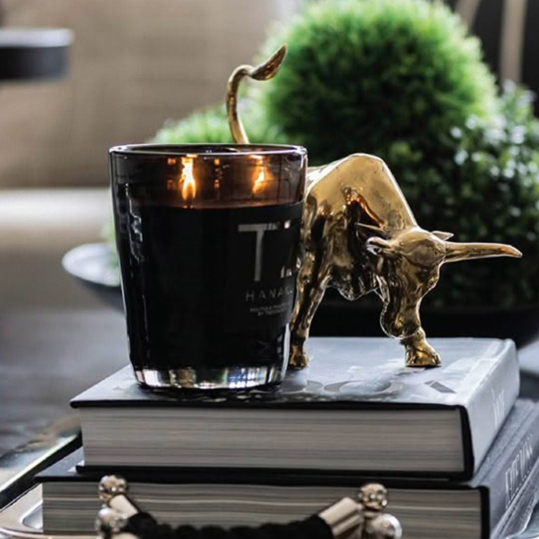 Leopard print candle in black packagingAntique iron urn with tortoiseshell pattern glass on top