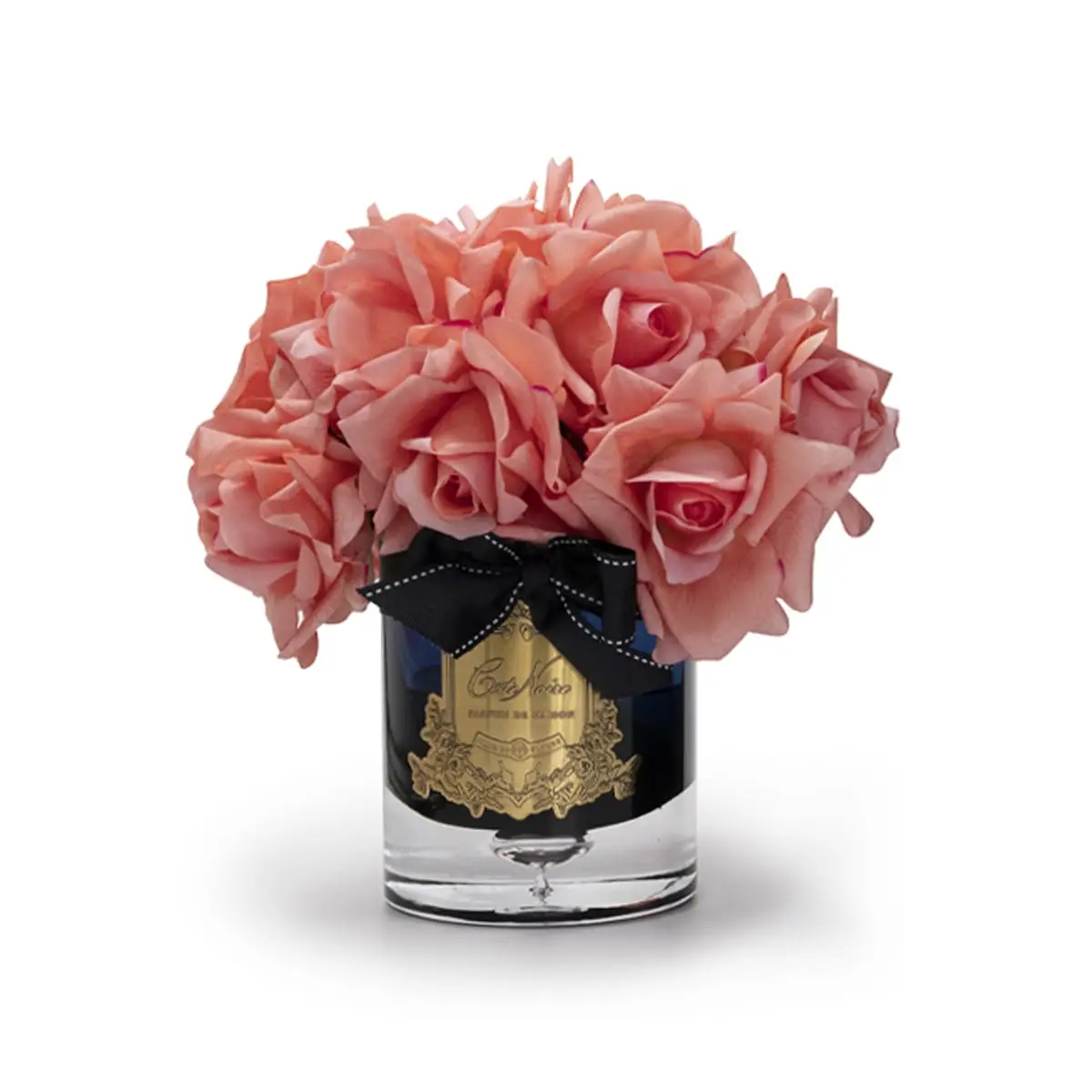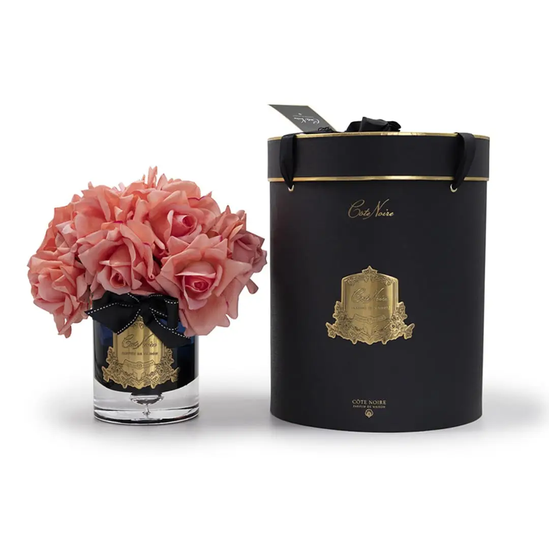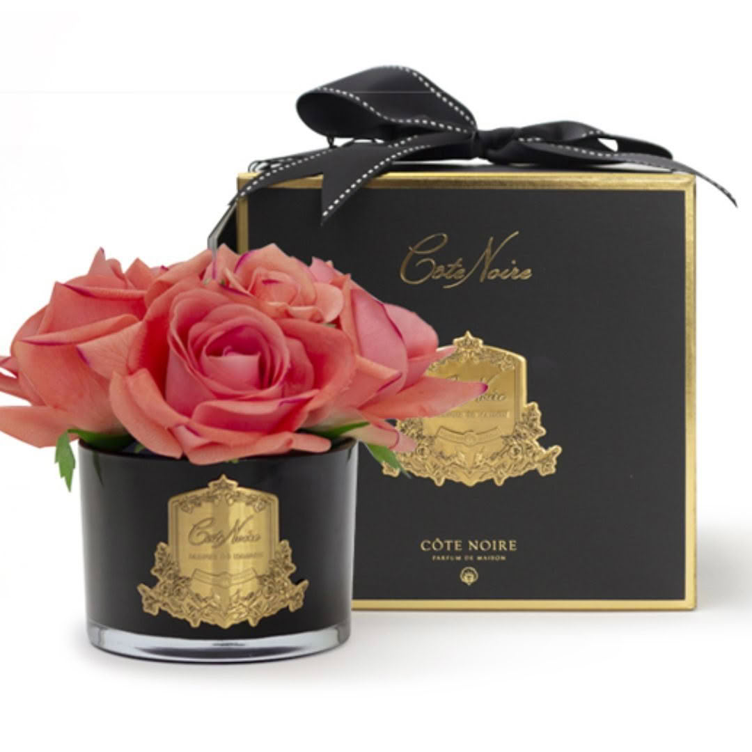 Leopard print scented candle with black packagingPink tulips in decorative vase on wooden table