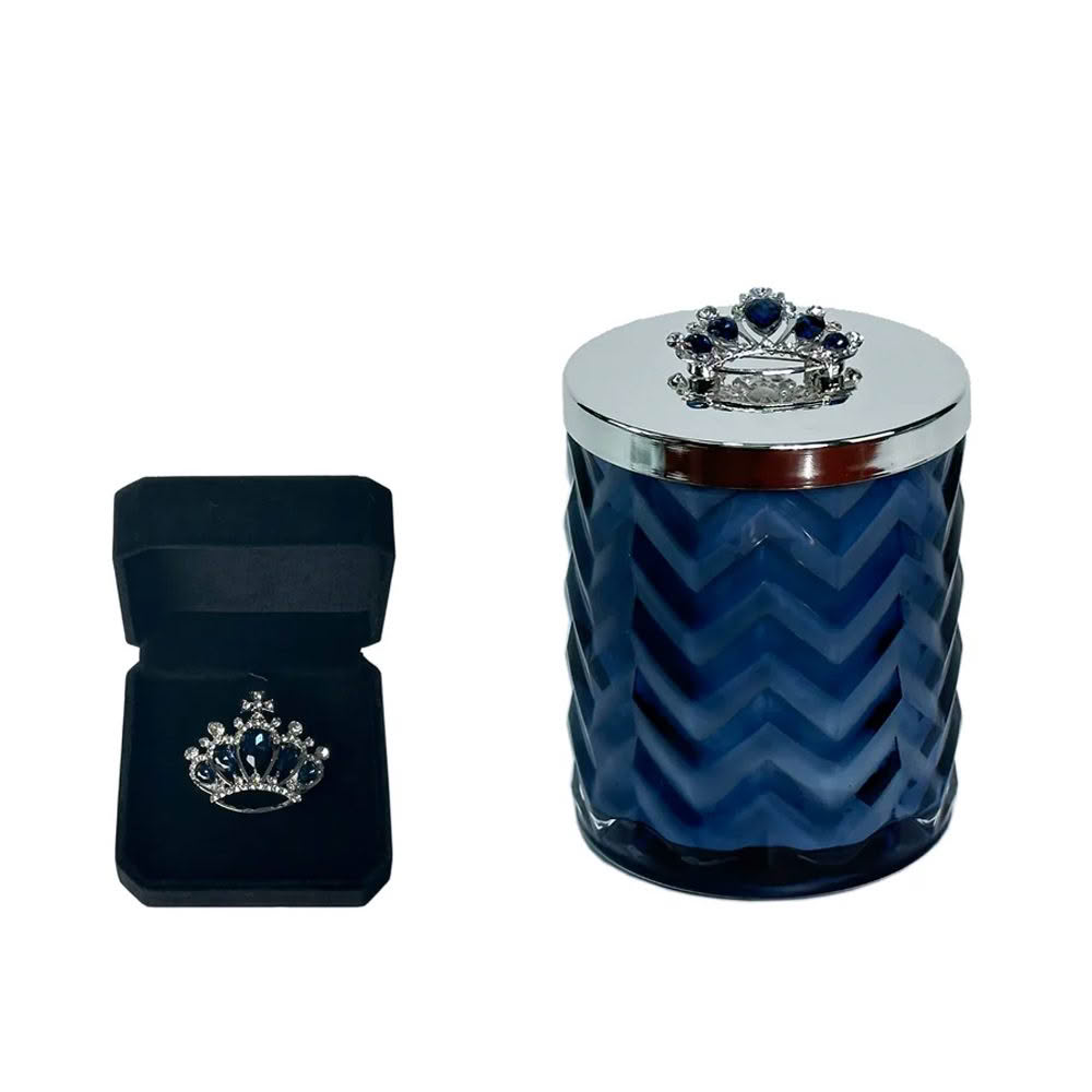 Apsley scented soy candle with marbled glass and boxVarious patterned candles lit on reflective surface