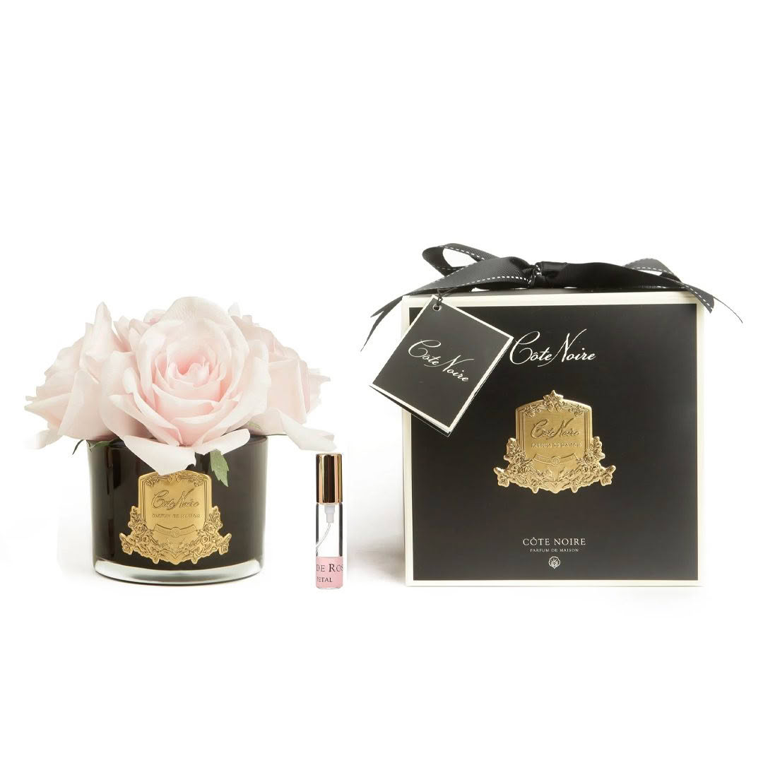 Each life-like perfumed Five Rose has been skilfully hand crafted and is set in gel giving it the appearance of water. Each petal has a special natural coating to give them a true to life touch and appearance and arranged in a clear vase with a gold signature Cote Noire badge.