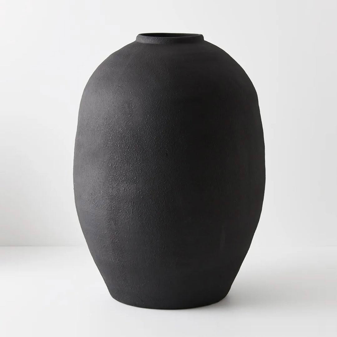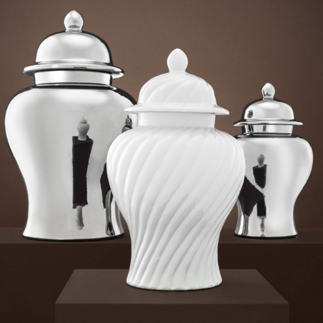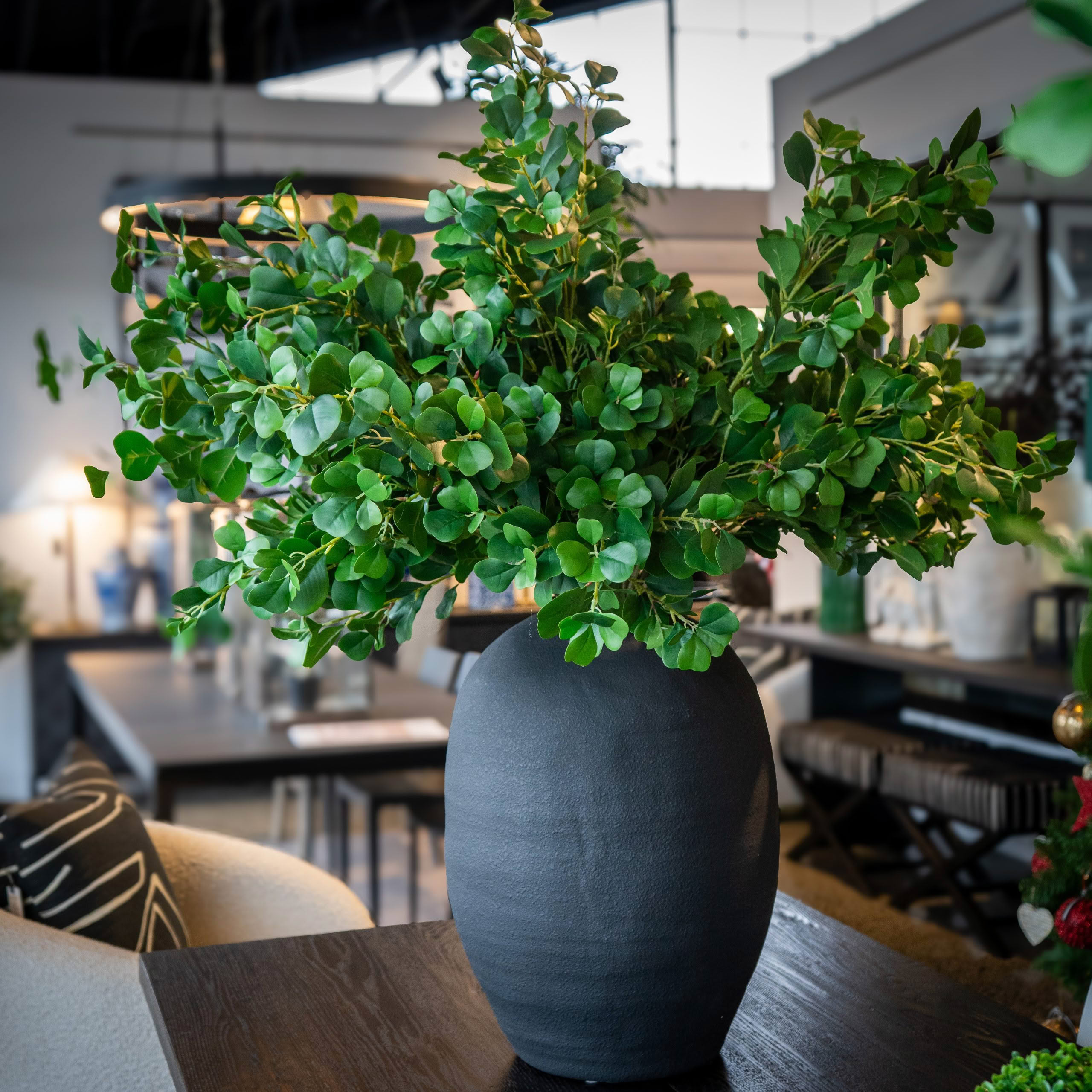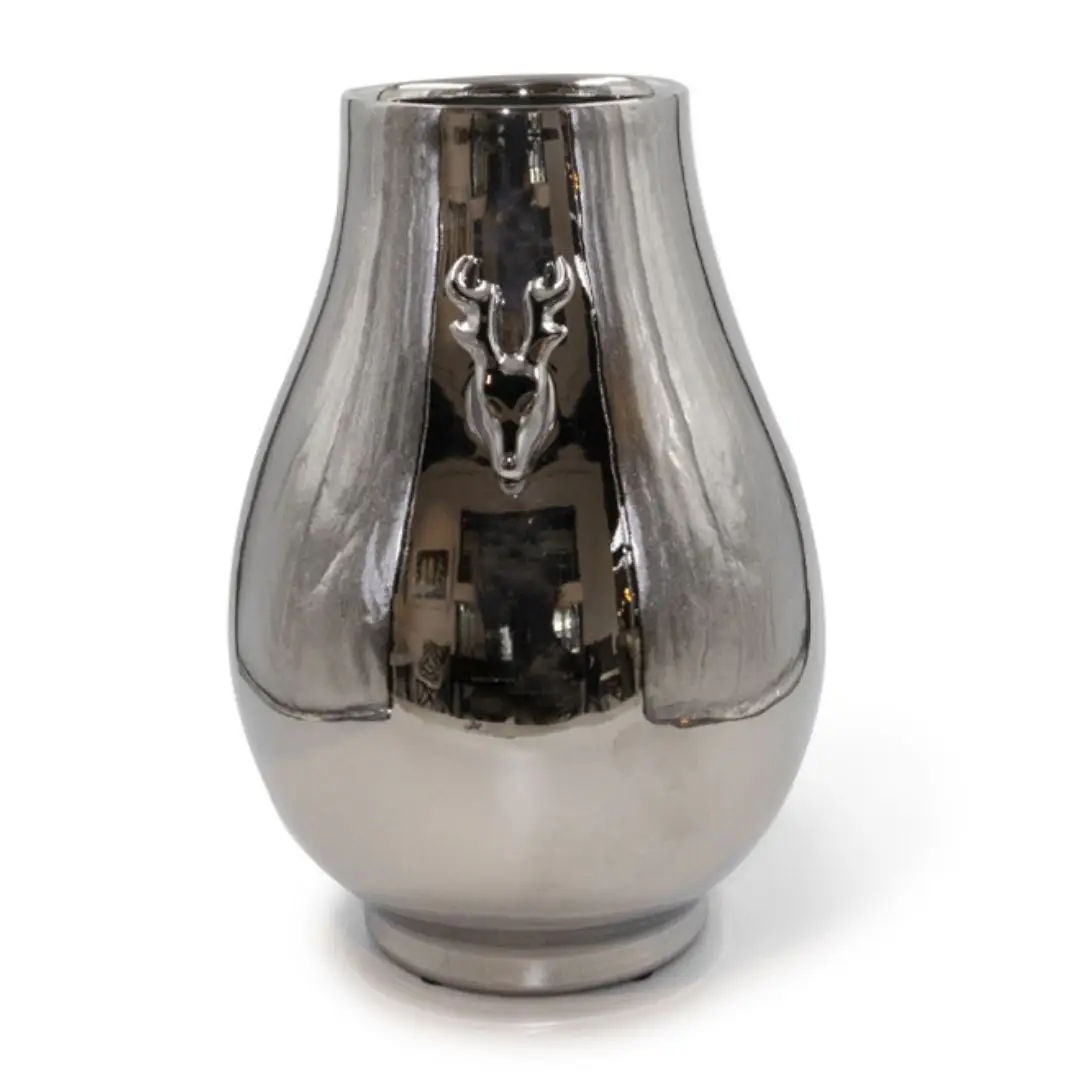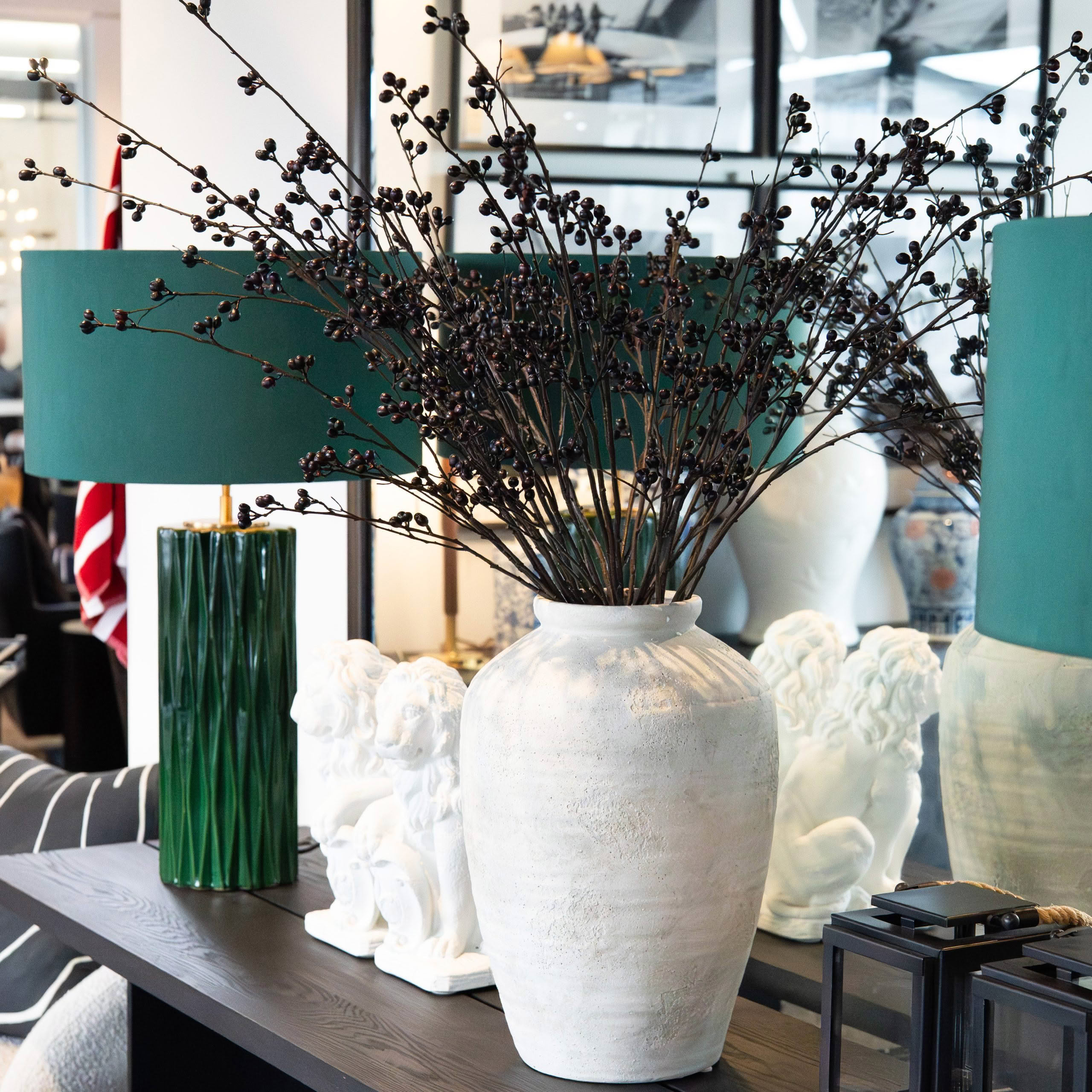 Smooth grey ceramic vaseElegant table lamps and vases on woven console