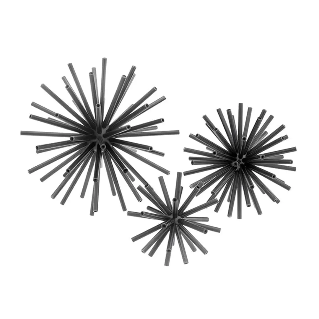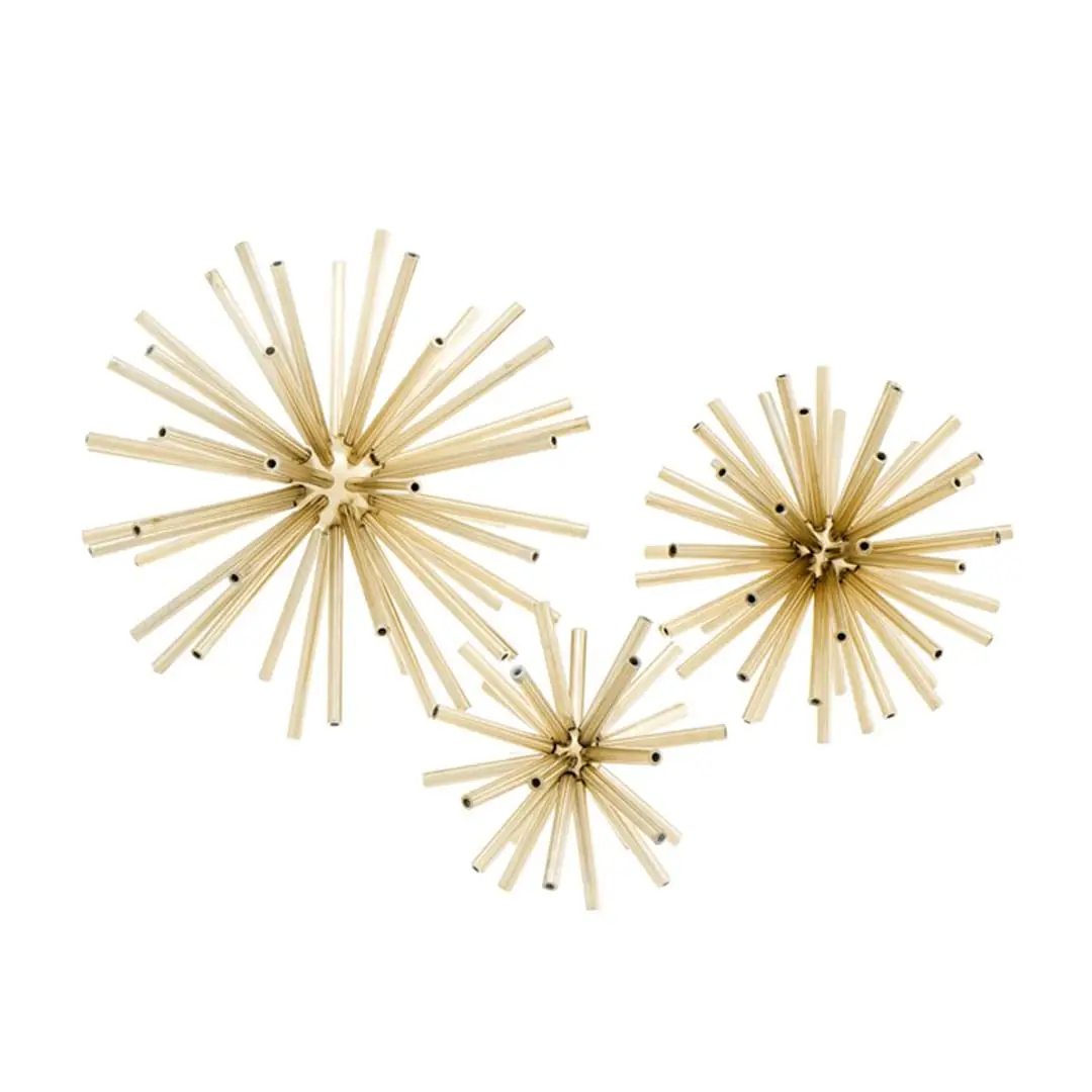 Golden bee sculpture with detailed wings and bodyThree golden bee sculptures in descending size
