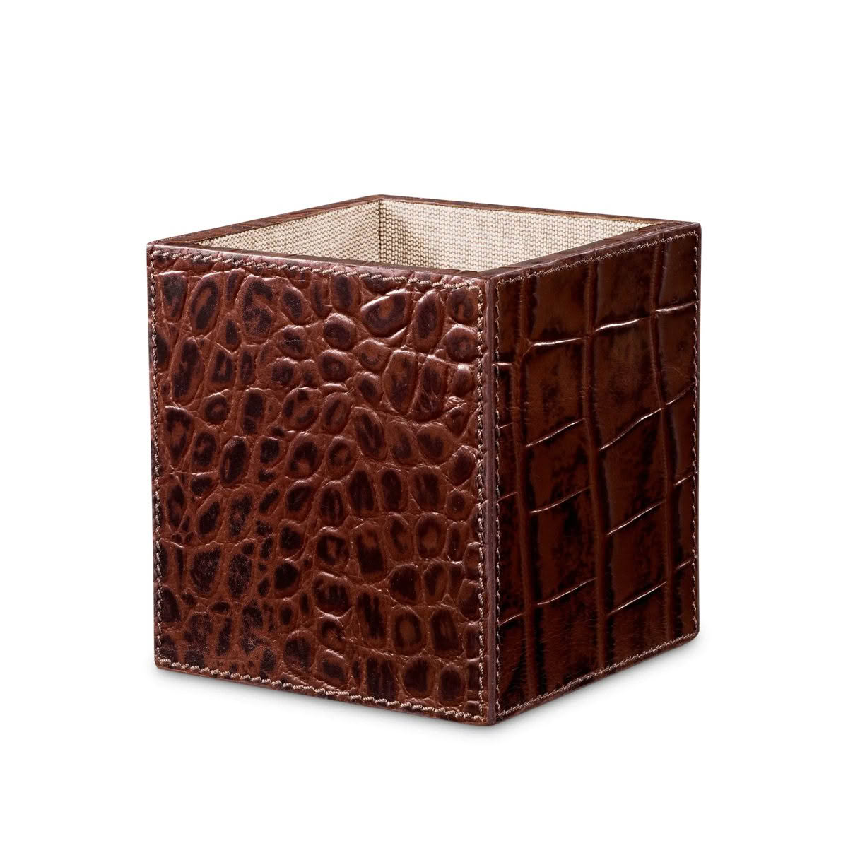 Upgrade your office with the Scaleo Desk Set by Eichholtz, a perfect blend of luxury and organization. This set of three includes a waste bin, a pen holder, and a stylish organizer for your documents and papers, all crafted from antique brown leather with a sophisticated croco embossed pattern. Available in both brown and black leather, it adds both functionality and elegance to your workspace, keeping everything neatly in place.