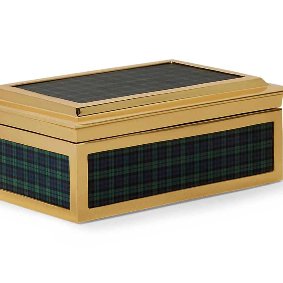 The Ferren domino set is housed within a luxurious case crafted from solid brass and detailed with Ralph Lauren’s iconic tartan pattern. It features classic resin playing pieces and four racks made from solid mahogany wood.