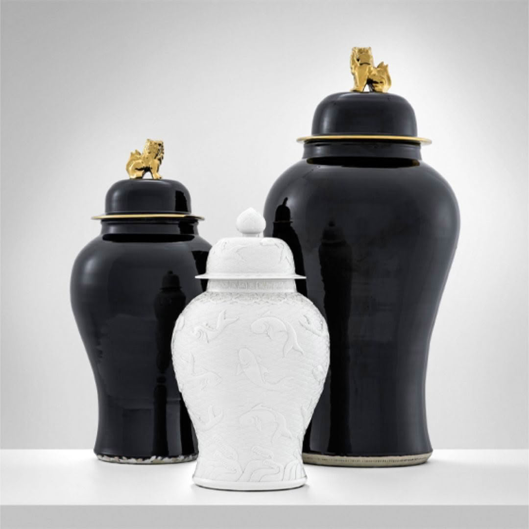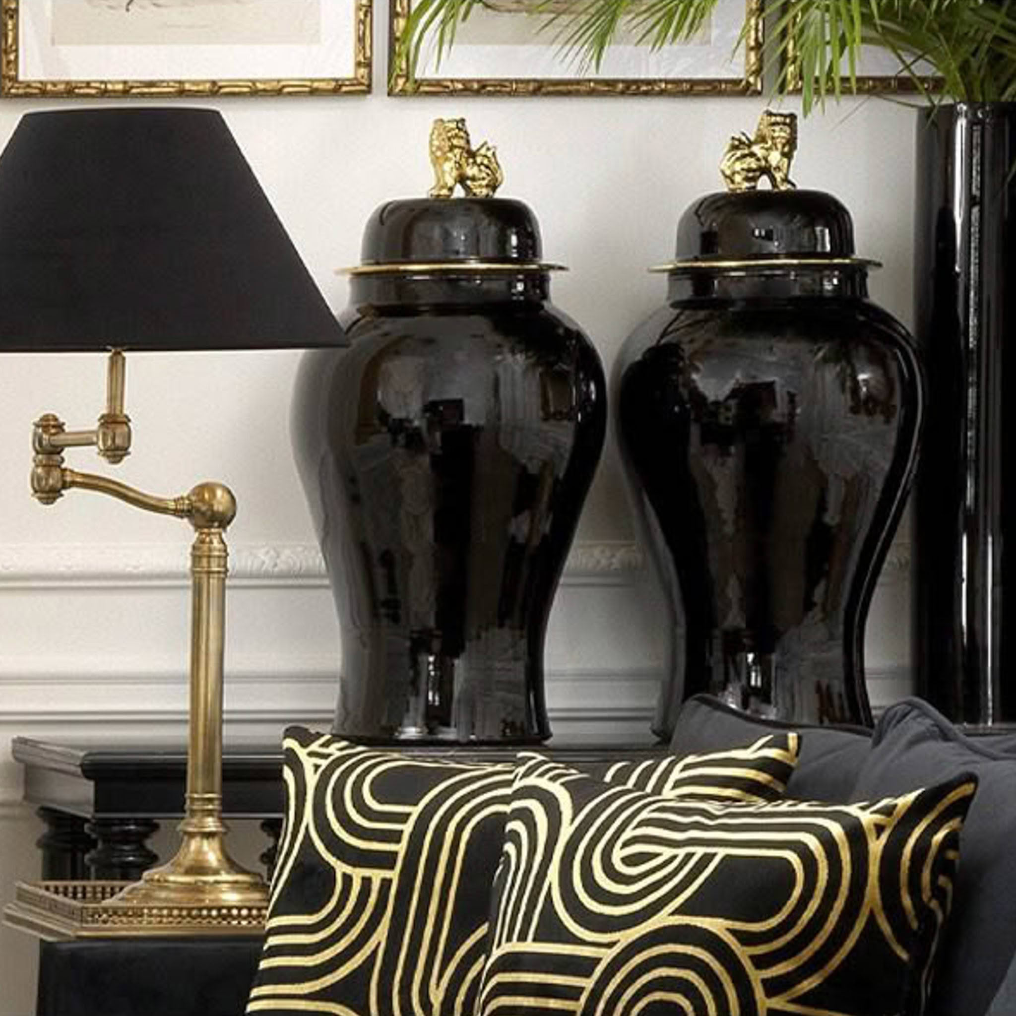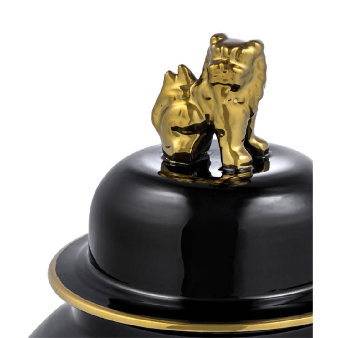 The gorgeous Golden Dragon S Vase is inspired by the traditional Asian urn that is often presented as a wedding gift. The black shouldered jar and its domed lid with gold coloured rim and foo dog finial brings Ming style into your modern décor.