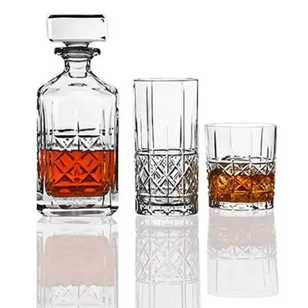 Brady’s signature horizontal and vertical cutting pattern makes this Decanter Set modern and stylish.