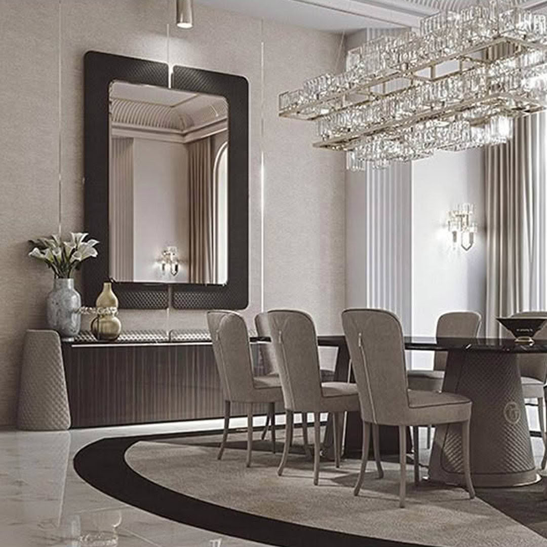 The Contarini mirror, wall mounting, takes up the characteristics of the homonymous collection framing the bronzed bevelled mirror with a frame in patinated bronze wood and a metal back covered in fabric or leather with the typical dedicated quilting. The mirror is backlit to create a halo of enveloping light.