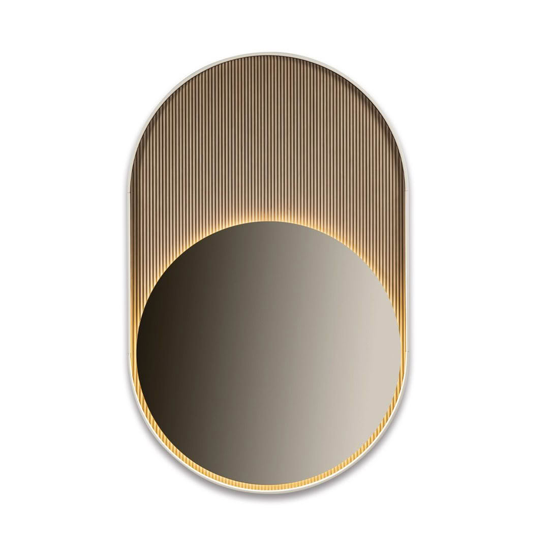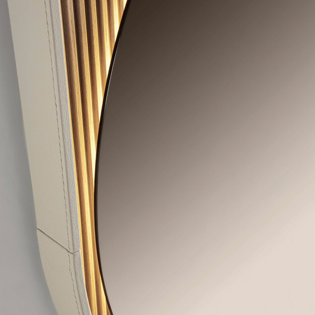 Miani bronzed mirror emphasises the round shape and plays with the asymmetry of the mirror, creating a pleasantly unexpected effect. The use of different materials such as leather, glass and wood produces a beautifully crafted product that makes elegant details its deep essence. LED lights on the glass perimeter enrich the mirror and highlight the rhythm of the striped panel. Miani mirror can be fixed to the wall in different orientations, thus making up new patterns and designs.