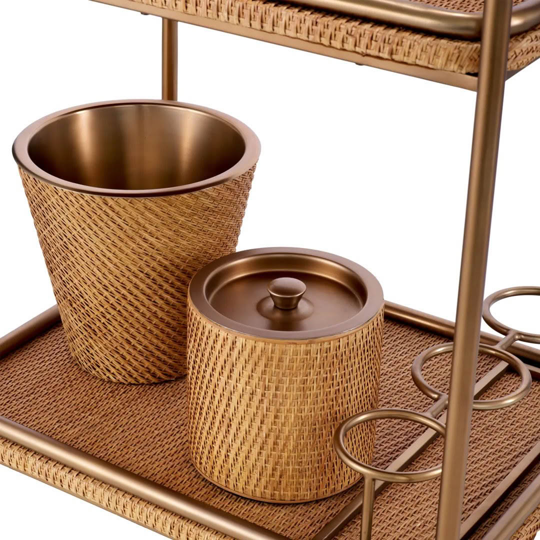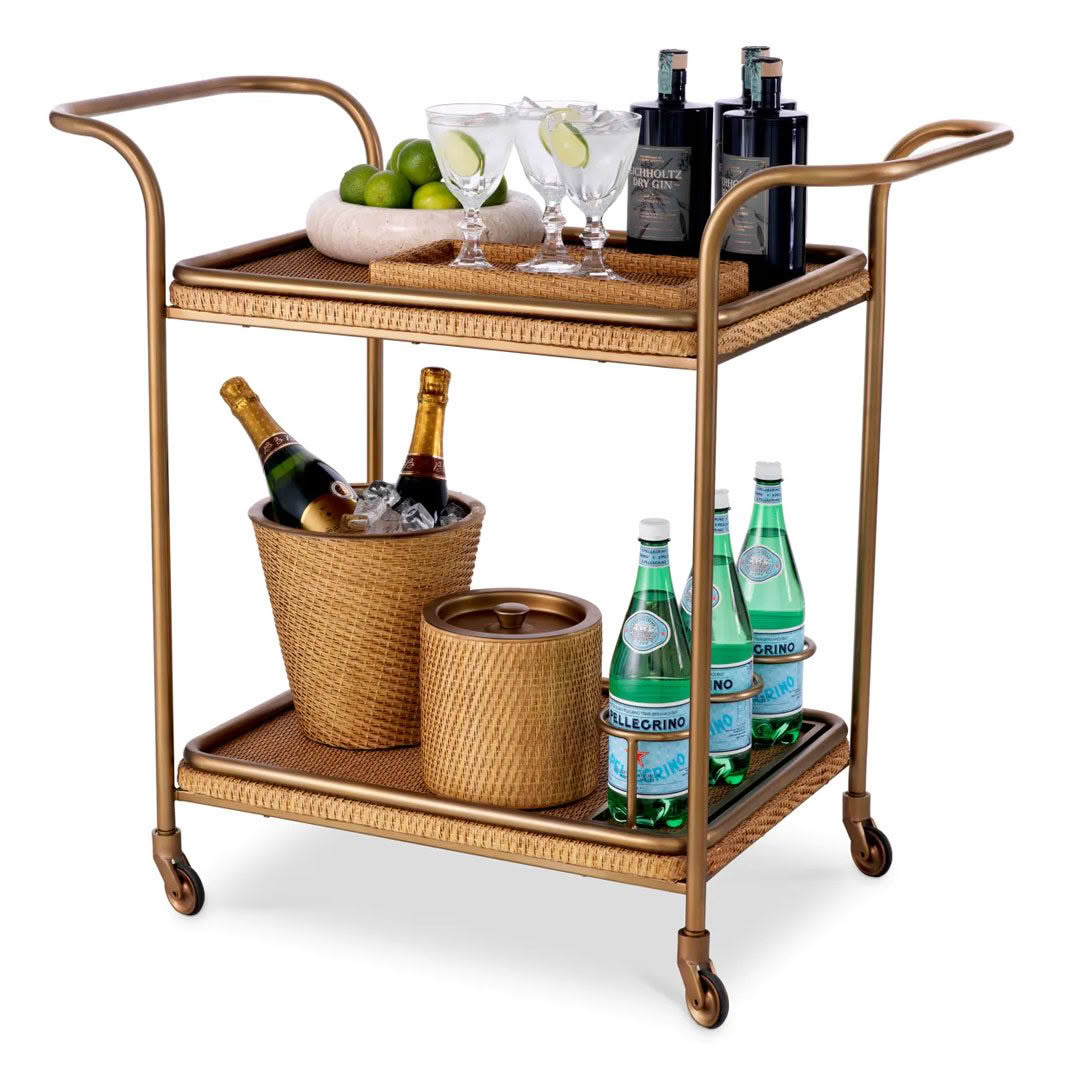 Infuse elegance into hospitality with Eichholtz’s Pescara Trolley, complete with vintage brass accents and natural rattan tiers. This chic bar cart comes ready with four bar accessories, blending form and function in your entertainment ensemble.