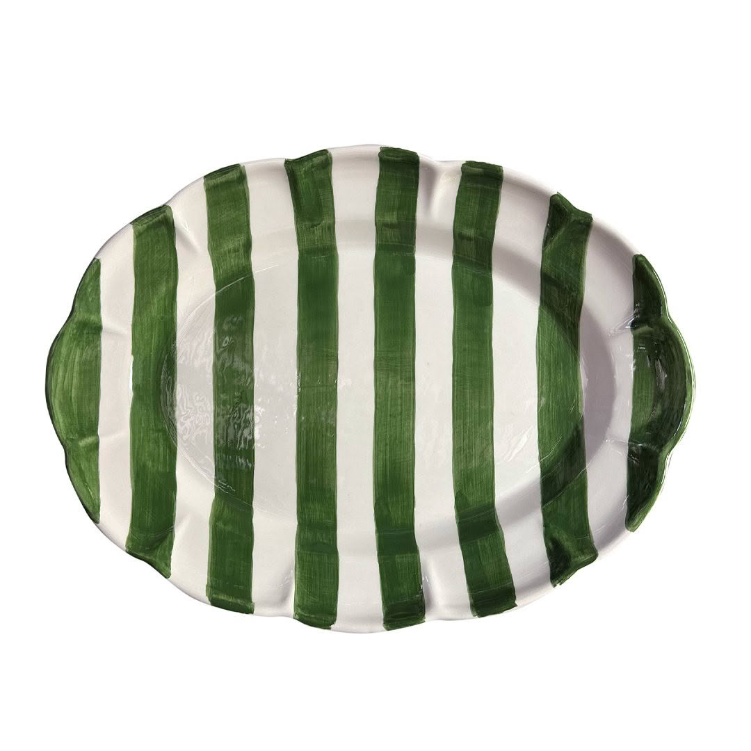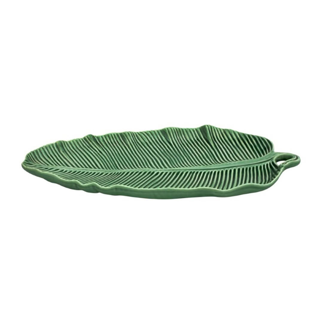 Green leaf-shaped ceramic serving dishCeramic leaf-shaped dishes and jug on tropical pattern