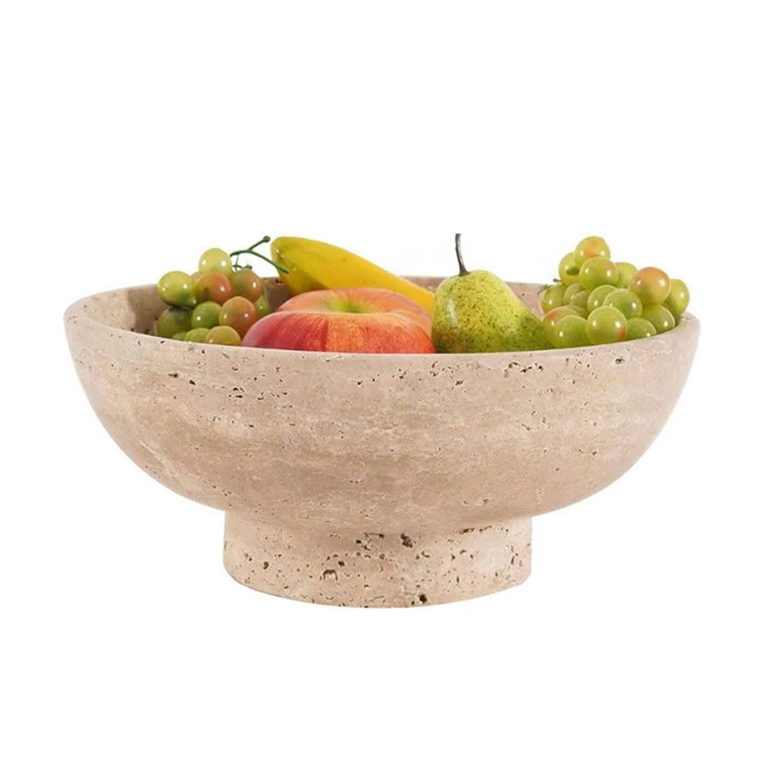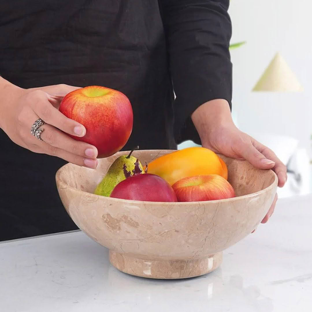 Dark ceramic decorative bowl on white surfacePerson in apron holding stack of ceramic plates