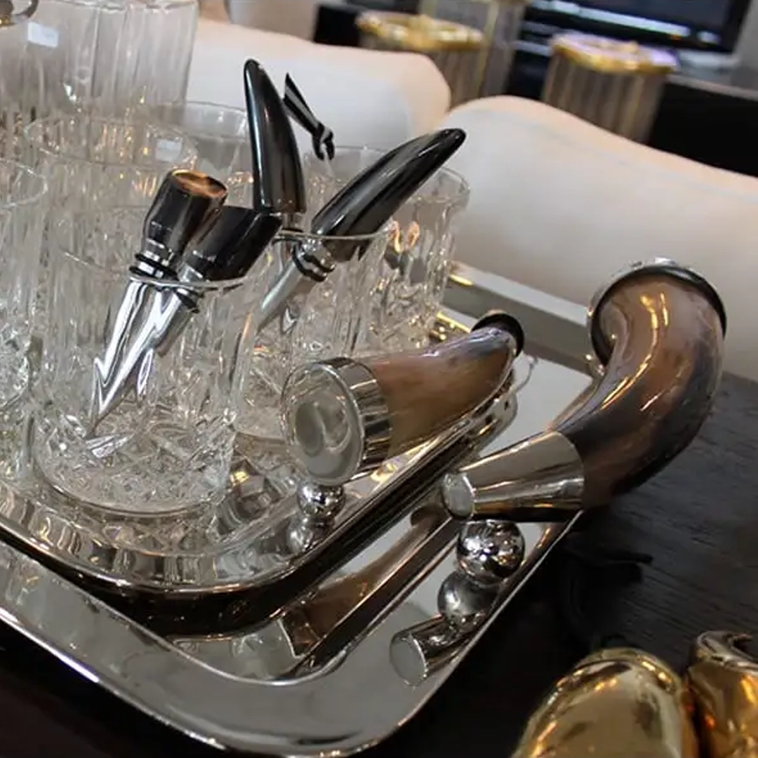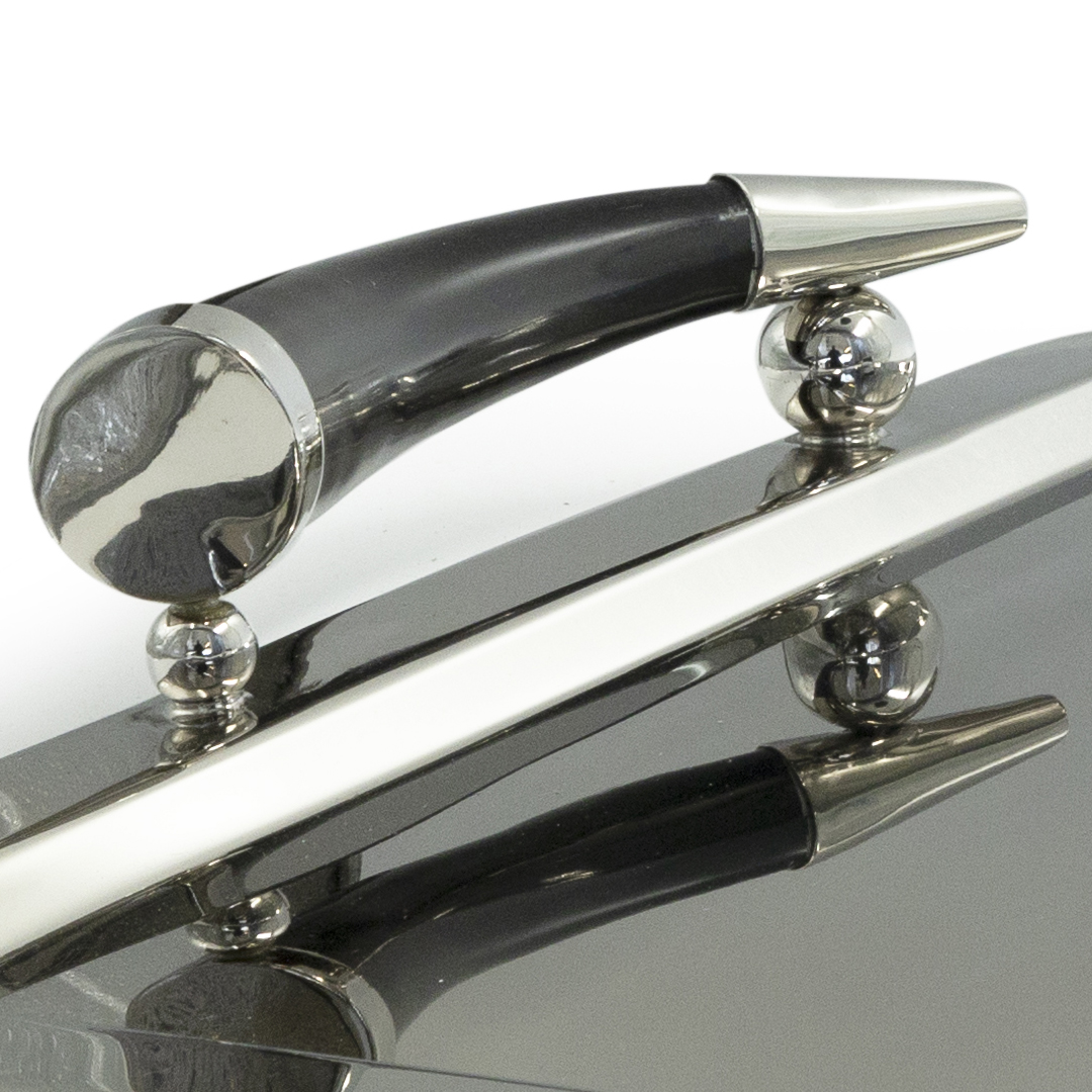 Elevate your serving style with the Zermatt Tray in a sleek nickel finish, complemented by elegant horn accents. This medium-sized tray combines modern sophistication with natural charm, making it a striking centerpiece for entertaining or display in any setting.