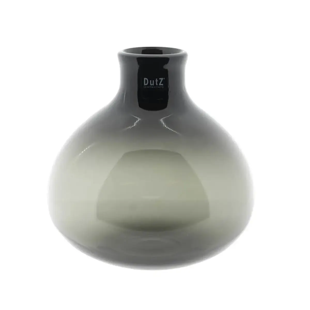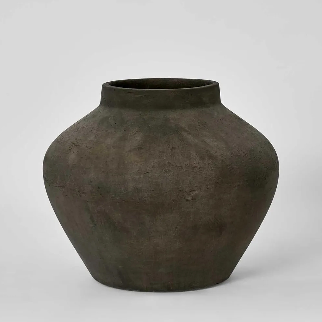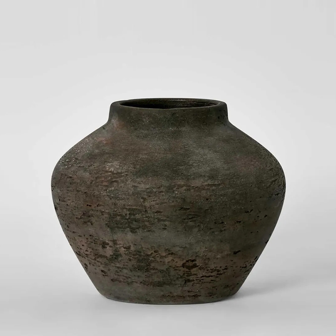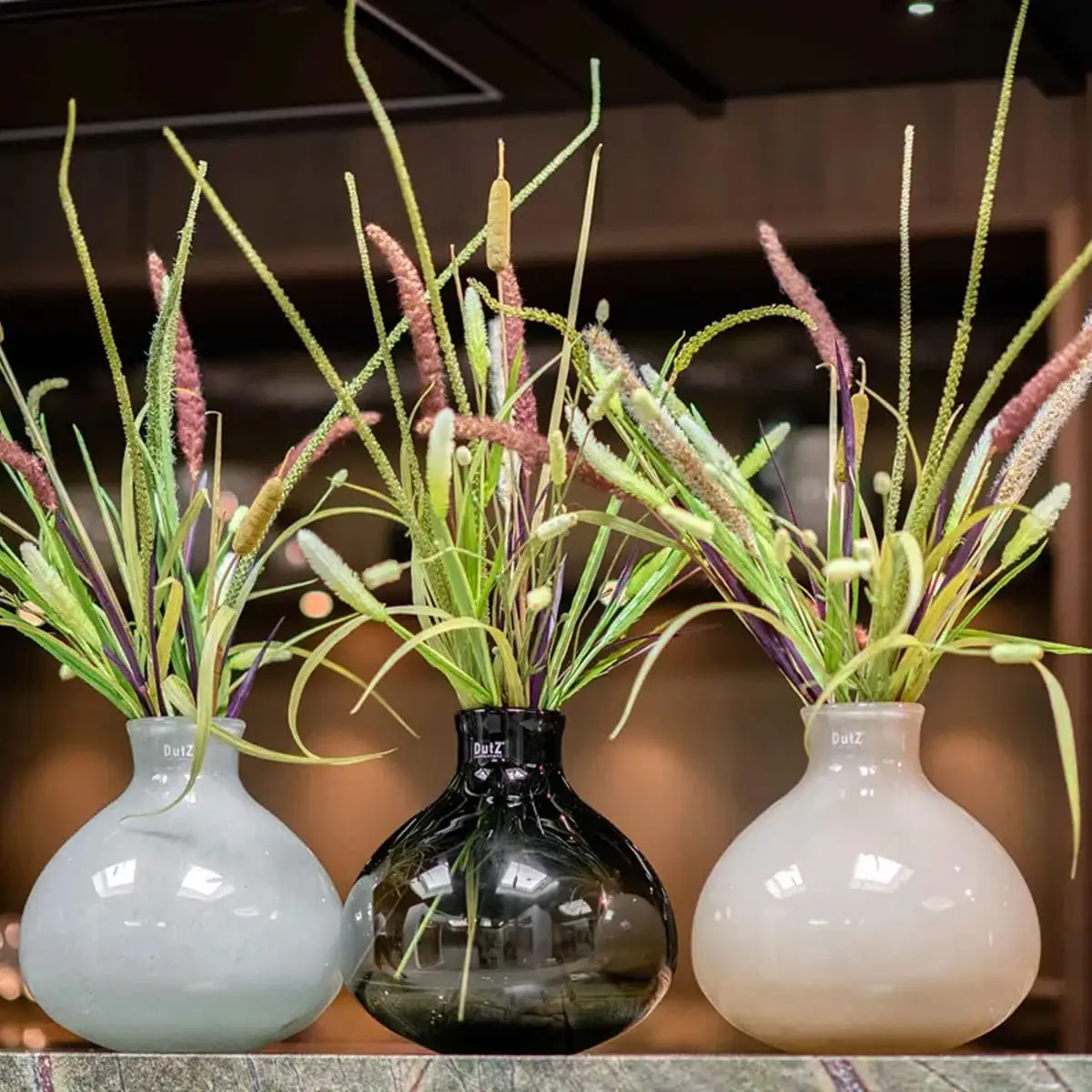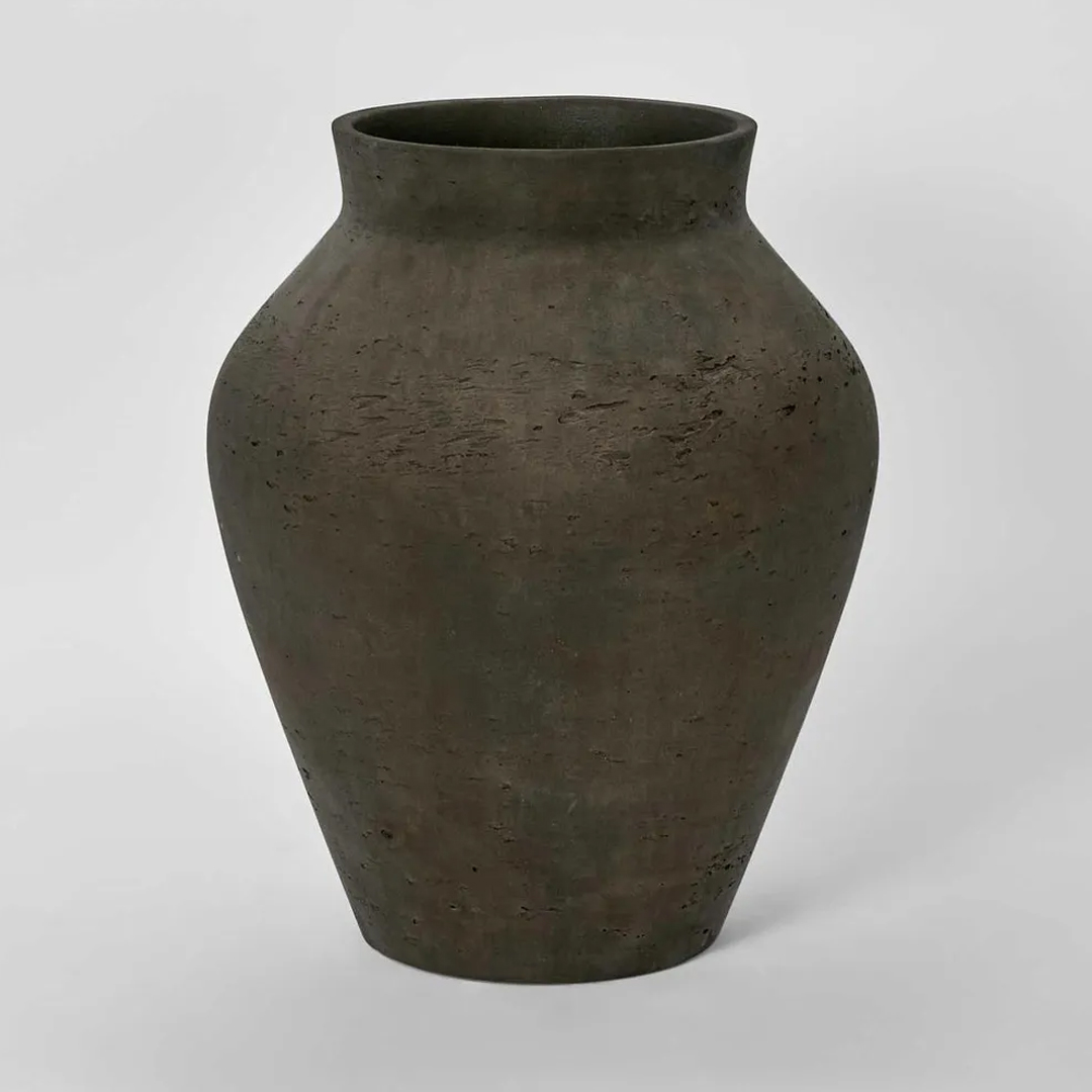 Smooth grey ceramic vaseElegant table lamps and vases on woven console