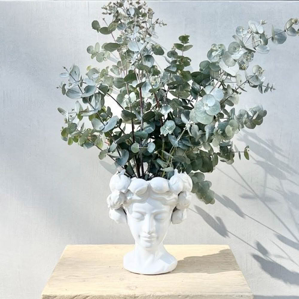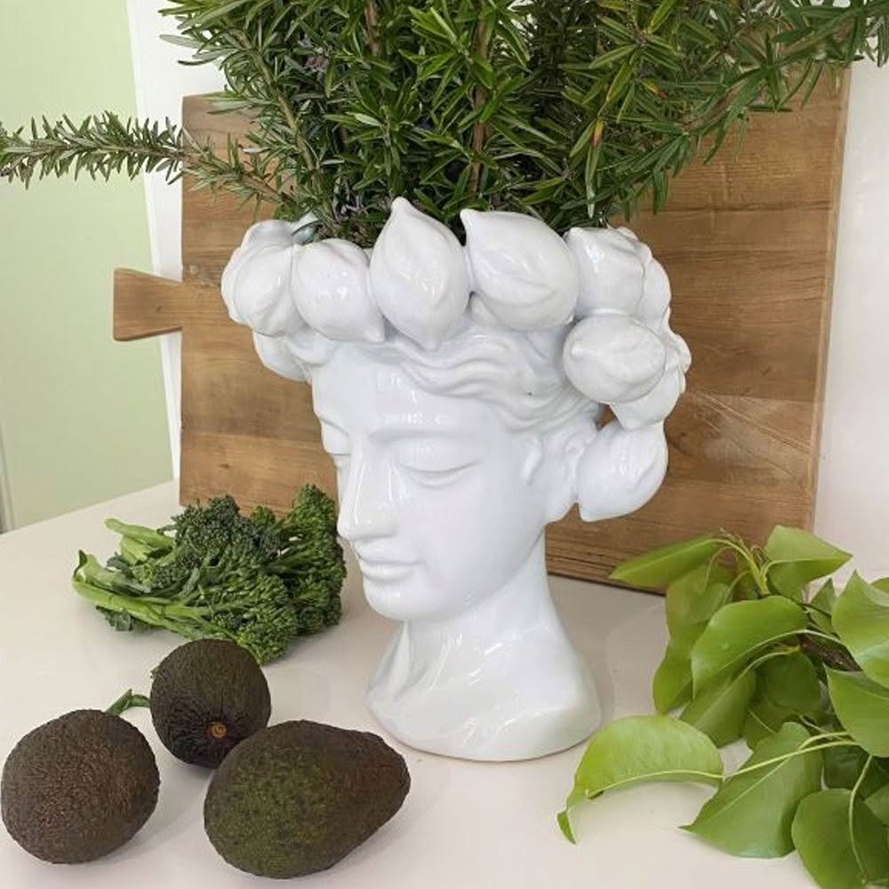 Green ceramic head planter with artichoke crownGreen bust planter with yellow autumn leaves