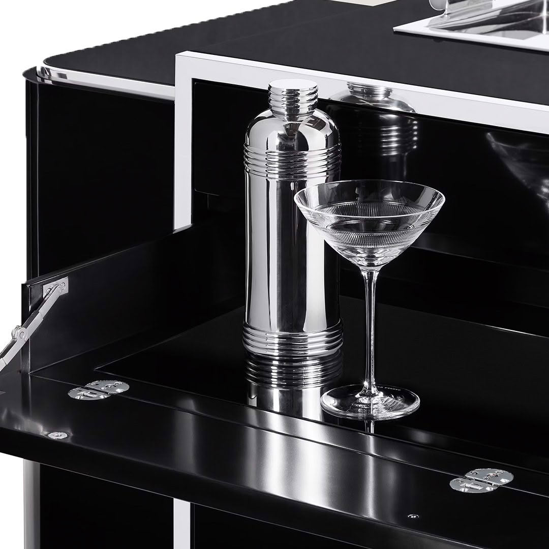 The Duke bar is inspired by 1930s-era styles and accented with polished stainless steel trim. It features a removable top tray, three slender drawers, a flip-down front, and flanking end doors with shelving.