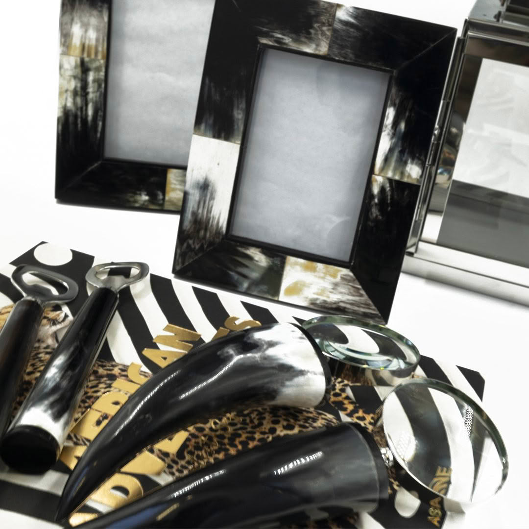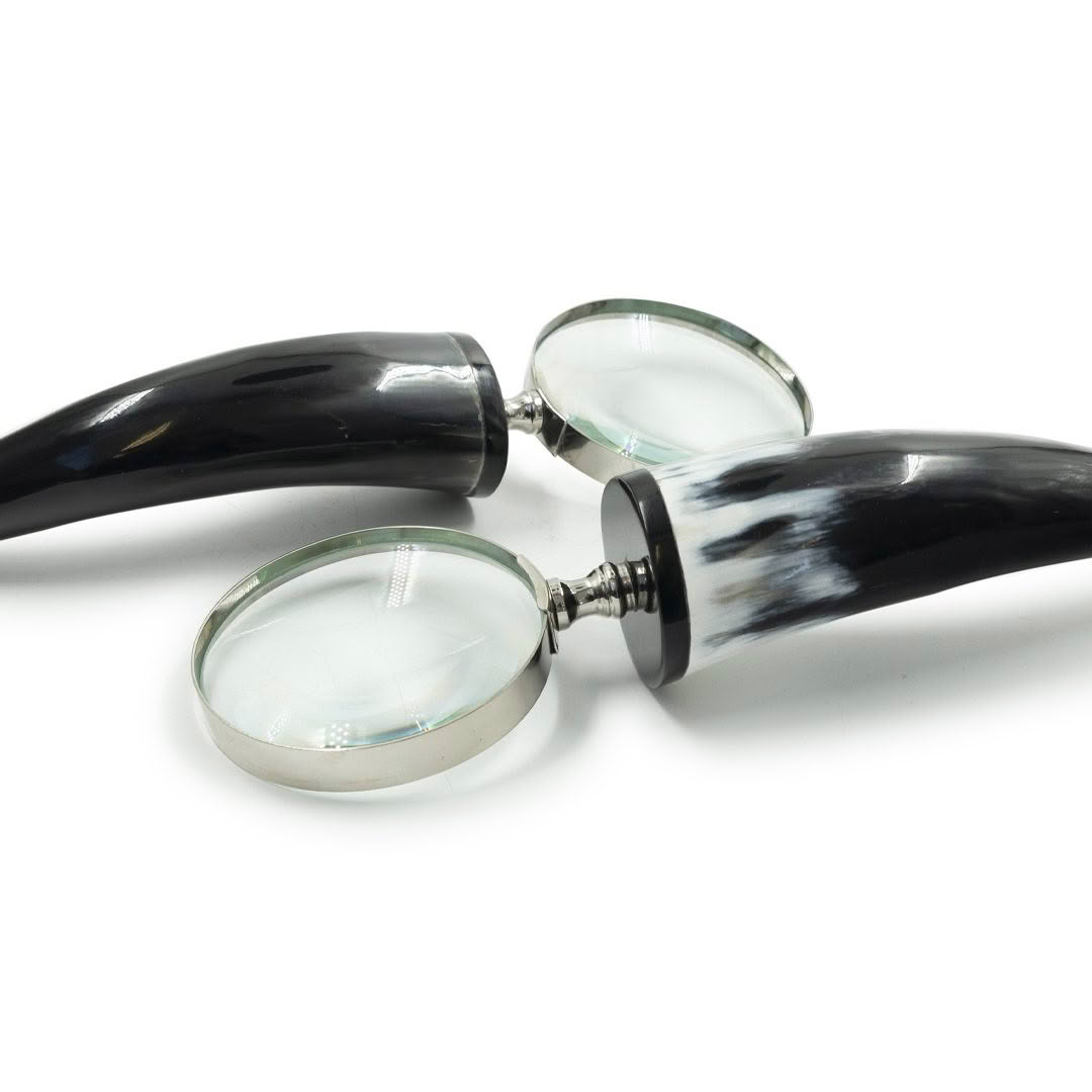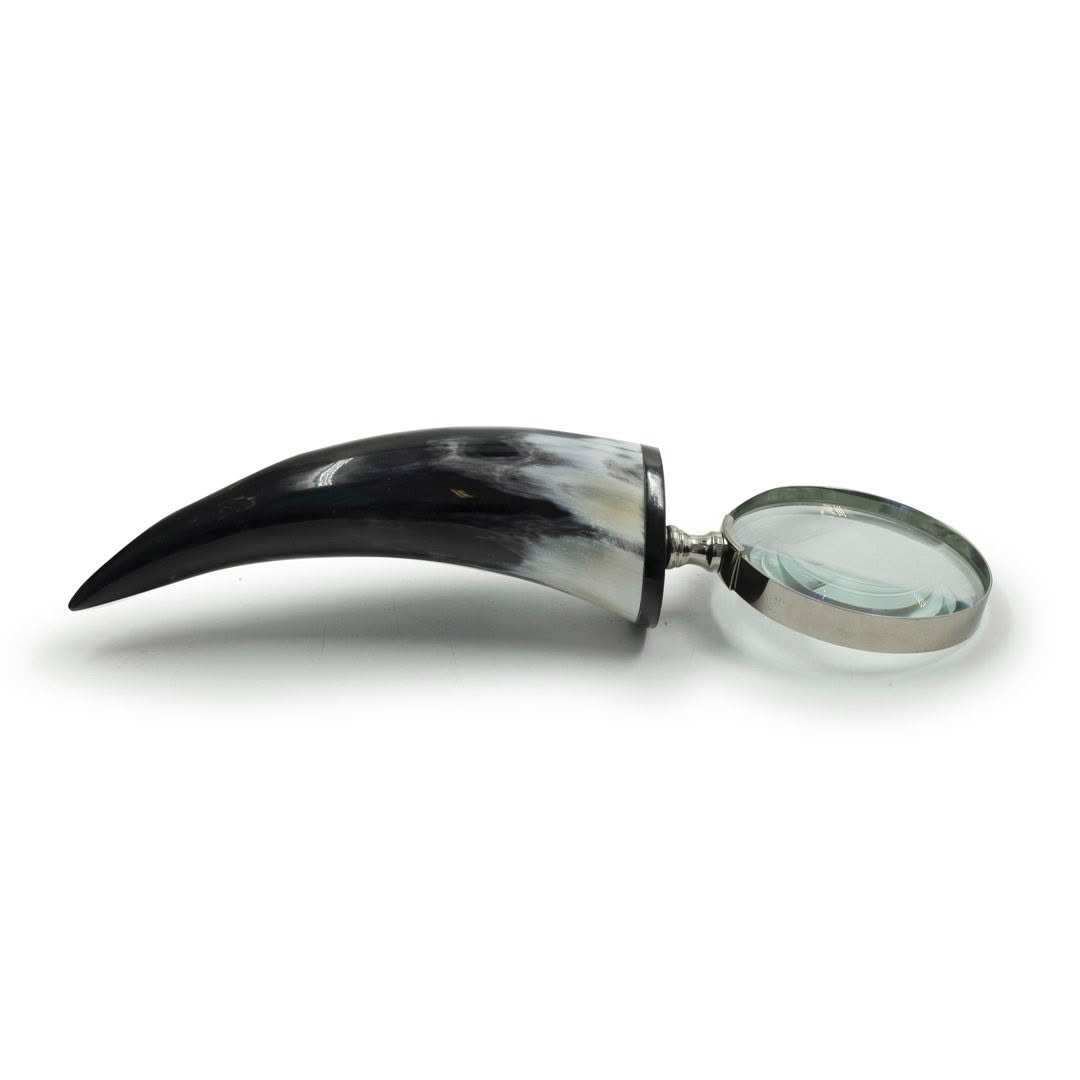 ZERMATT MAGNIFYING GLASS An elegant blend of functionality and style, this magnifying glass features a horn handle that highlights its timeless design. Crafted with an eye for classic aesthetics, it brings sophistication to any space—a perfect decorative accent and a testament to fine craftsmanship.