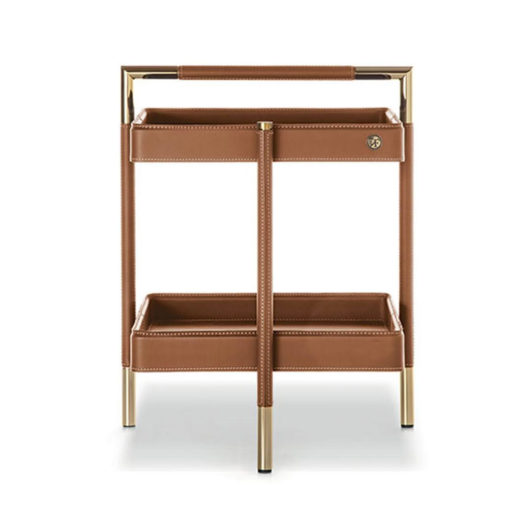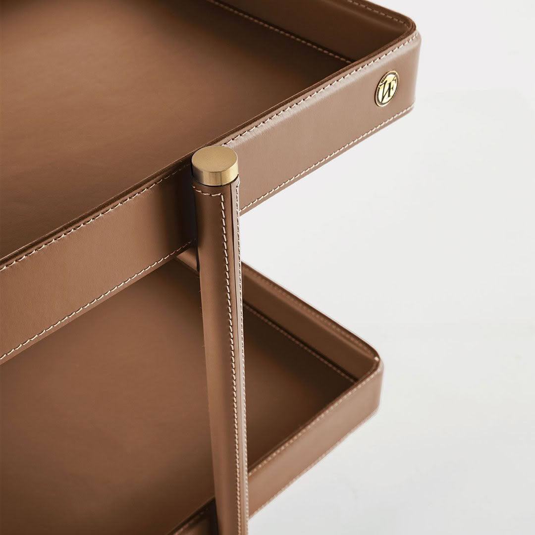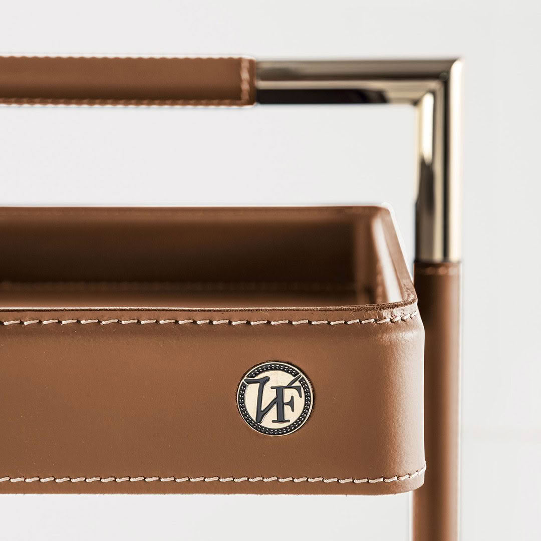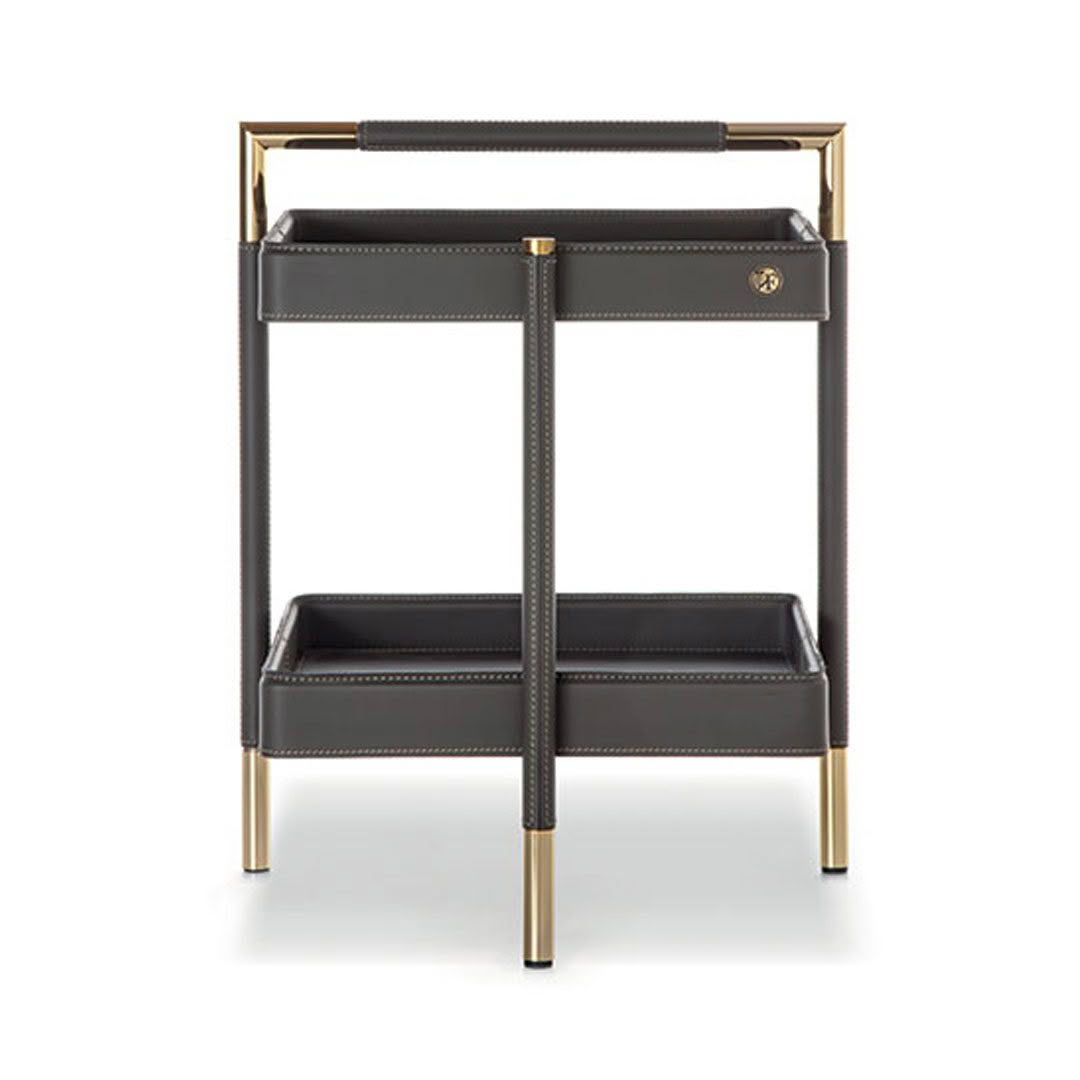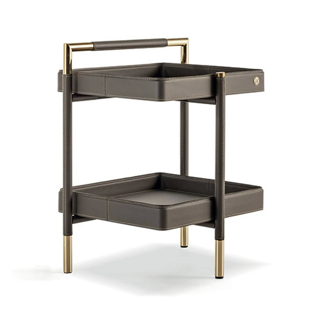 A precious object covered in hide leather with gold chrome details. The Araldo night table escapes the classic definition of a bedside element for an elegant furnishing solution suitable for furnishing any environment. The light proportions emphasise the sartorial details for a complement that becomes the protagonist of the night area.