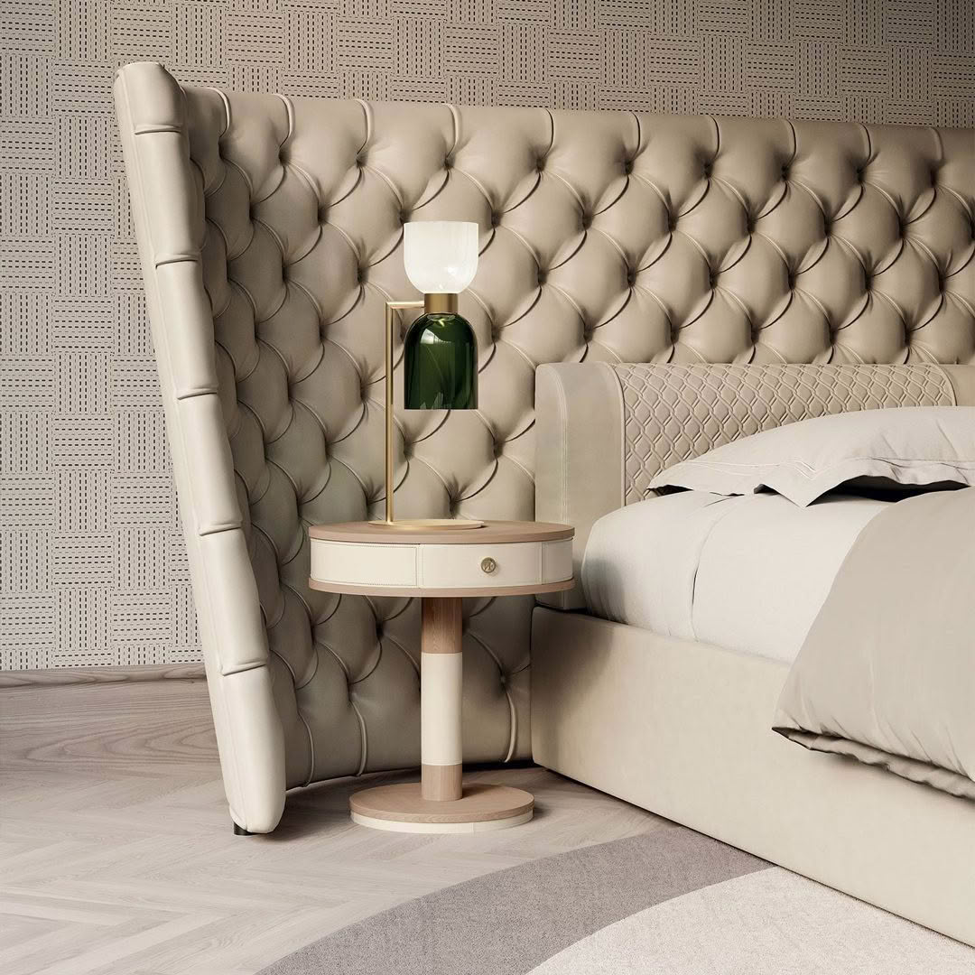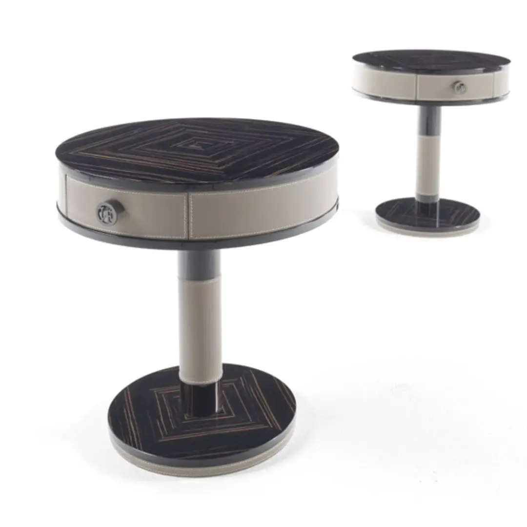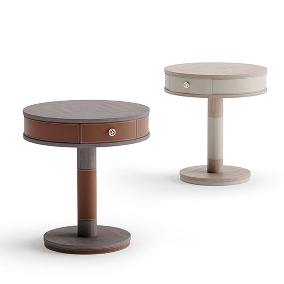 Salis small table combines round shapes and a slender silhouette in a fine object. Different materials come together and dialogue in a pleasant and elegant ensemble: the round wooden top features a drawer covered in leather with contrasting stitching; the same material is repeated in the insert on the leg and base, for a harmonious and sophisticated pattern.
