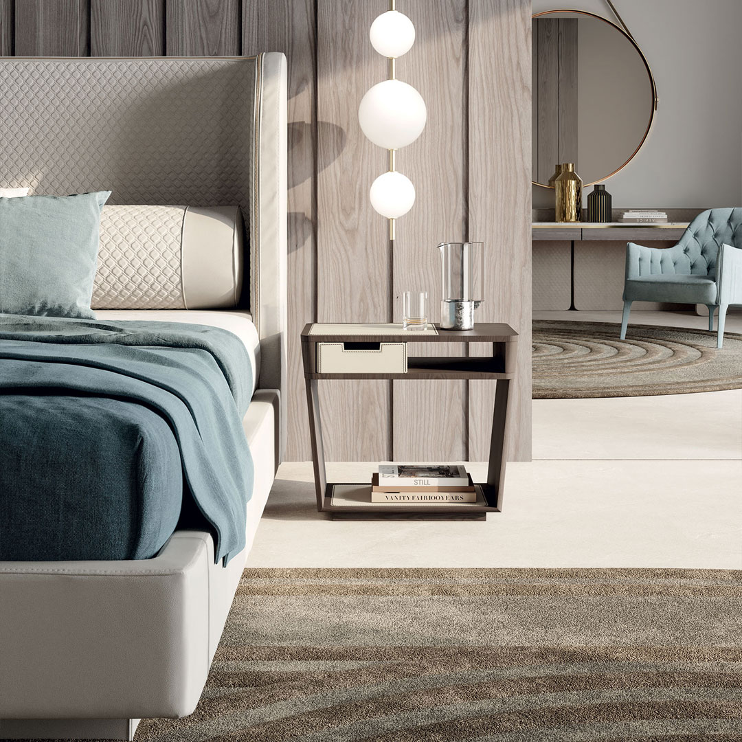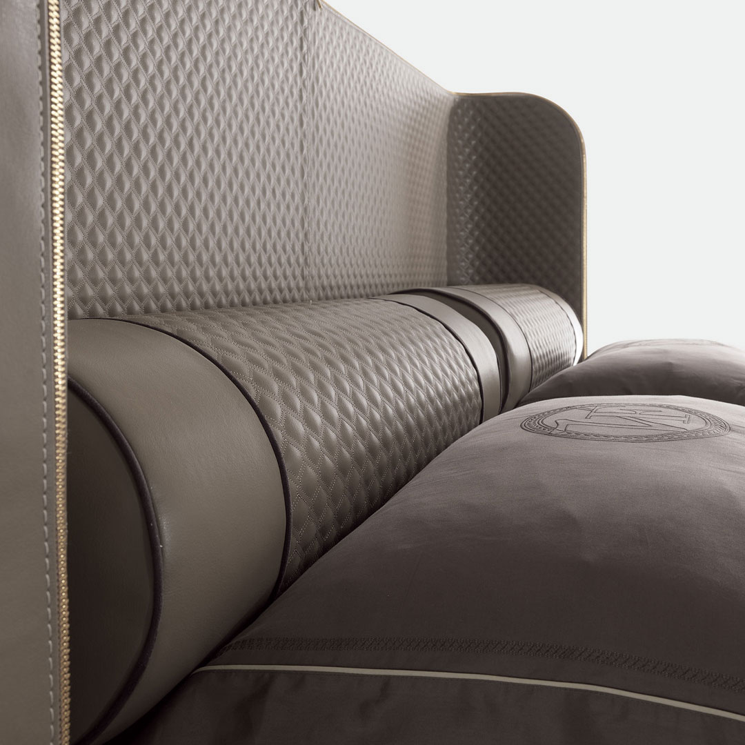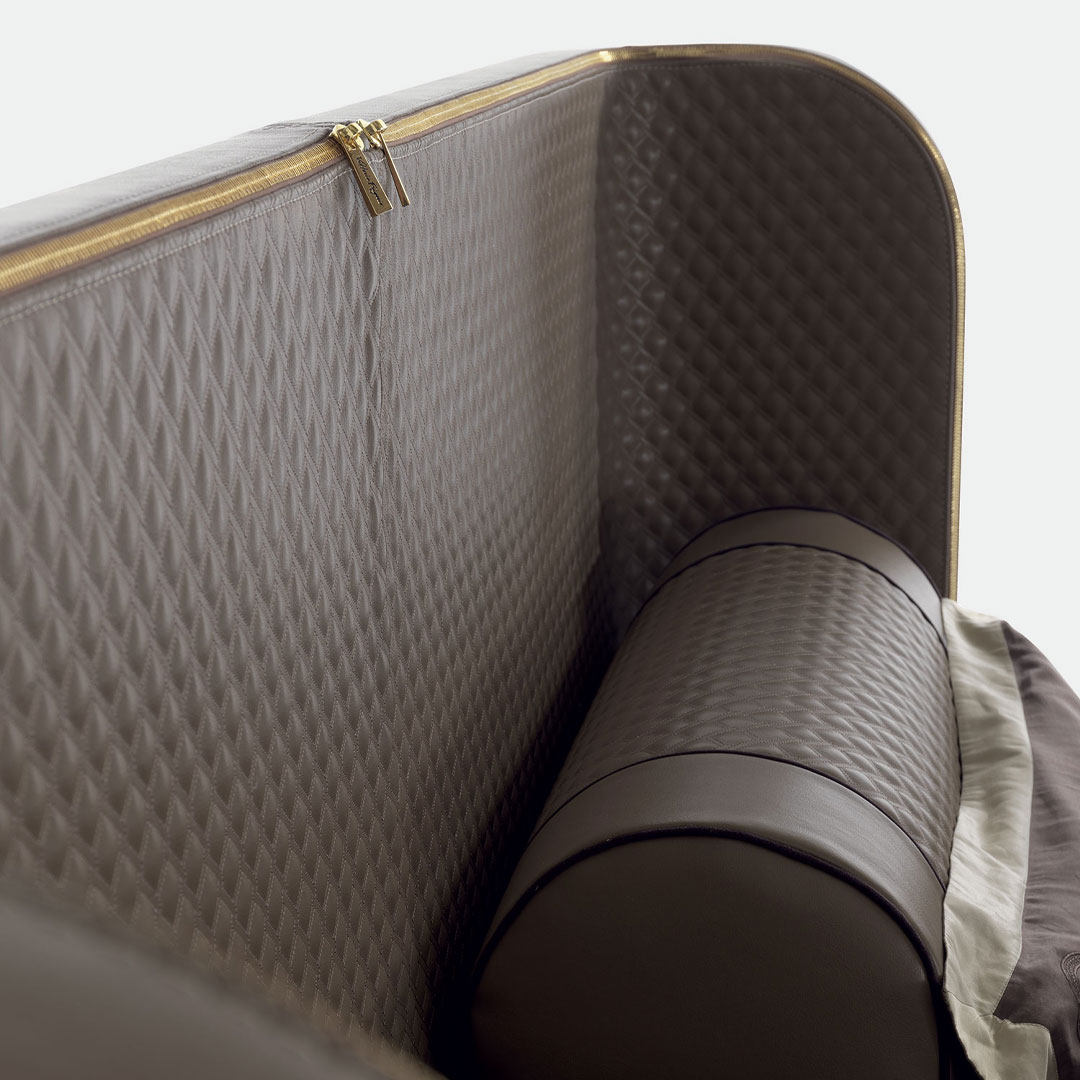 Classicism meet modernity in this bed of smooth and neat lines, enriched by an imposing headboard, elegant embroidery and precious zippers.