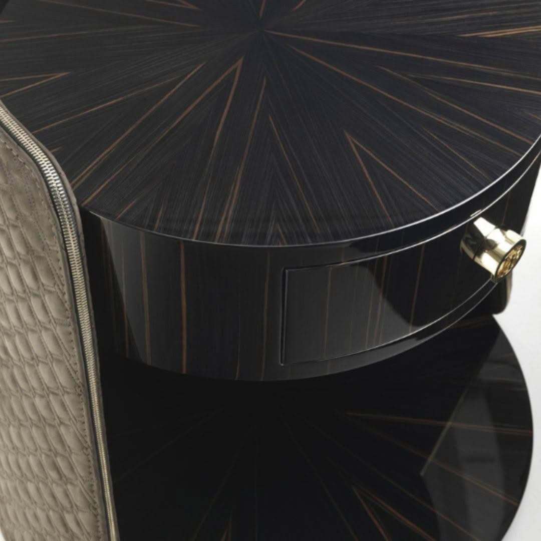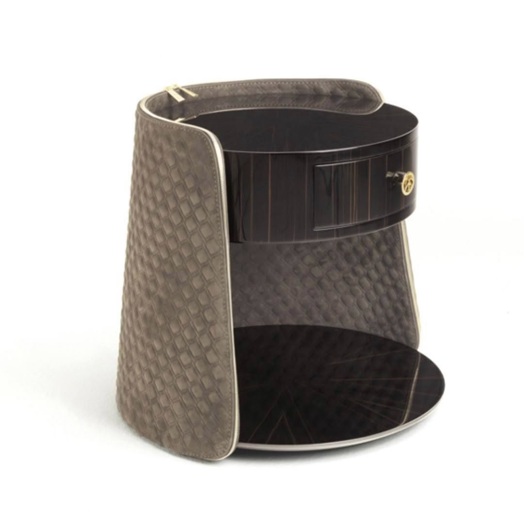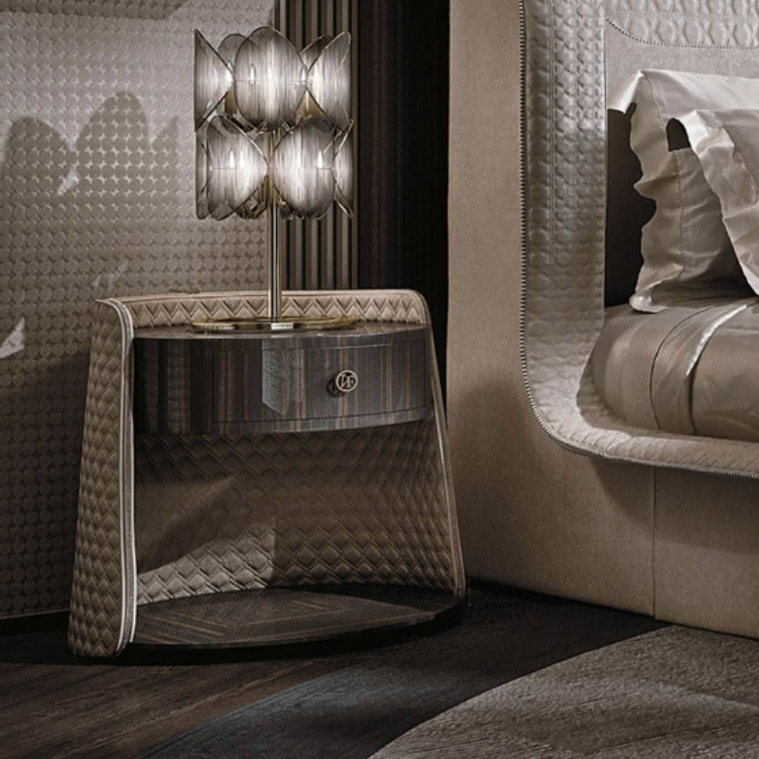 Contarini night table is a small masterpiece of craftsmanship and luxury. The external structure is available in two versions: Contarini can have the structure enriched with a fine quilting, or, at choice, a delicate embossed embroidery. The wooden drawer and the matching base complete the night table. The Vittoria Frigerio logo handle and the zip along the structure are tangible evidence of the collection’s care for detail.