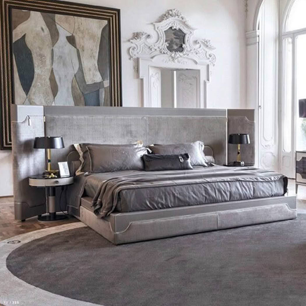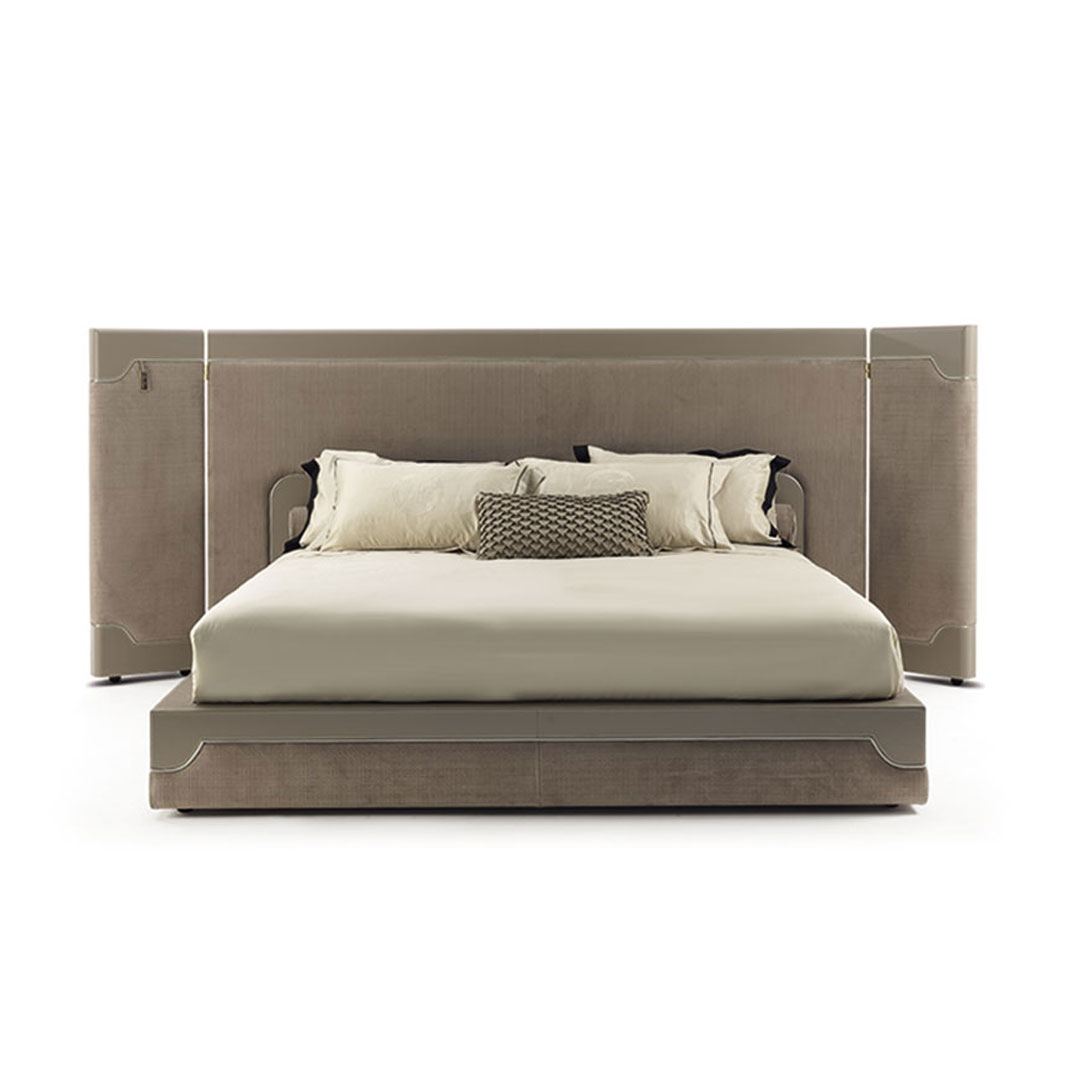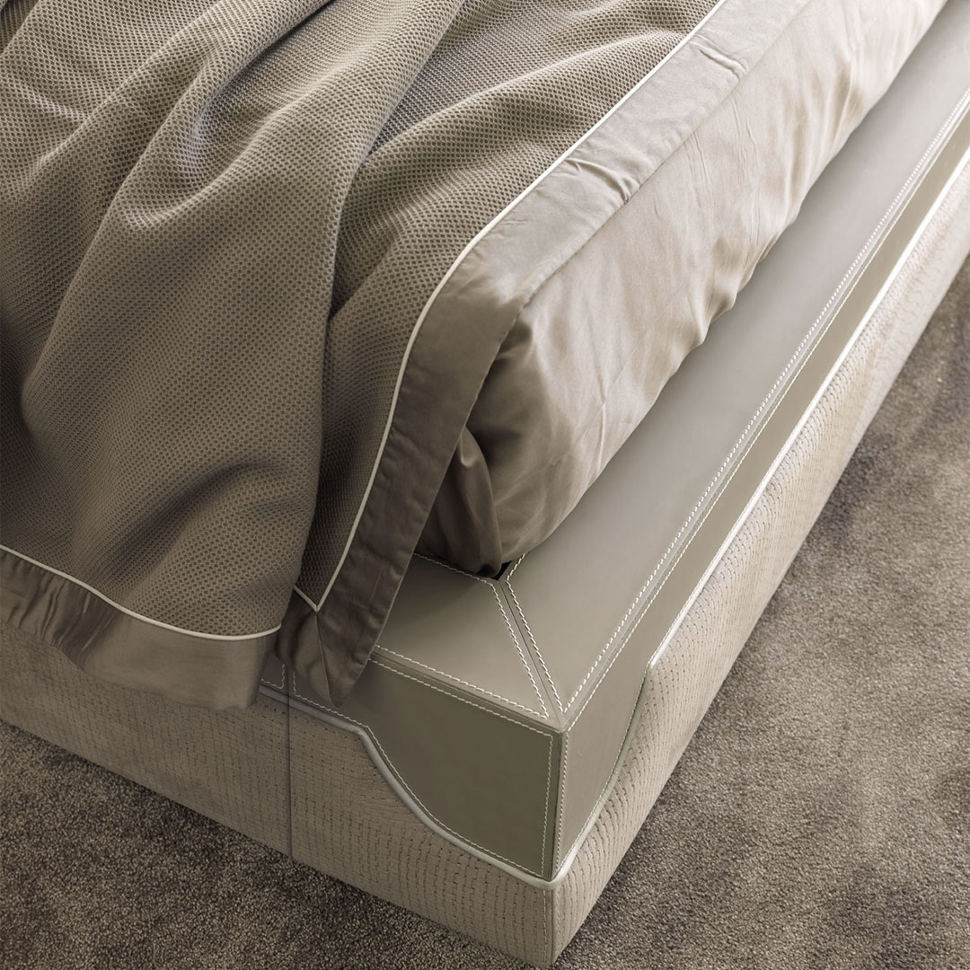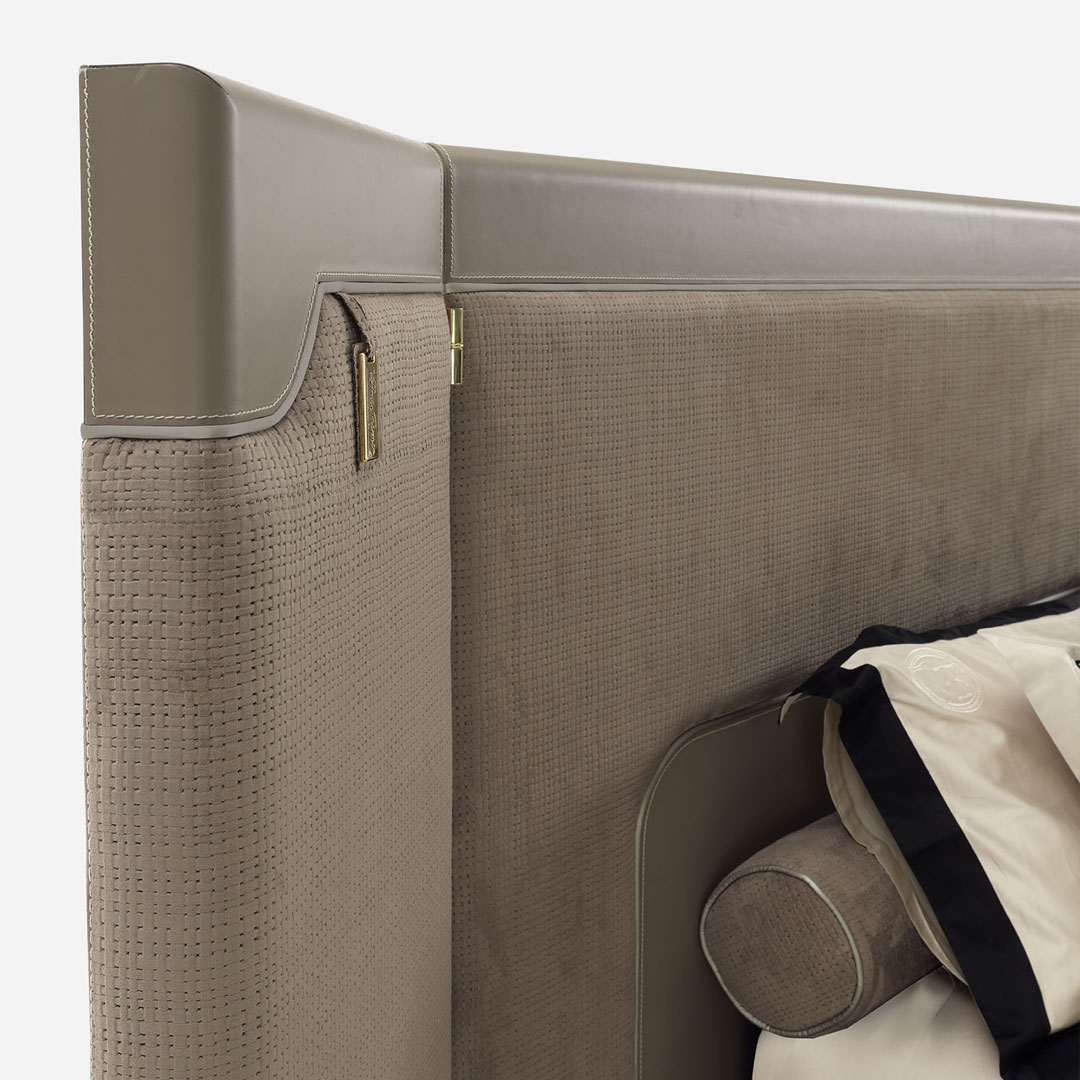 A headboard recalling a screen room divider for a strong elegant effect: the Corio bed is the main character of the night area. The headboard is refined by hide leather framed-details which emphasize its width and the panels could be covered in fabric or leather. The bedframe, with squared and rigorous lines, is as well refined with hide leather details for a harmonious and coordinated visual effect. The project is large-scale aimed to concentrate the looks onto the most important and beautiful object of the room: the Corio bed. The collection is completed by a coordinated bench available in different sizes.