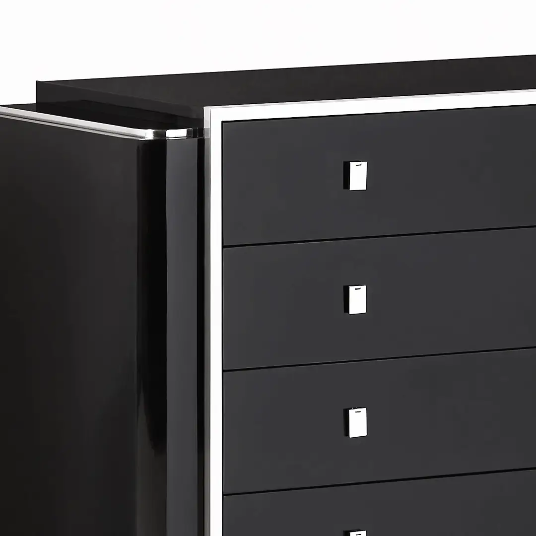 The Duke dresser is inspired by 1930s-era styles and accented with polished stainless steel trim. The classic design features luxurious black glass panels at the top and has four drawers with soft-close glides.