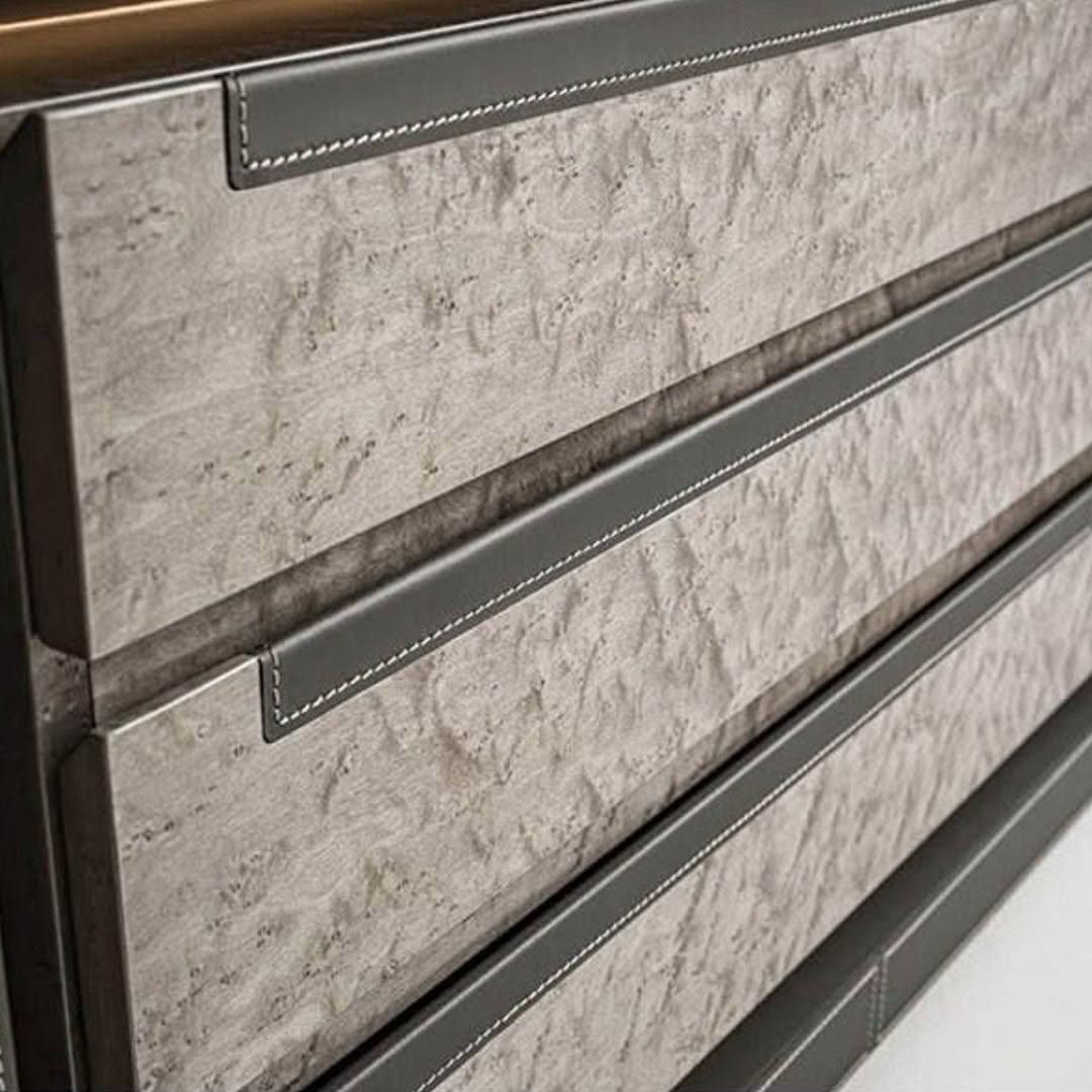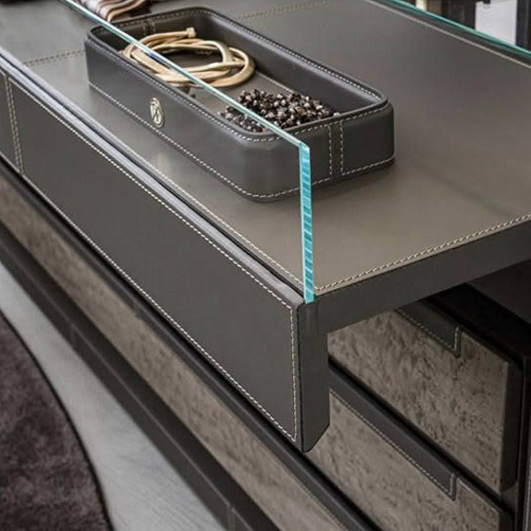 Elegance in the proportions with a backlit structure: the sliding transparent drawer is used as showcase, while the other drawers with wooden fronts and leather handles provide further storage.
