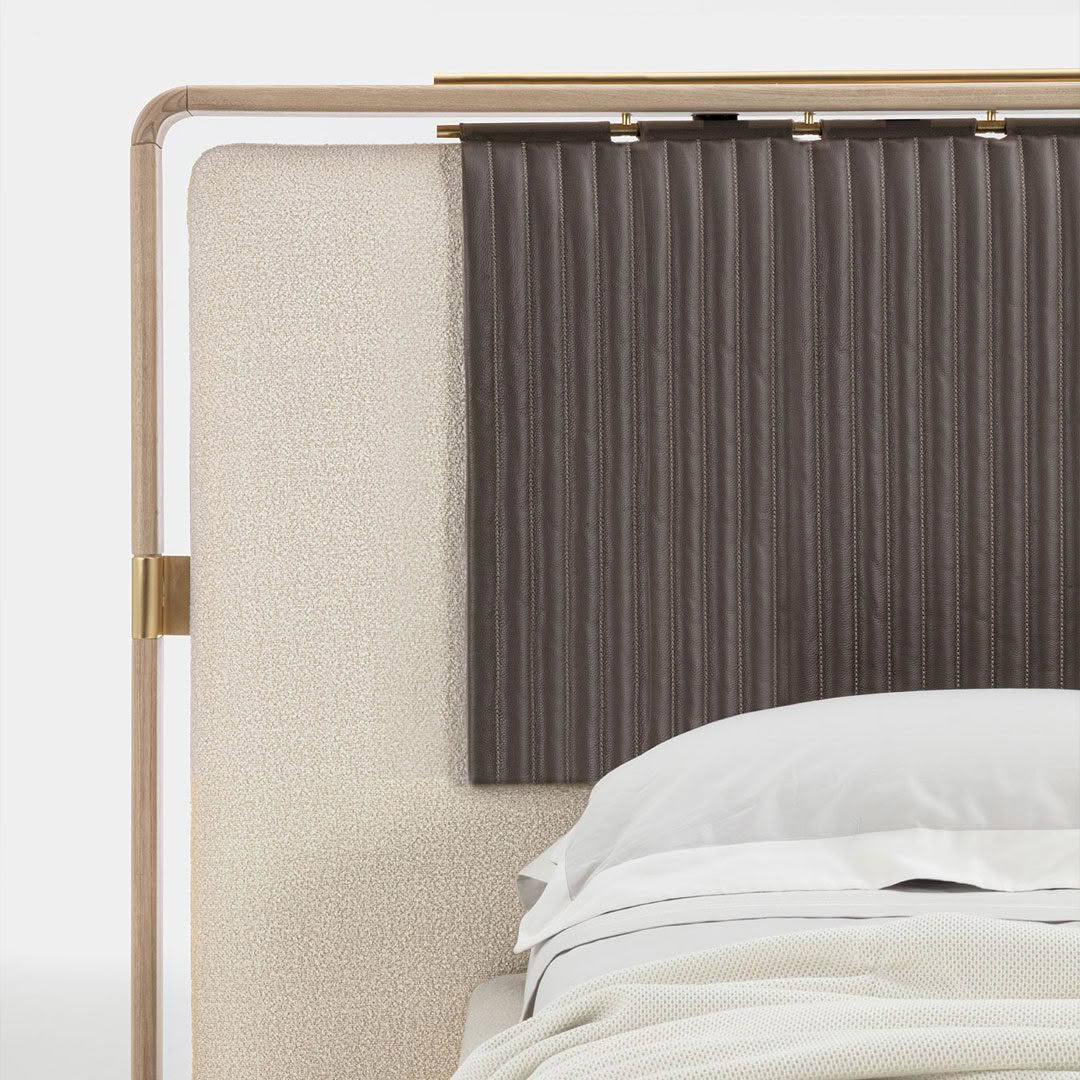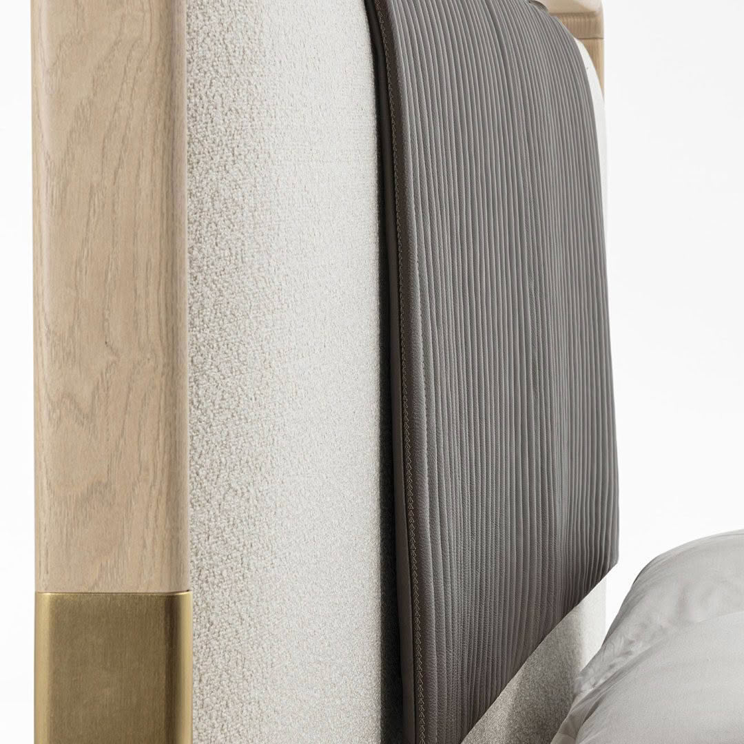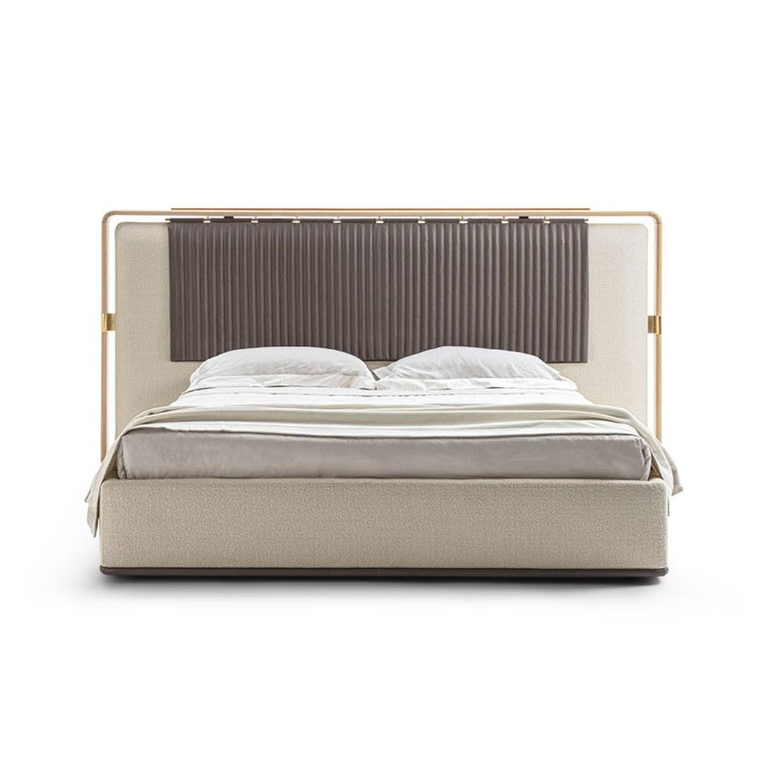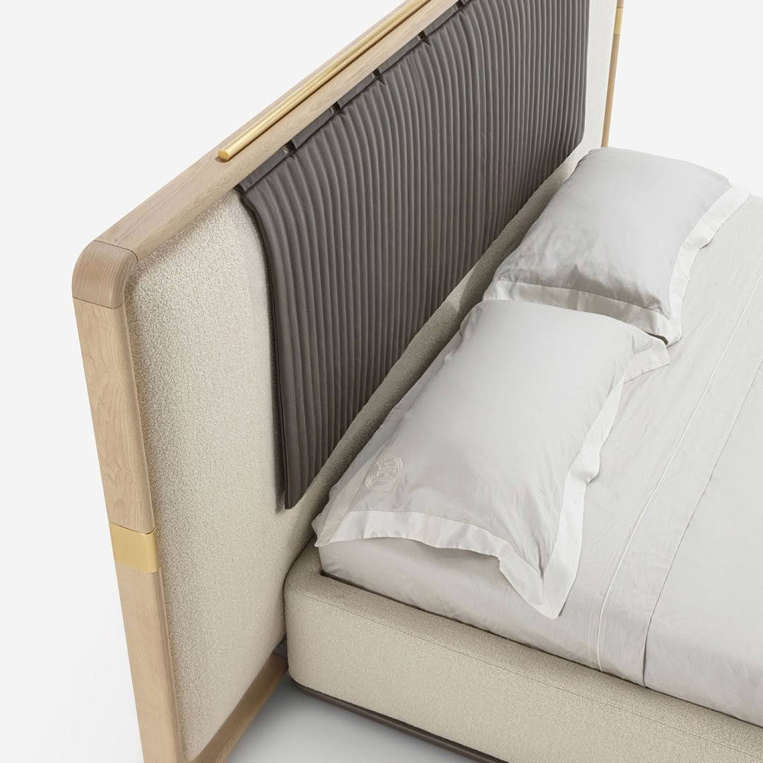 Rigorous lines and contemporary design are the hallmarks of the Lario bed, design by Andrea Bonini, thanks to its search for timeless elegance and meticulous attention to details. Lario bed features a high headboard with an external wooden frame, which encloses a padded panel covered in fabric or leather. The panel is supported by golden metal details and seems hanging like a painting in the background. In the Quilt version, the insert on the headboard is quilted vertically. The sturdy and solid bed frame, enriched by an elegant base covered in leather, offers a sophisticated visual contrast to the aerial headboard, for a glamorous approach of aesthetic purity. The mixture of different materials and textures makes the Lario bed the undisputed protagonist of the night area. The decorative cushions provide an additional textile addition, for a refined detail.