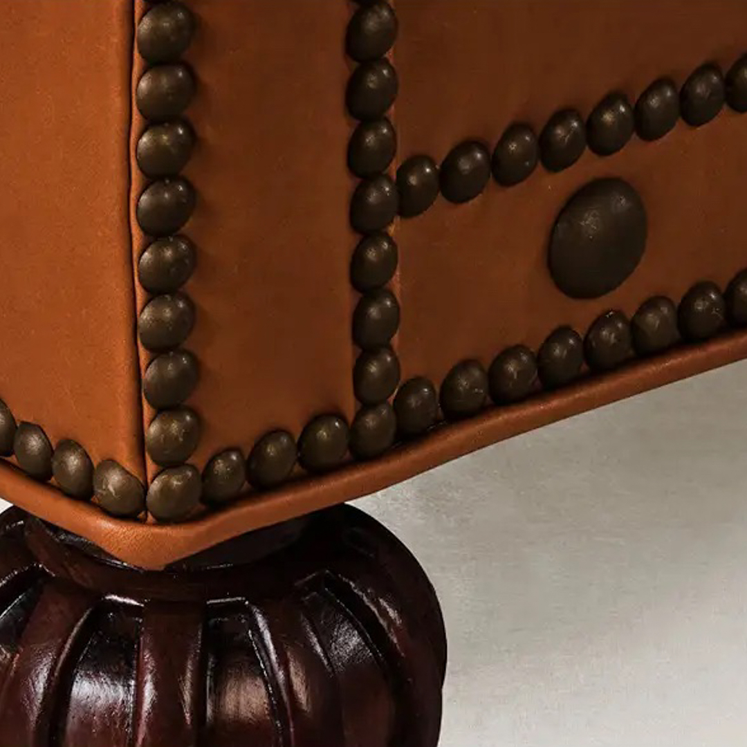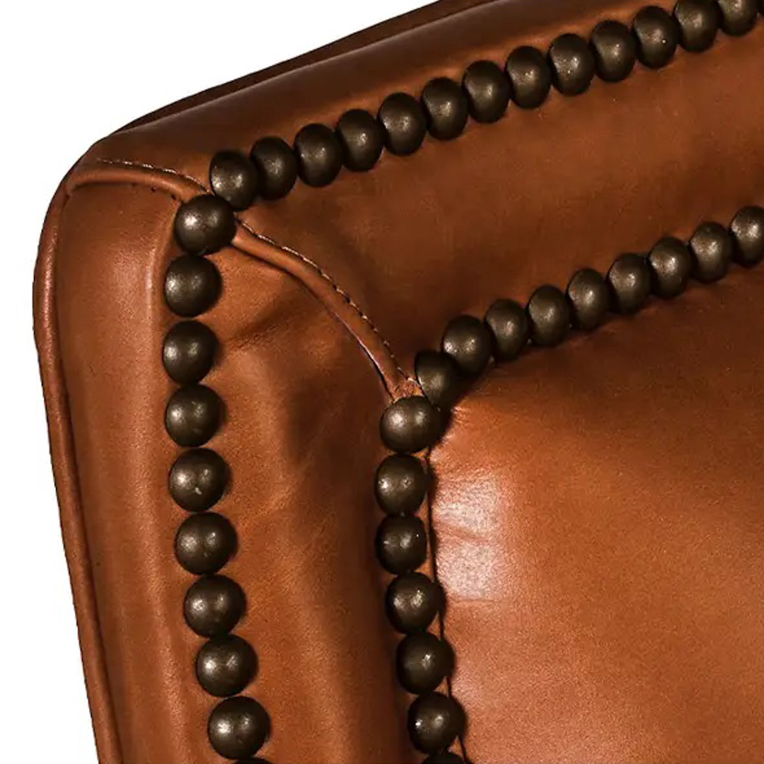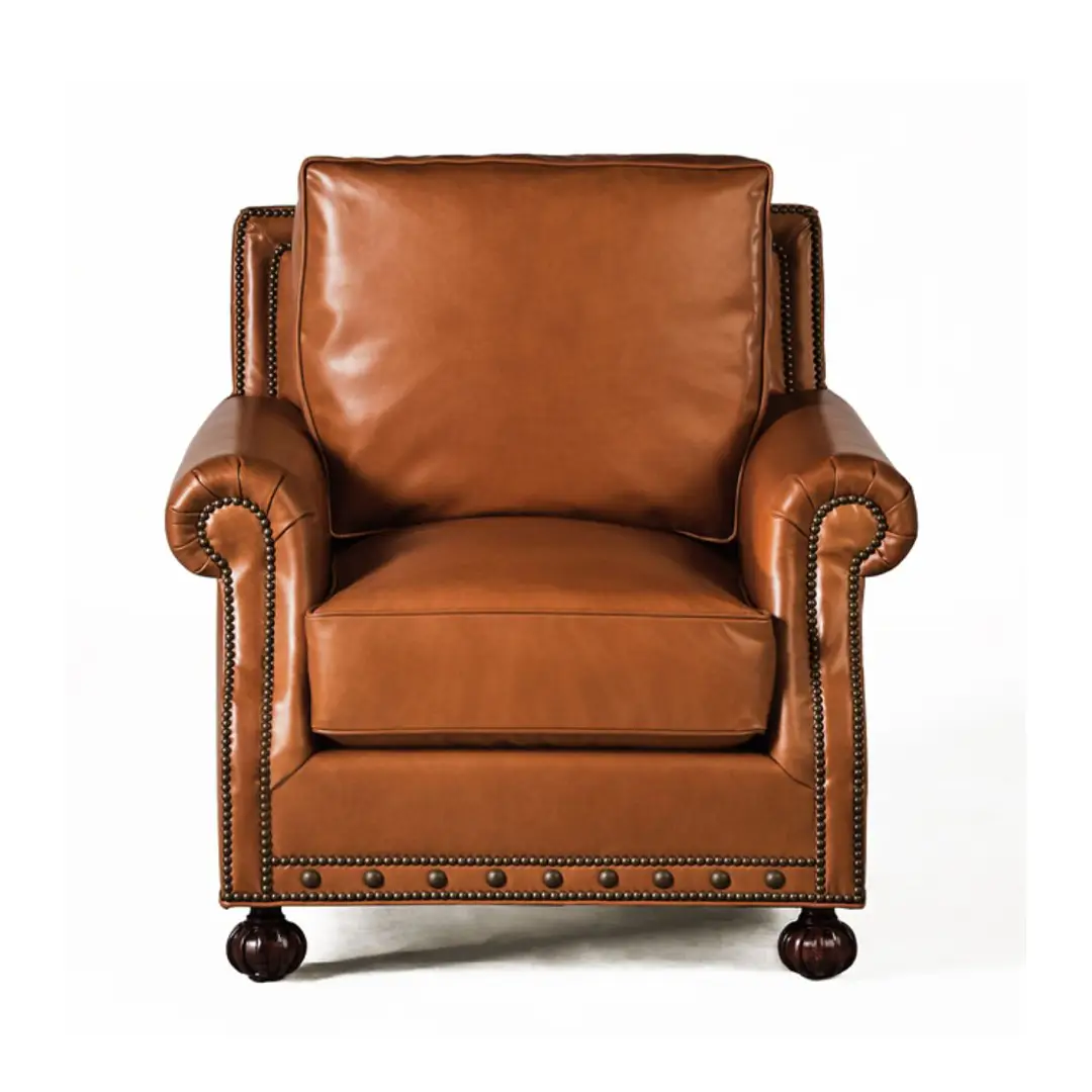 Casual elegance defines the Aran Isles collection, which unites solid wood with supple aniline leather. The chair is classically styled with rolled arms, brass nailhead trim, and front-facing bun feet. Premium spring-down cushions provide the perfect balance of softness and structure to the deep, comfortable seat.
