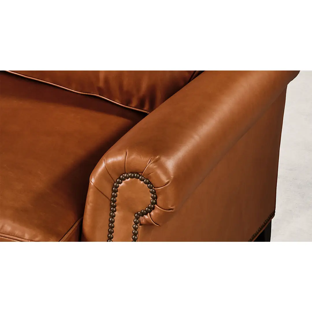 Casual elegance defines the Aran Isles collection, which unites solid wood with supple aniline leather. The sofa is classically styled with rolled arms, brass nailhead trim, and front-facing bun feet. Premium spring-down cushions provide the perfect balance of softness and structure to the deep, comfortable seats.
