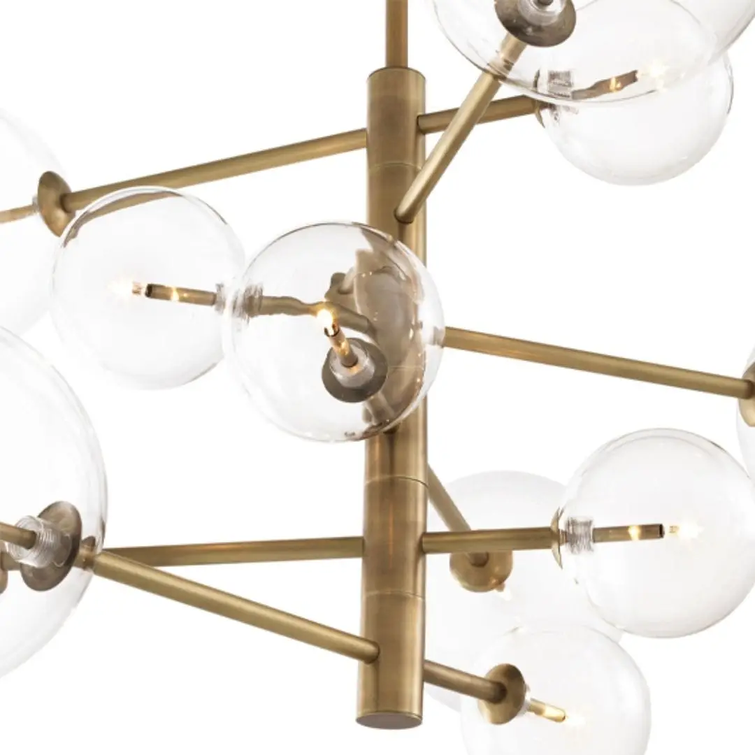 Create a retro-chic focal point in your living space with the Argento S Chandelier. This asymmetrical interpretation of Mid-Century Modern designer lighting instantly elevates your room! It features an antique brass finish and 12 hand blown clear glass globes.