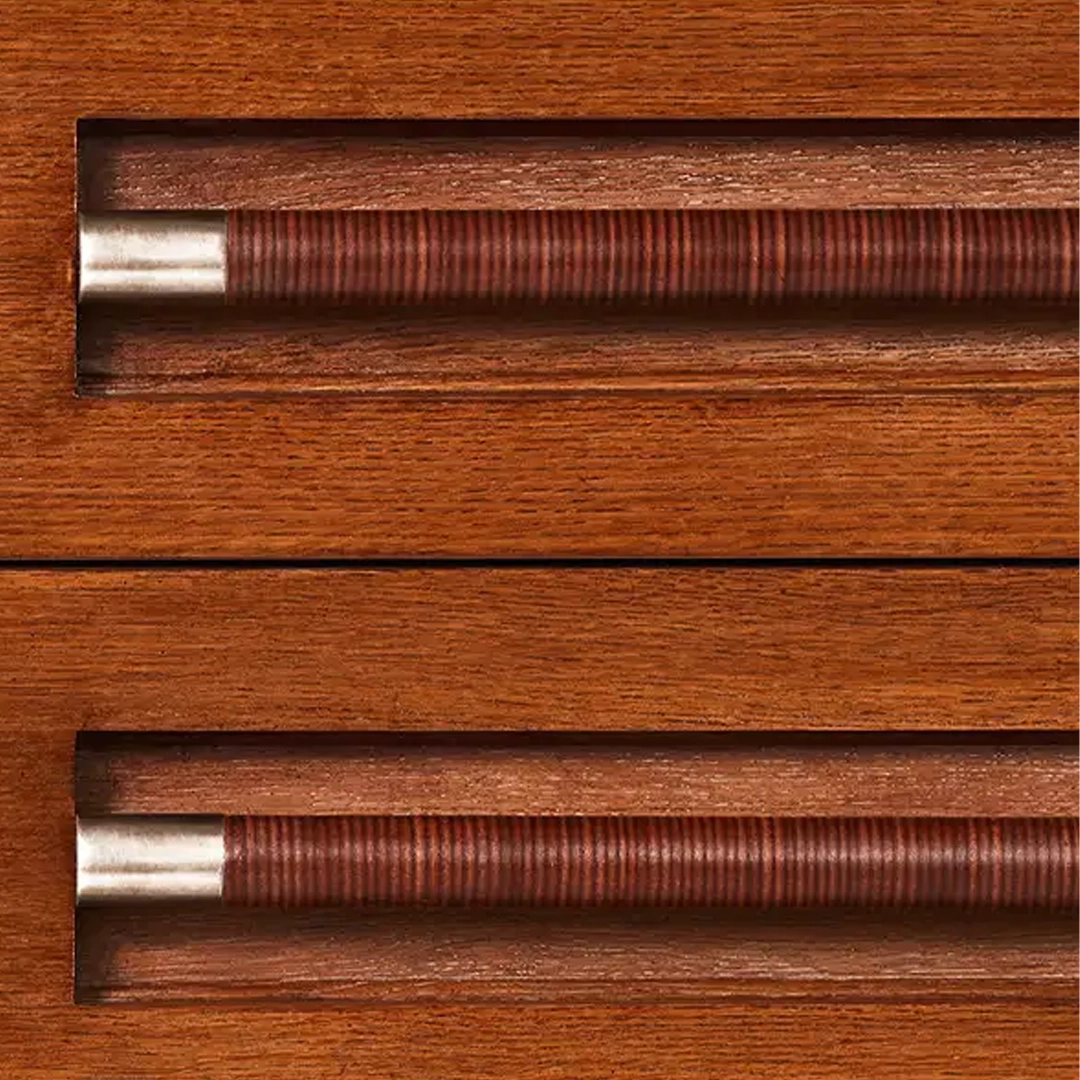 The Banks nightstand features a three-drawer silhouette veneered in quarter-sawn oak with rich flecked details throughout the natural wood grain. Carved alcoves call attention to the striking drawer pulls set within, which are masterfully crafted from stacked leather and hand-cast solid brass.