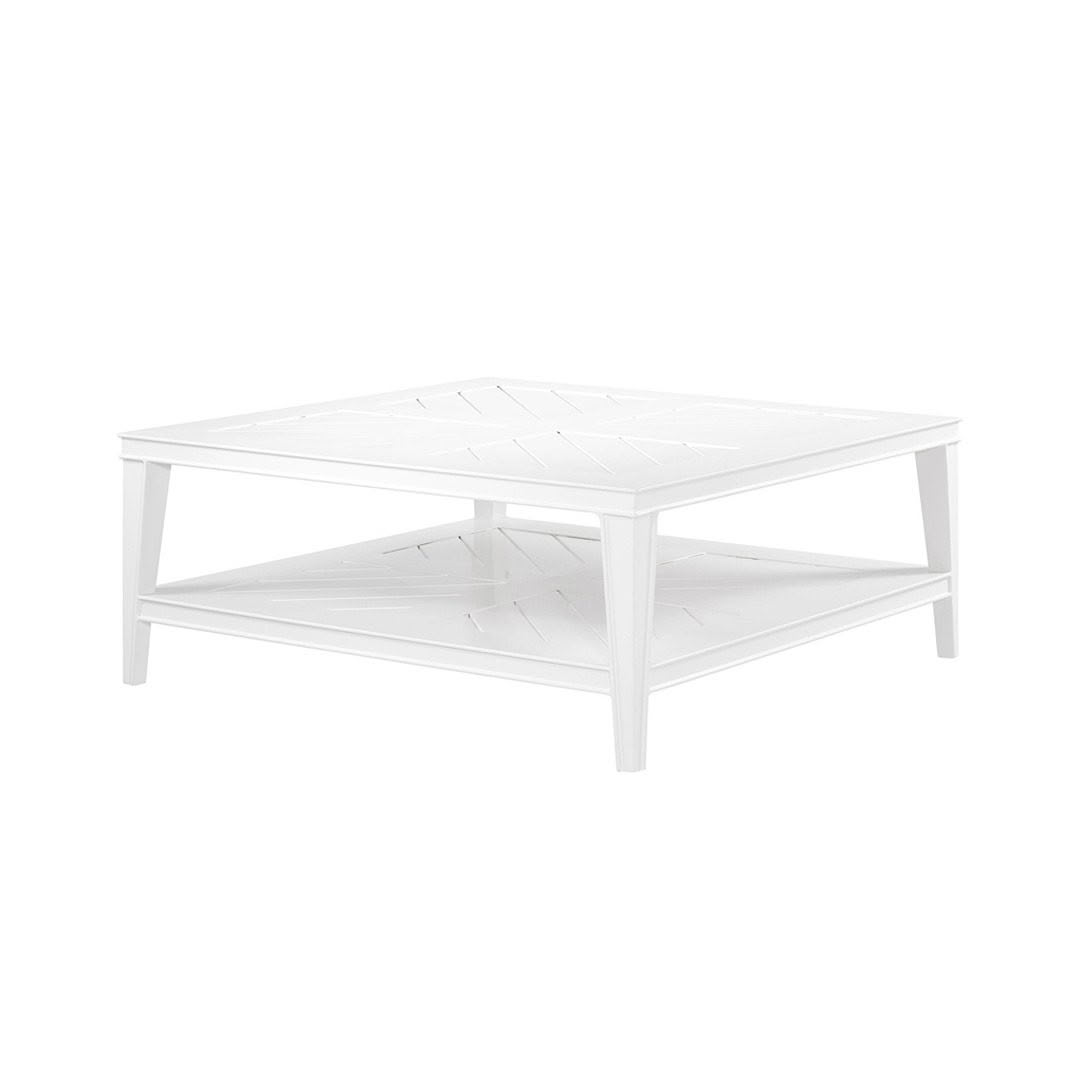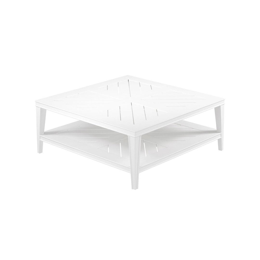 Made from heavy duty materials, the Bell Rive Coffee Table is a stylish addition to your conservatory, veranda, patio or garden. With its sophisticated look and white lacquer frame, this attractive square coffee table with openwork tabletop and lower shelf will make a great focal point for your outdoor living space.