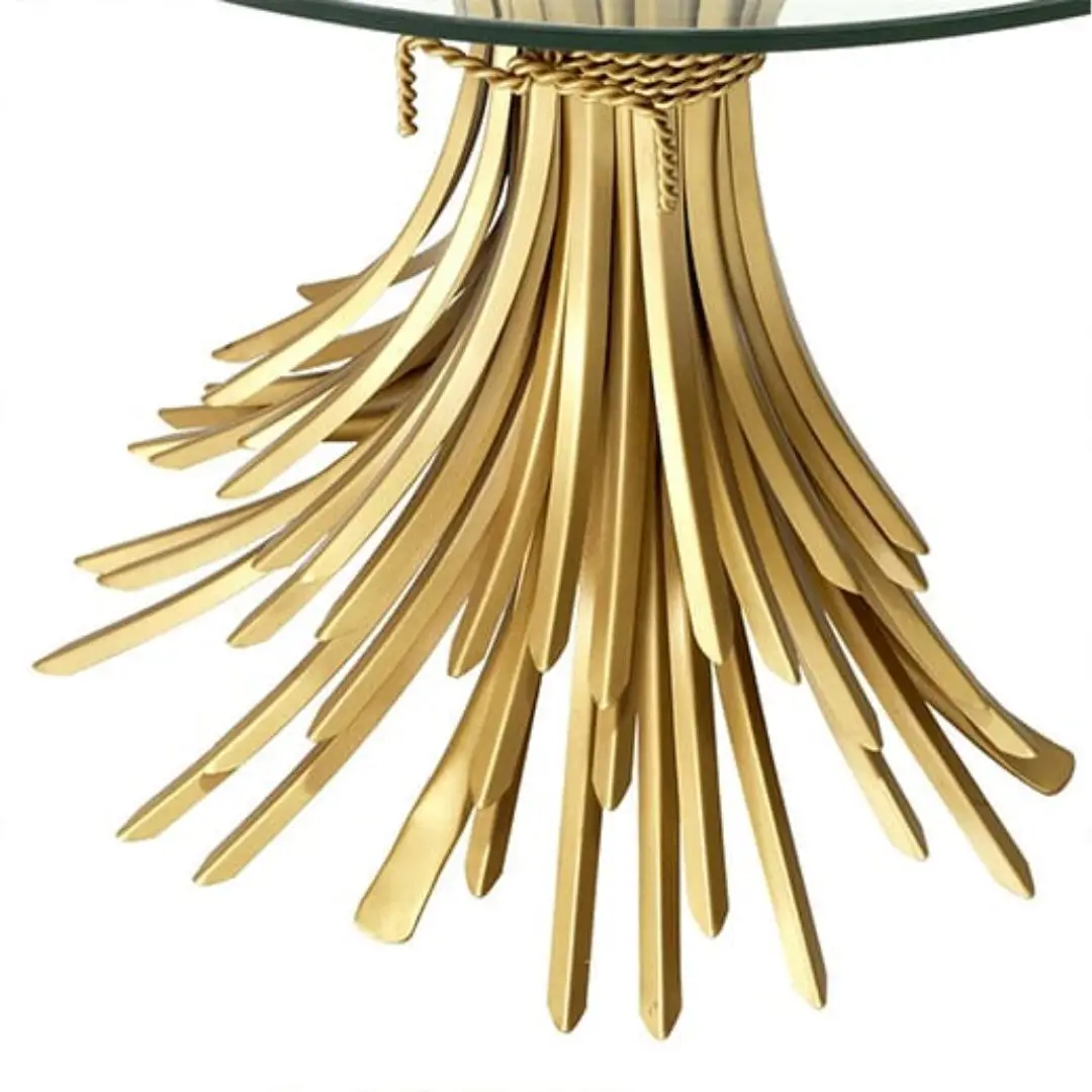 Sculpted from iron in an antique gold finish, the dazzling Bonheur Console Table includes a sheaf-shaped base and a bevelled clear glass tabletop. Originally a symbol of prosperity and hospitality, the sheaf signifies one has worked hard and is now enjoying the good life.