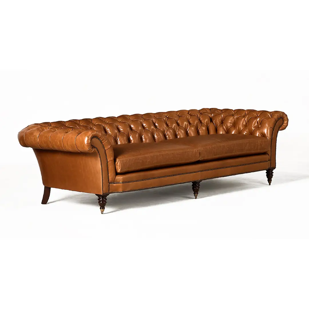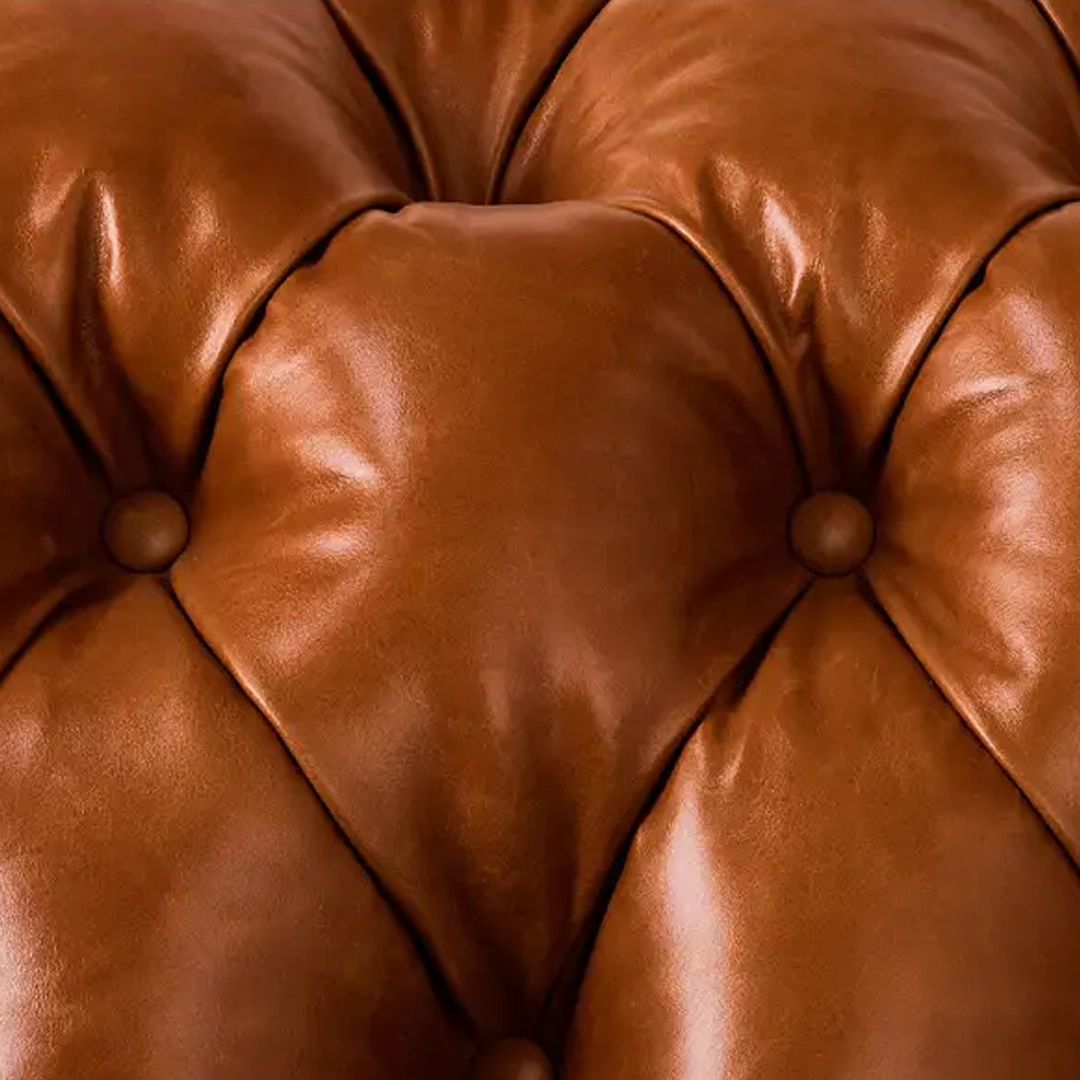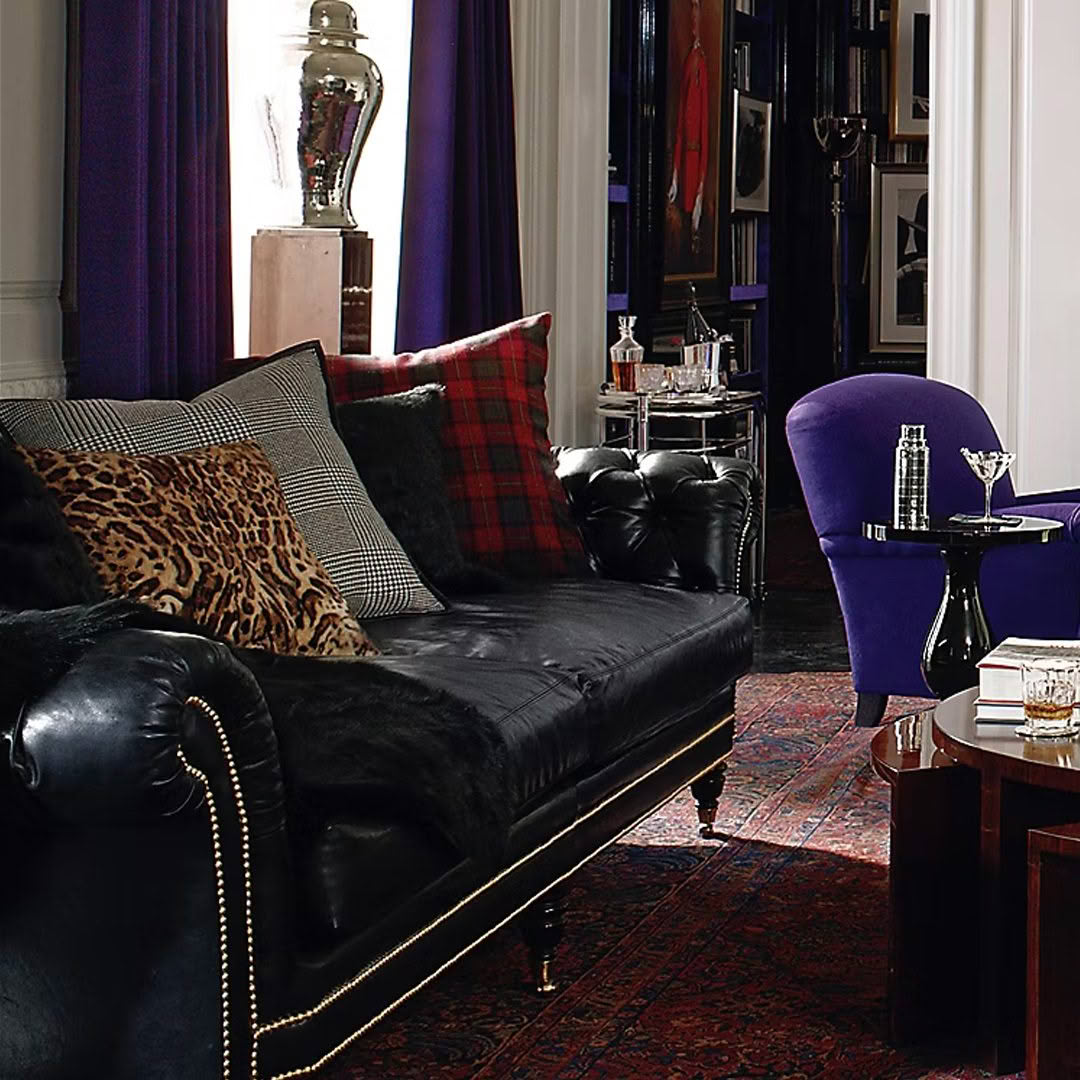 Inspired by the tailored luxury inherent to London’s Savile Row, Ralph Lauren’s Brook Street sofa is upholstered in natural English cowhide, affording a soft hand and refined appearance. Set upon turned beechwood legs with front-facing casters, the elegant profile showcases a tufted back, scrolling arms, and gleaming nailhead trim.