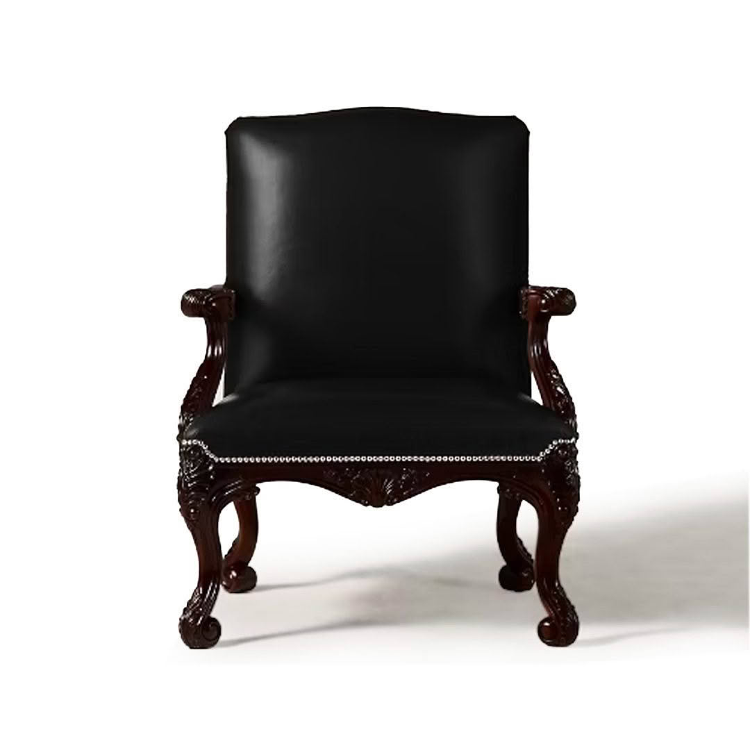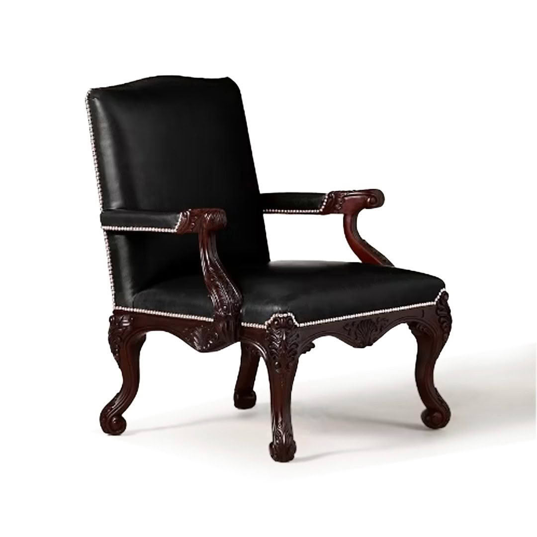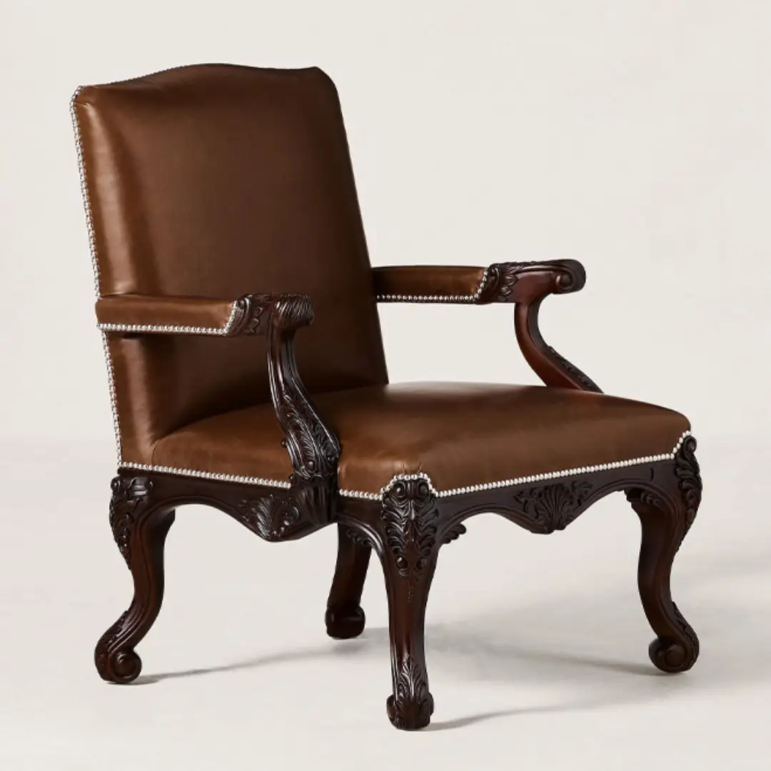 Ralph Lauren’s Clivedon chair showcases an exquisitely carved solid wood frame inspired by the ornate style of Louis XVI. It features an upholstered seat and back with exposed arms and is punctuated with gleaming nailhead trim.