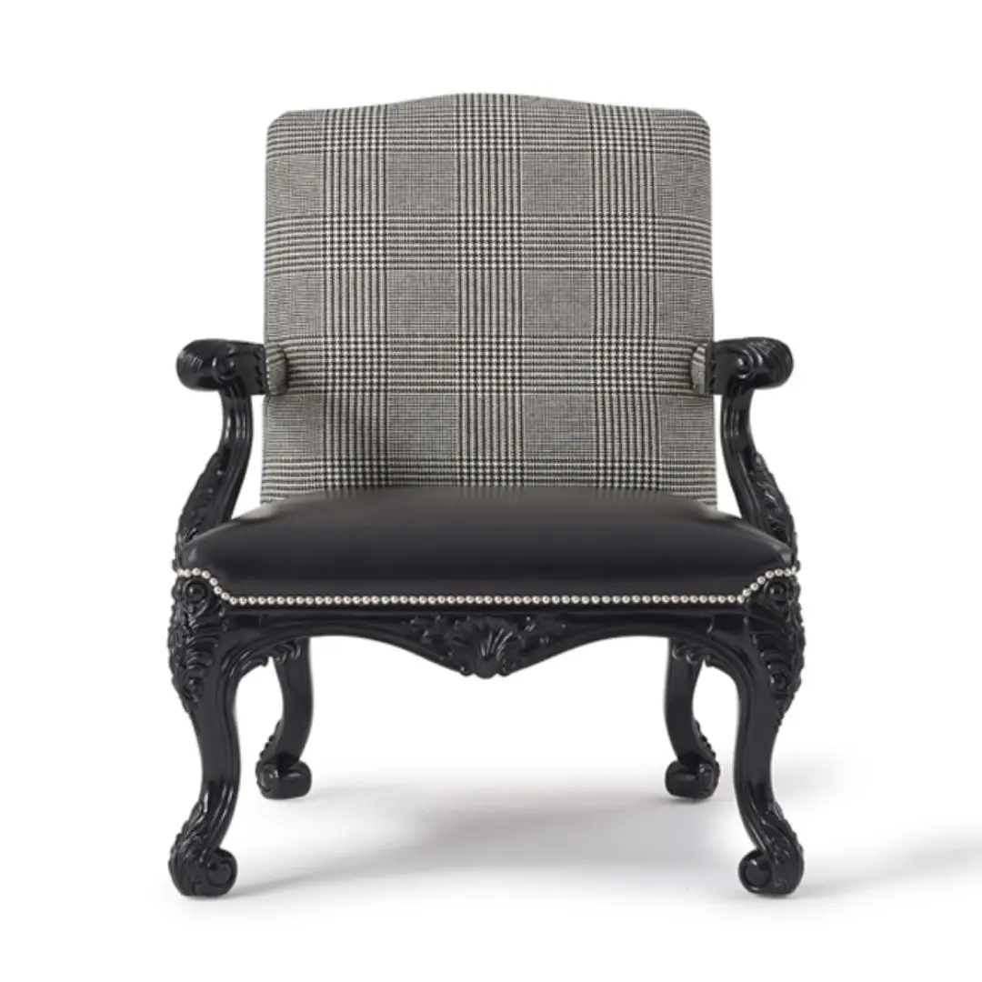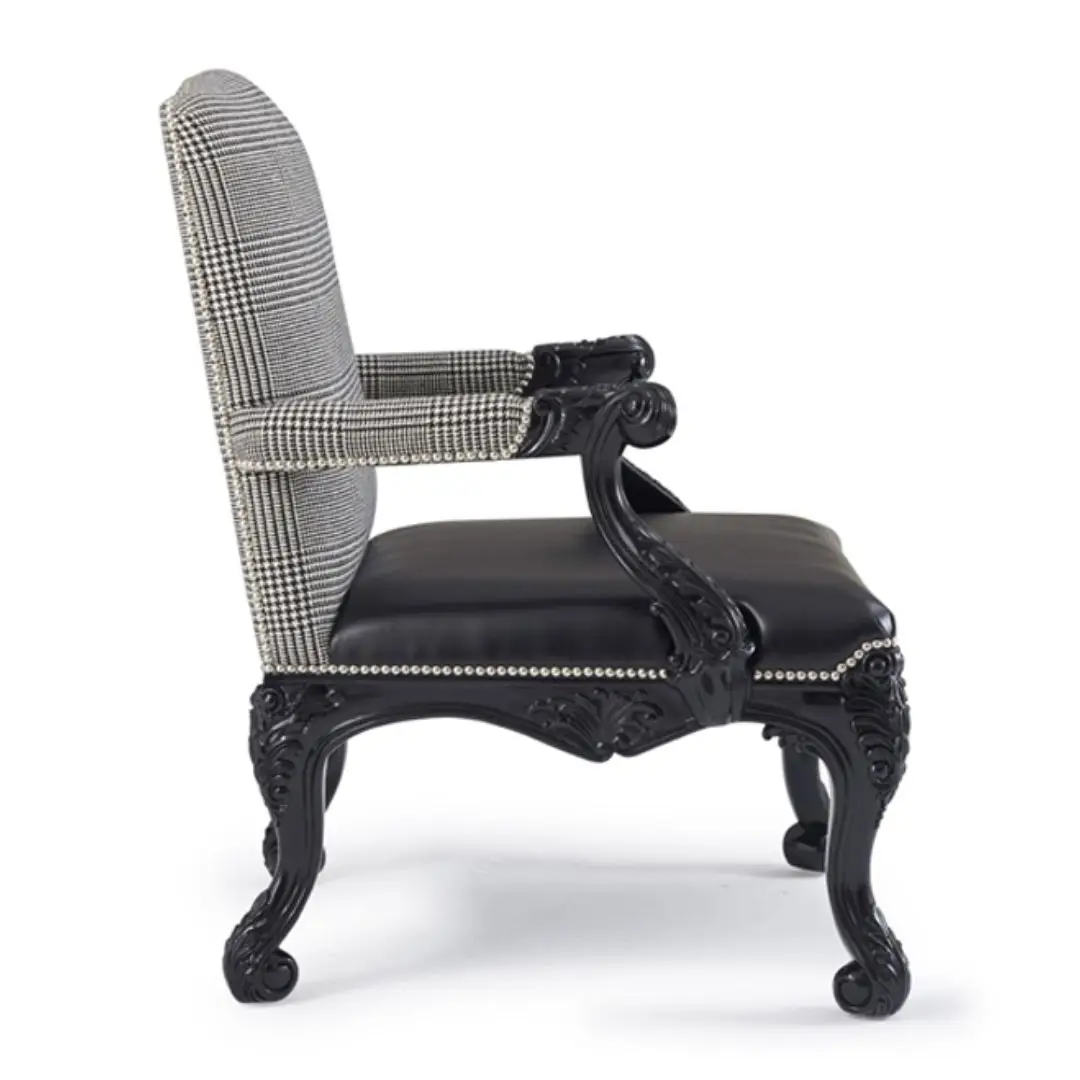 FS – CLIVEDON CARVED CHAIR – WESSEX GLEN PLAID BACK & ARMRESTS – SEAT HUGHES LEATHER – BLACK L9329