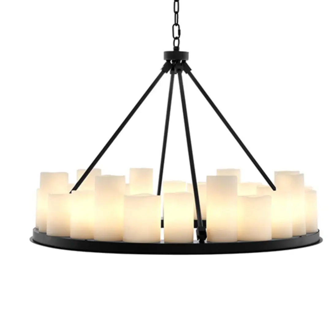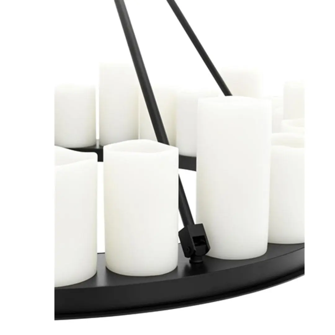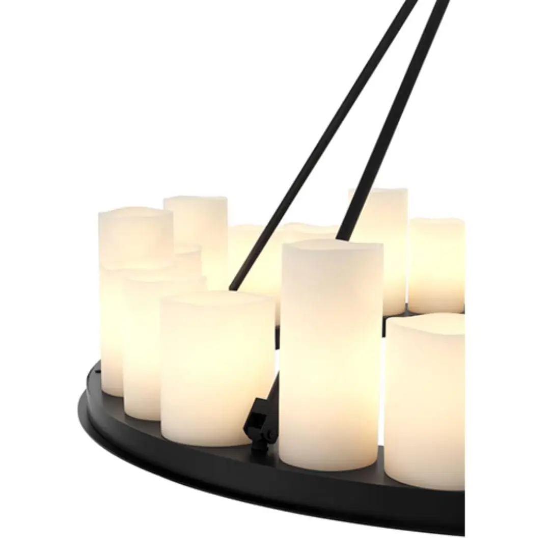 The robust black finished frame of the Commodore Chandelier is supported by a strong chain link ceiling canopy. It features a plate with 24 tapered faux pillar candles which suggest the authentic formation of melting wax. The bottom of the plate features 4 recessed LED downlights. The lights in this chandelier can be turned on and off by using the included remote control. Several different settings are possible. This chandelier is not dimmable and cannot be used with a dimmer.