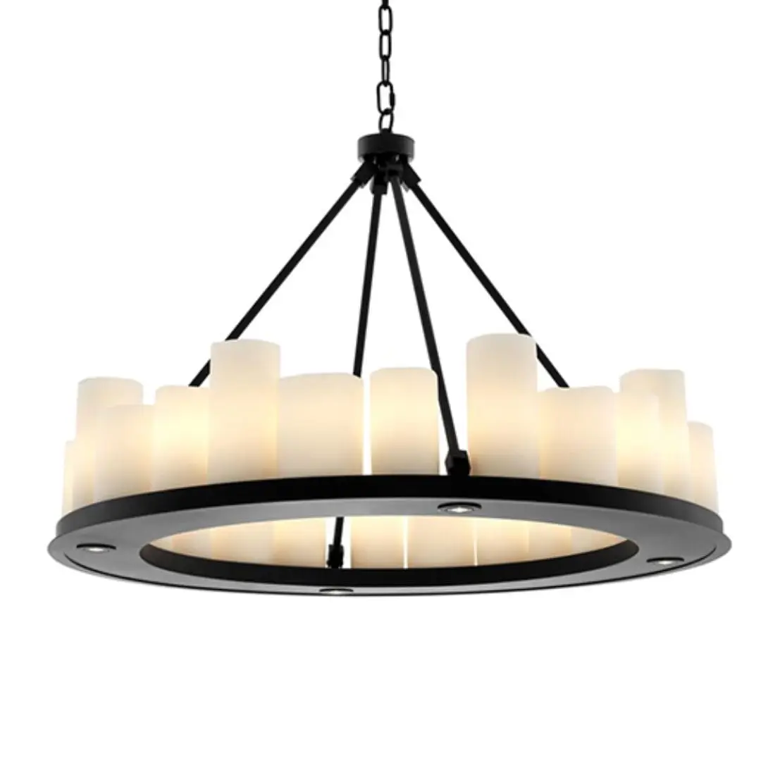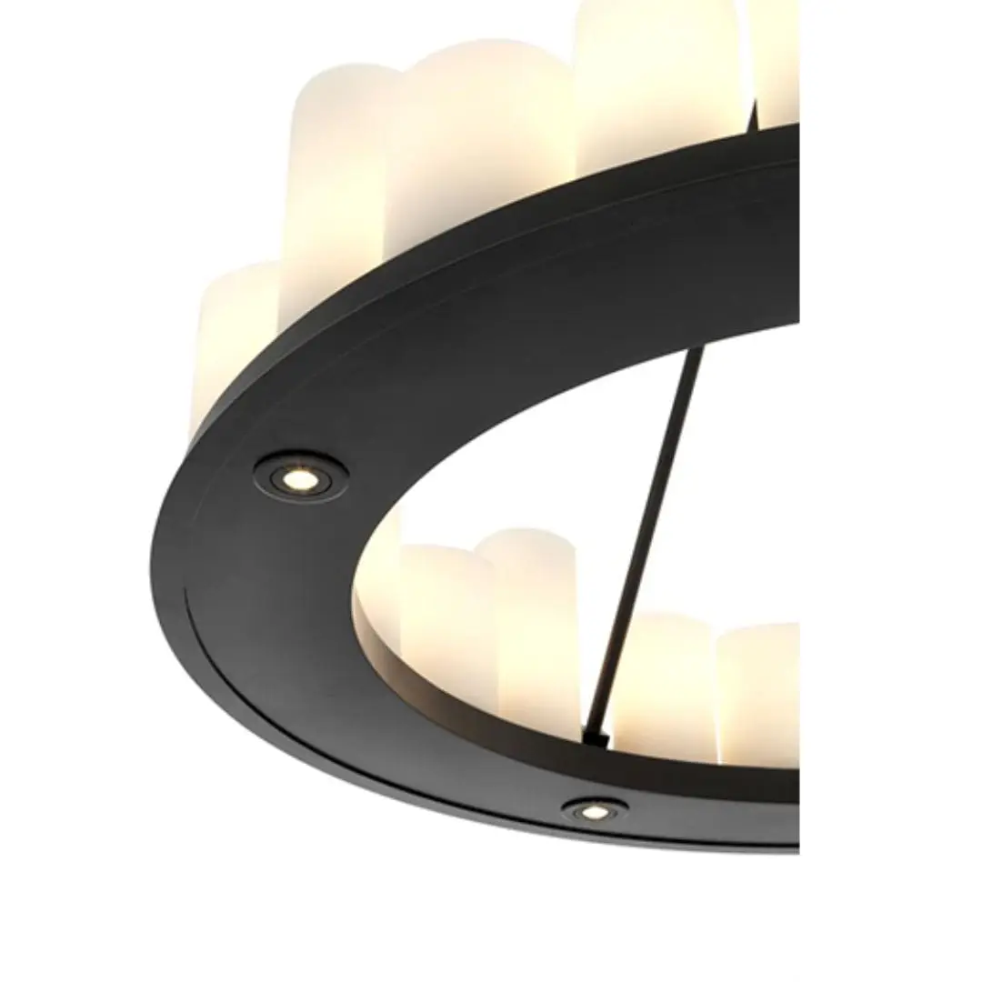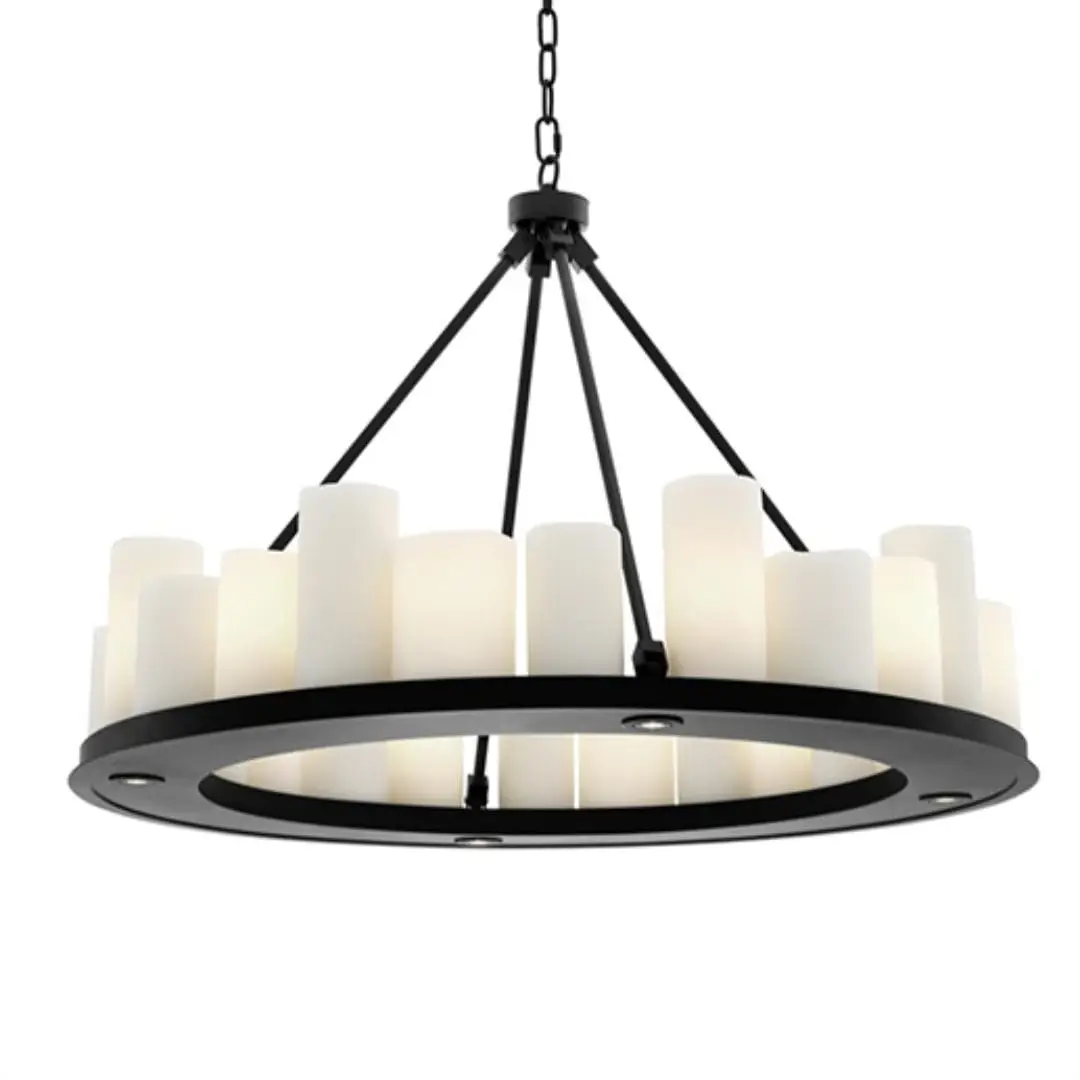The robust black finished frame of the Commodore Chandelier is supported by a strong chain link ceiling canopy. It features a plate with 24 tapered faux pillar candles which suggest the authentic formation of melting wax. The bottom of the plate features 4 recessed LED downlights. The lights in this chandelier can be turned on and off by using the included remote control. Several different settings are possible. This chandelier is not dimmable and cannot be used with a dimmer.