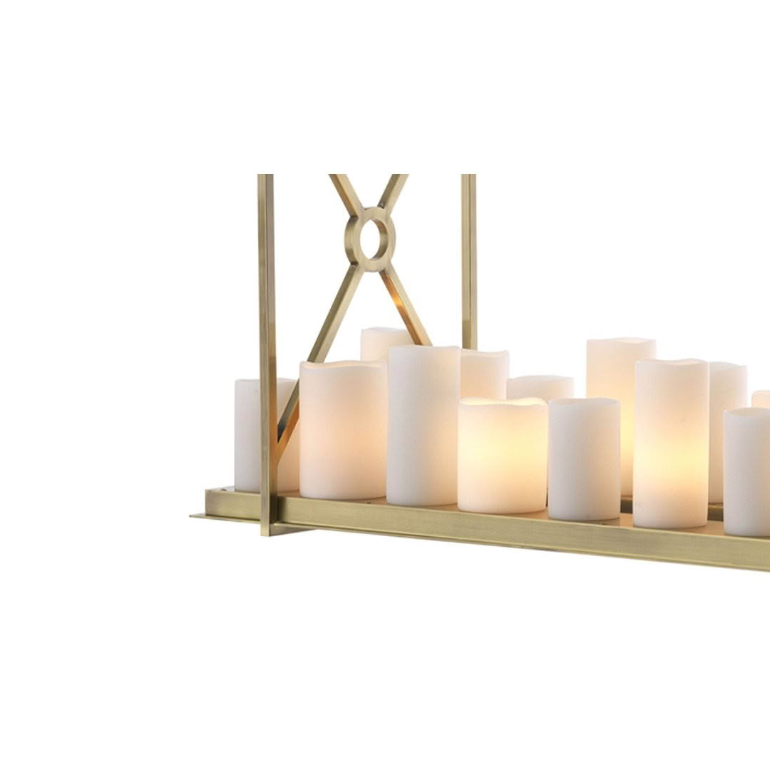 The light brushed brass finish frame of the Commodore Chandelier is supported by a strong chain link ceiling canopy. It features a rectangular plate with 22 tapered faux pillar candles which suggest the authentic formation of melting wax. The bottom of the plate features 4 recessed LED downlights. The lights in this chandelier can be turned on and off by using the included remote control. Several different settings are possible. Please note: this chandelier is not dimmable and cannot be used with a dimmer.