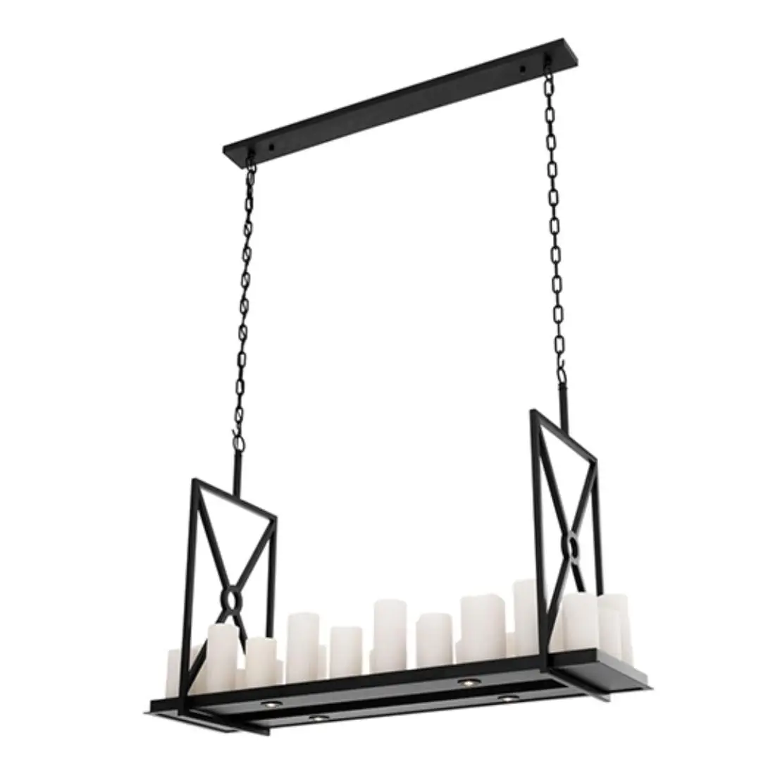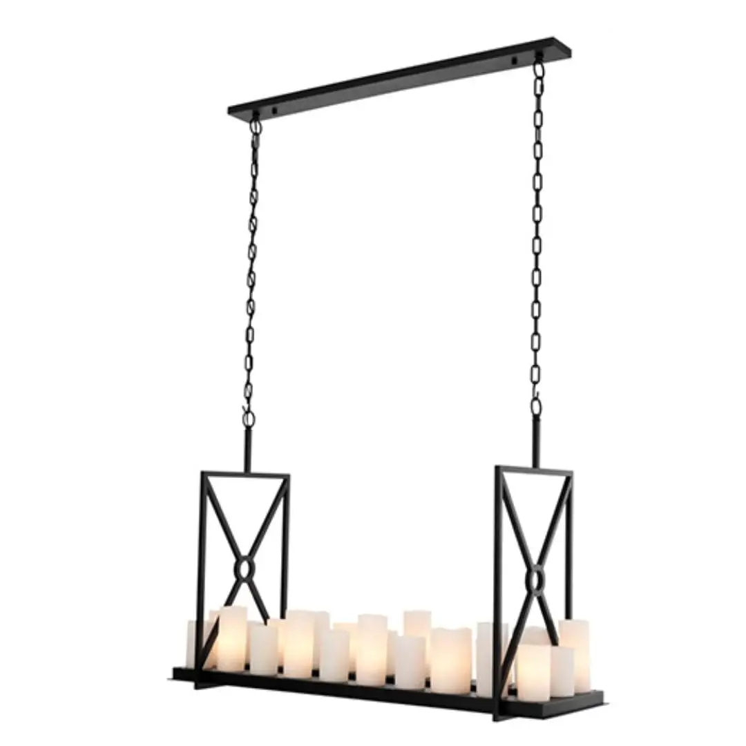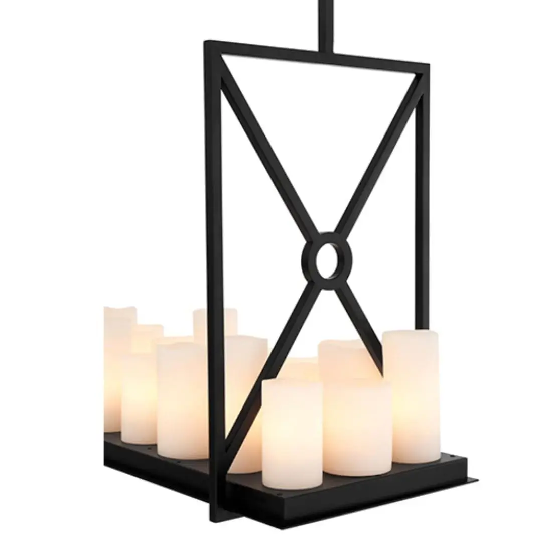 The robust black finished frame of the Commodore Chandelier comprises two square panels with an integrated x-shaped design and a rectangular tray with 22 faux pillar candles and 4 recessed LED downlights. The lights in this chandelier can be turned on and off by using the included remote control. Several different settings are possible. This chandelier is not dimmable and cannot be used with a dimmer.