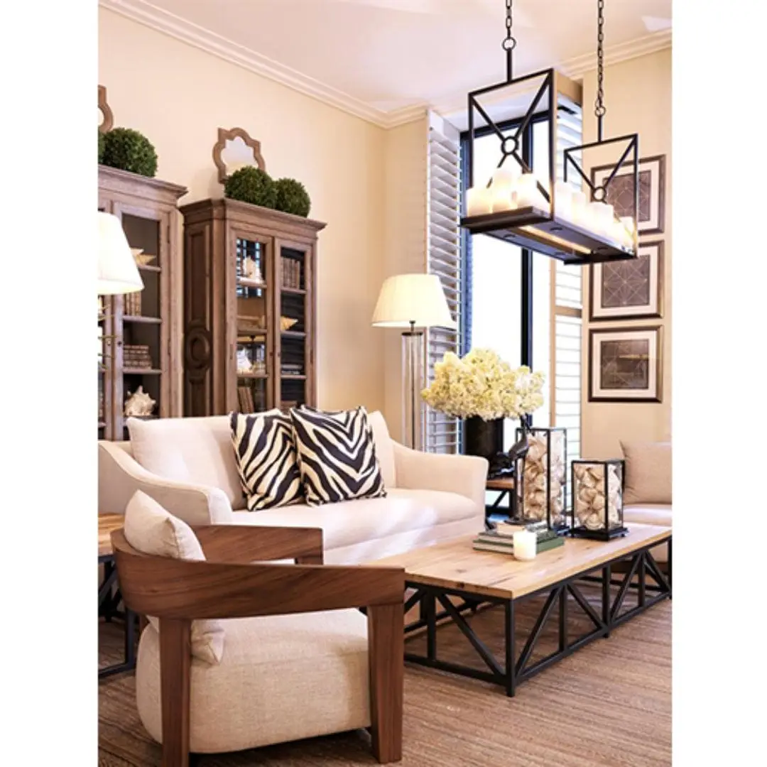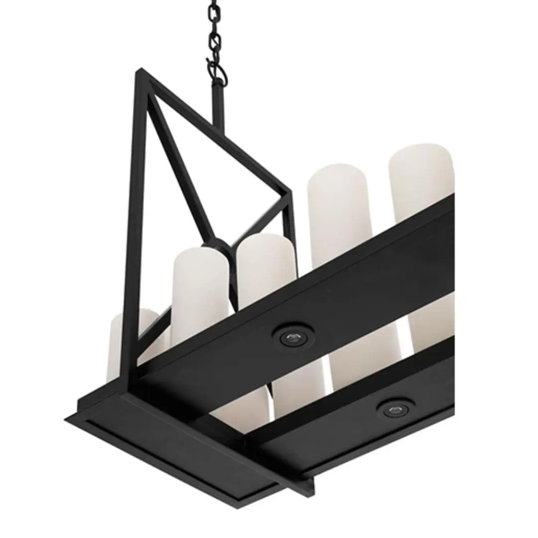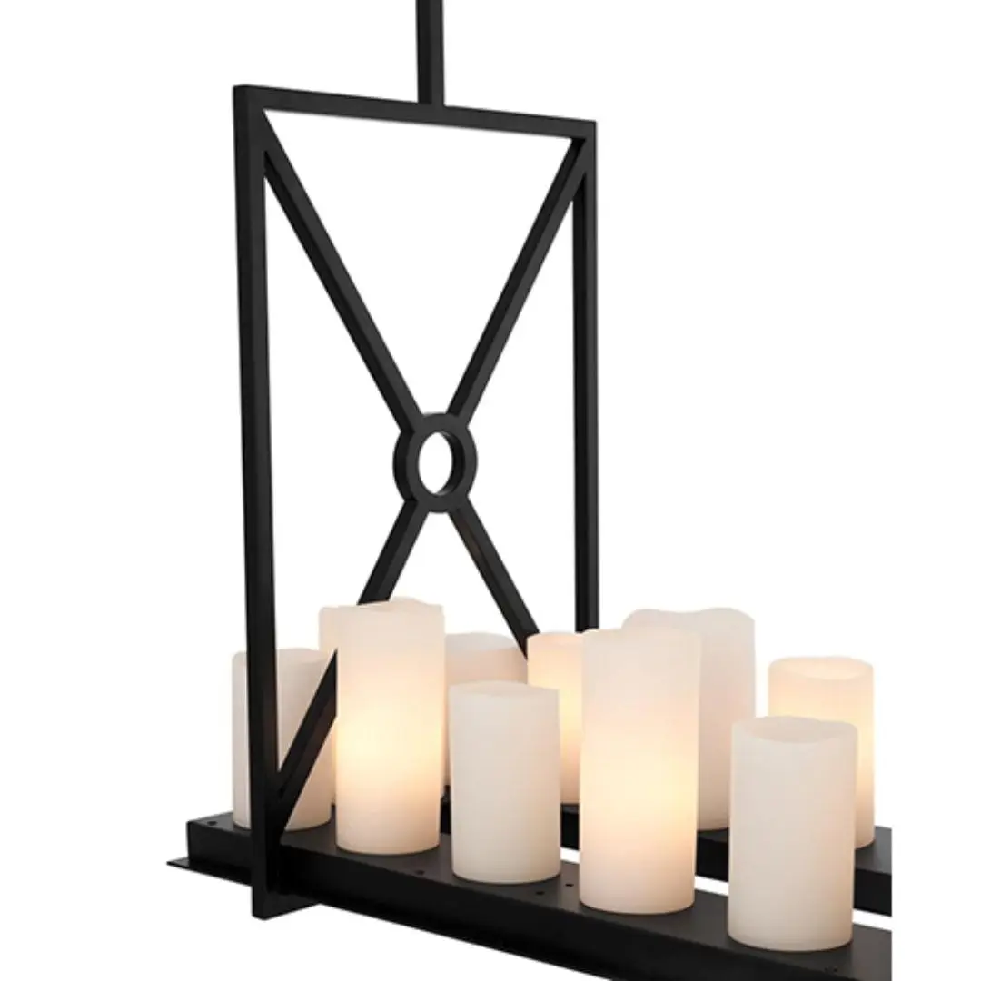 The robust black finished frame of the Commodore Chandelier comprises two square panels with an integrated x-shaped design and a rectangular tray with 22 faux pillar candles and 4 recessed LED downlights. The lights in this chandelier can be turned on and off by using the included remote control. Several different settings are possible. This chandelier is not dimmable and cannot be used with a dimmer.