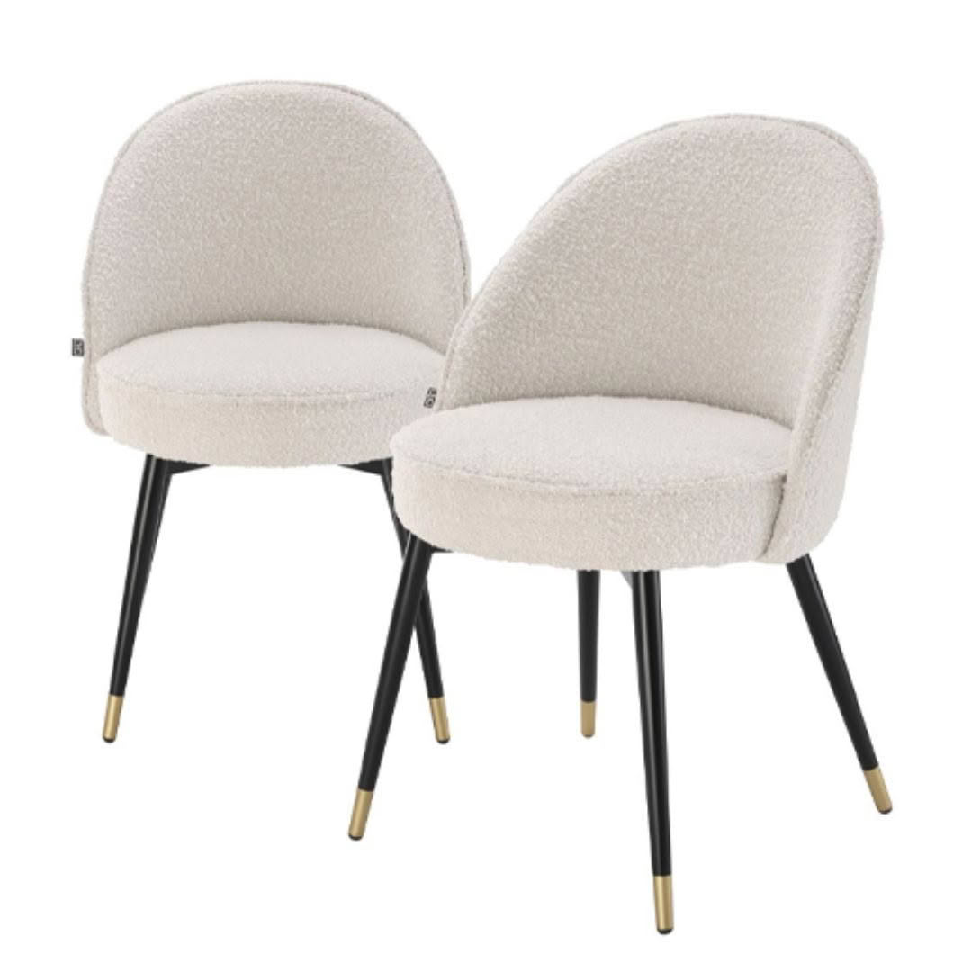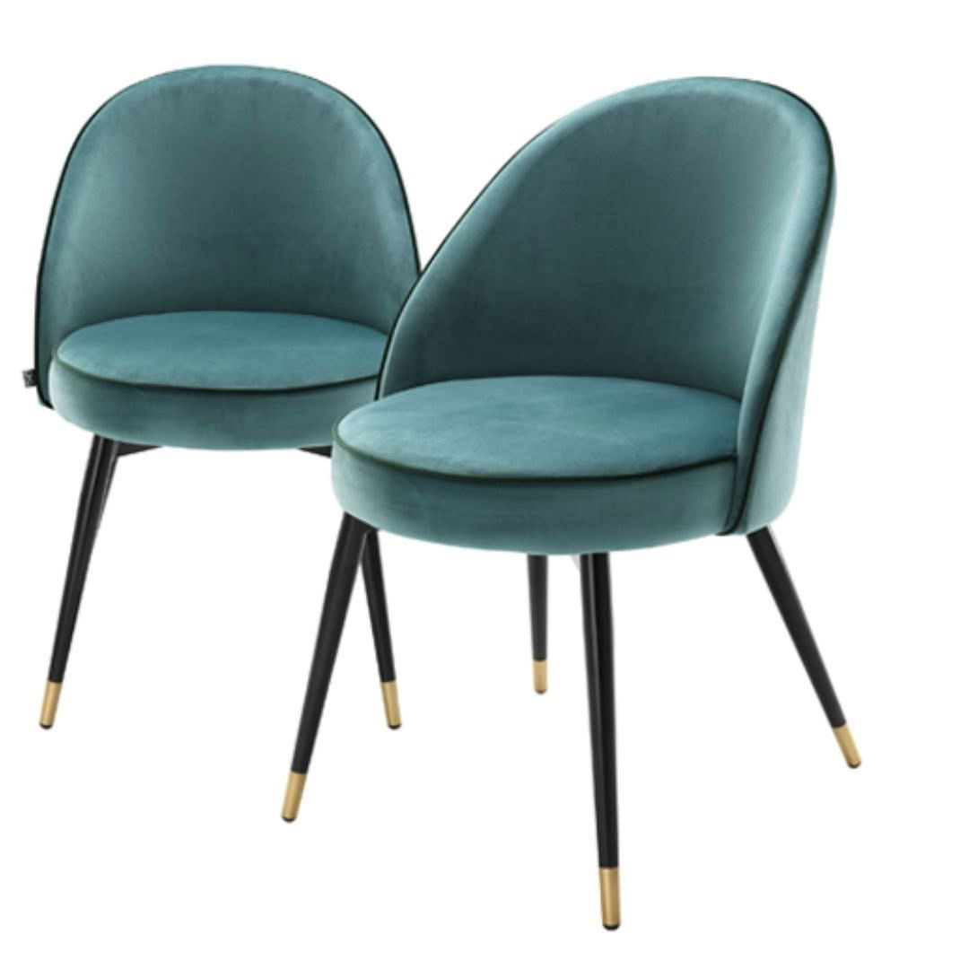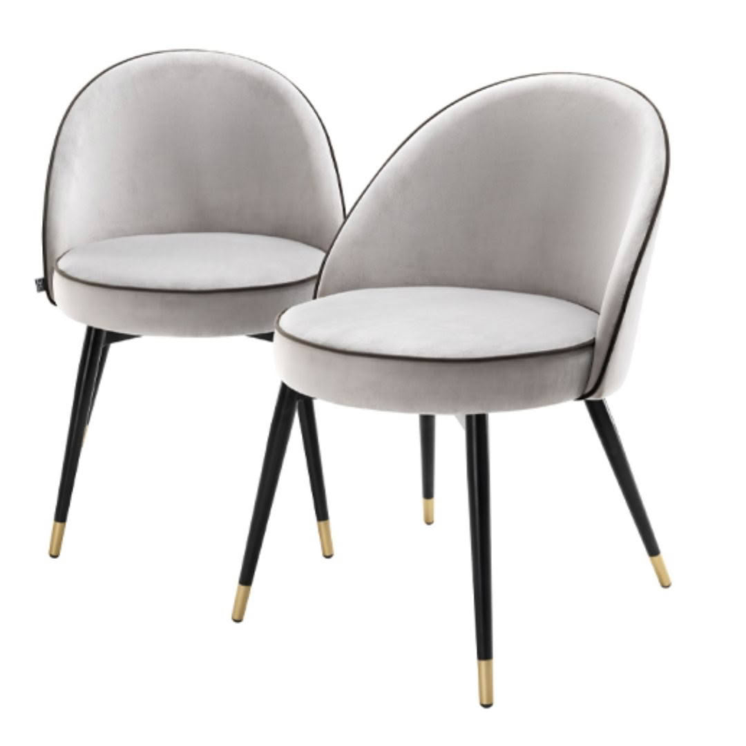 Add Mid-Century Modern appeal to your dining room or kitchen with this stylish set of 2 Cooper Dining Chairs. Each chair is characterised by a seating and backrest in a Roche dark grey velvet upholstery with black piping, tapered black legs and brass caps. Team up different chairs from this series for an opulent style!