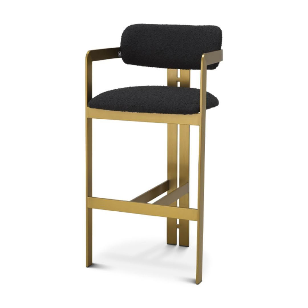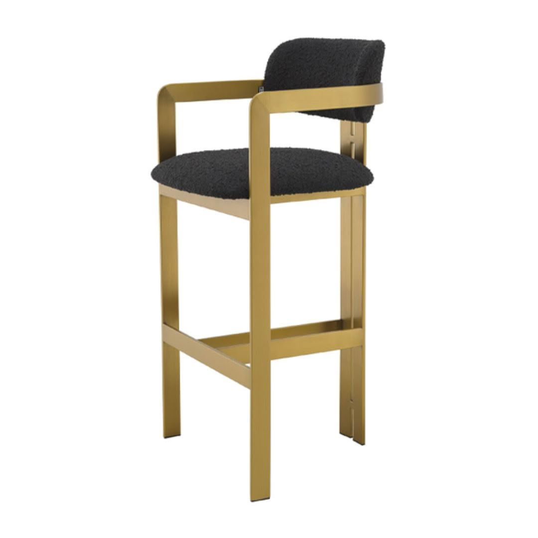 Inviting and refined with a hint of retro design, the Donato Bar Stool will add a touch of vintage style to any space. Featuring a geometric brushed brass frame with a circular seat and curved backrest in a Bouclé black upholstery, this bar stool pairs comfort with functionality.