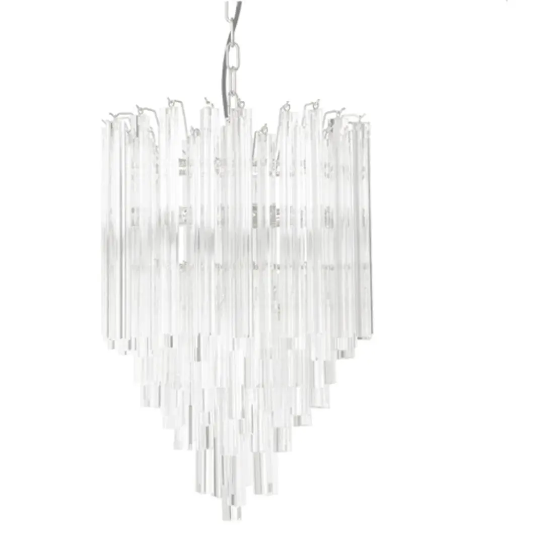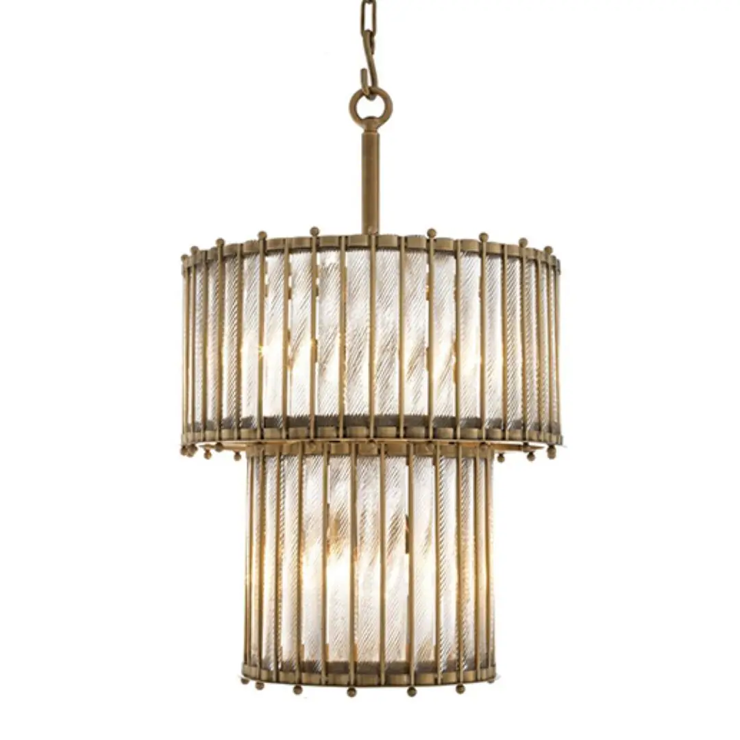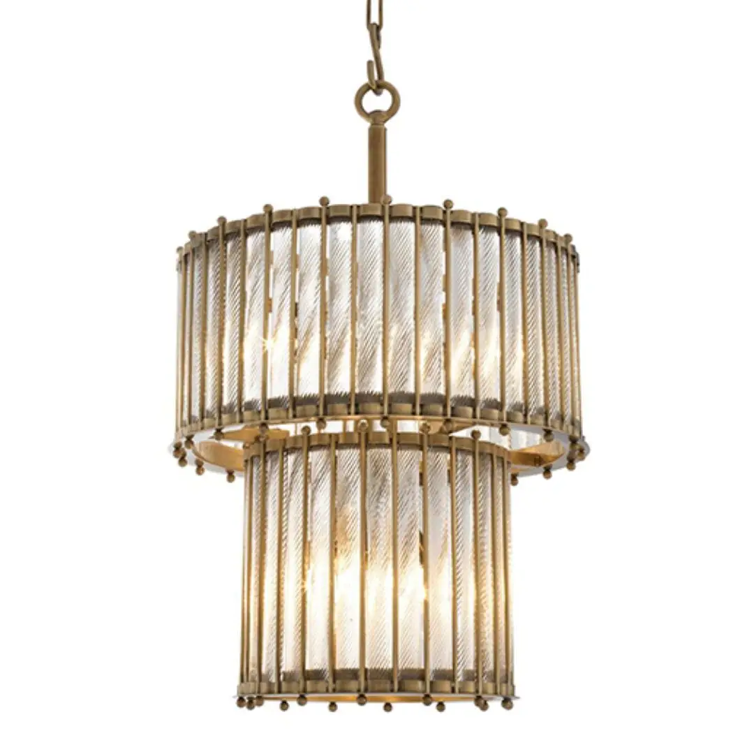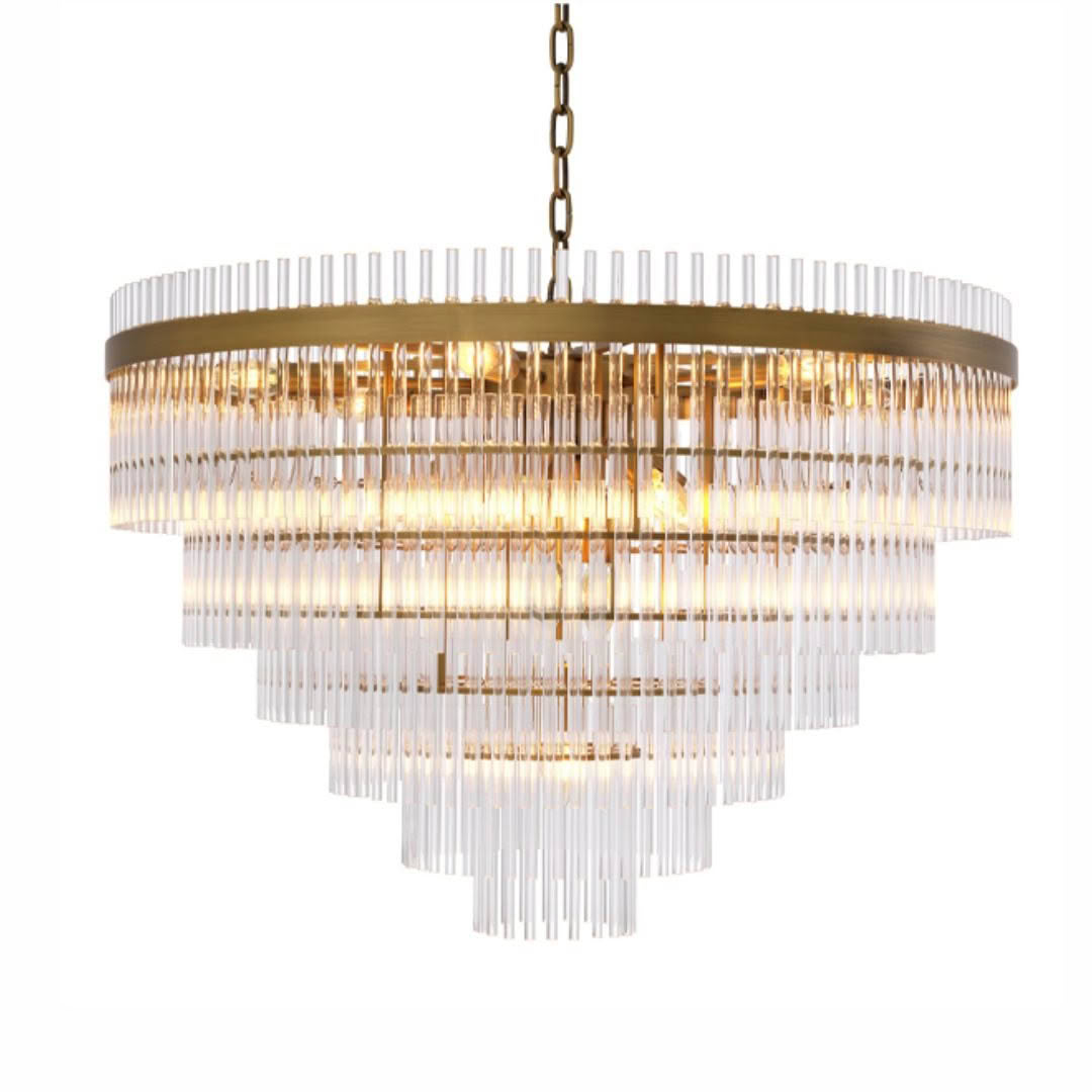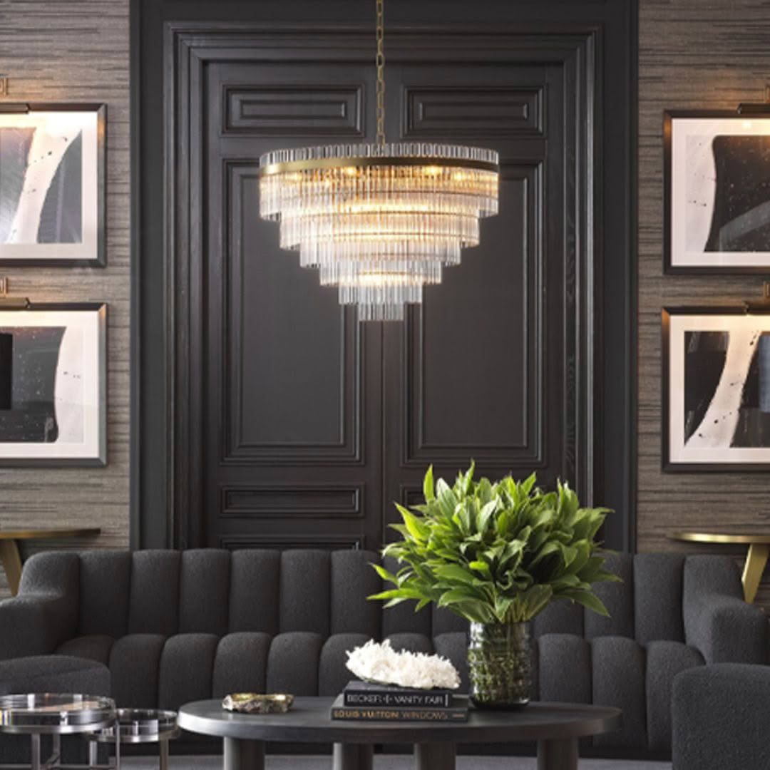 Elegant tiered glass chandelier with golden accentsElegant crystal chandeliers in a stylish living room
