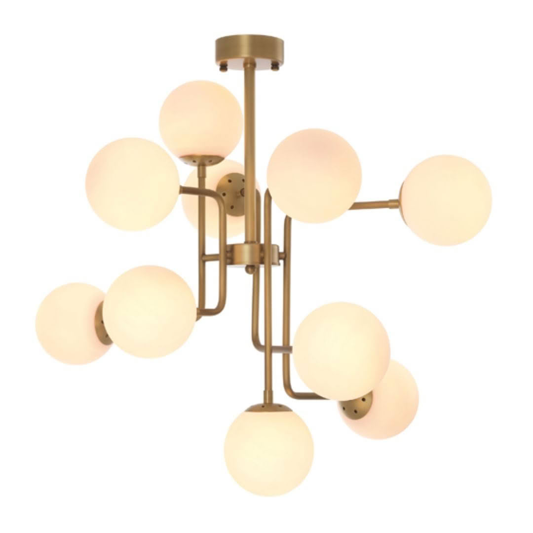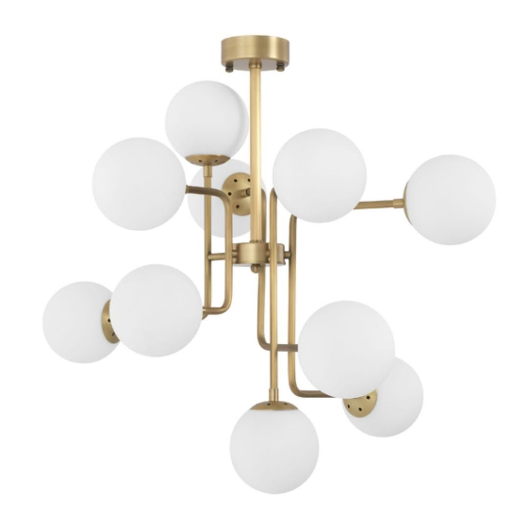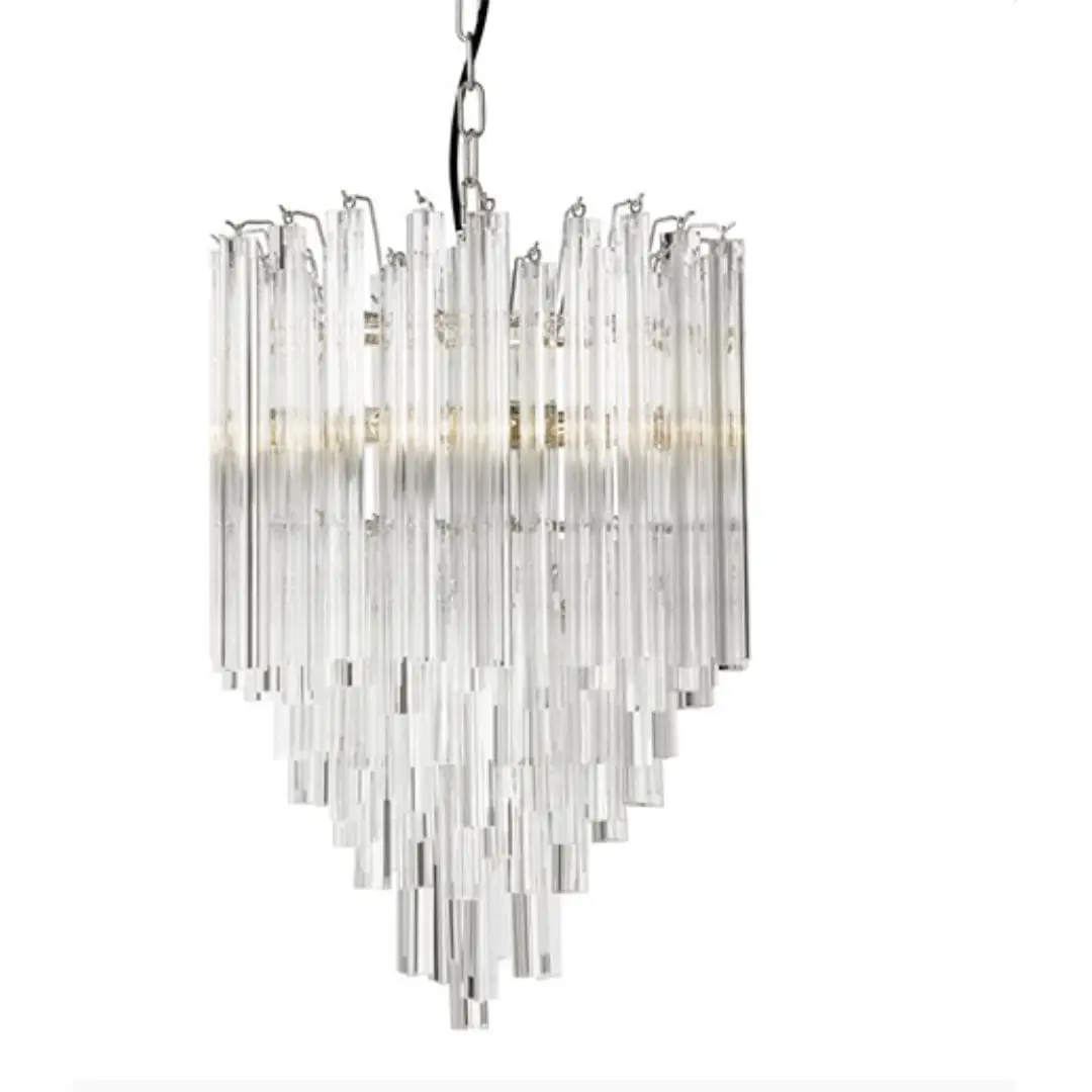 Elegant chandelier with multiple hanging translucent corn shapesElegant dining room with chandelier and round wooden table